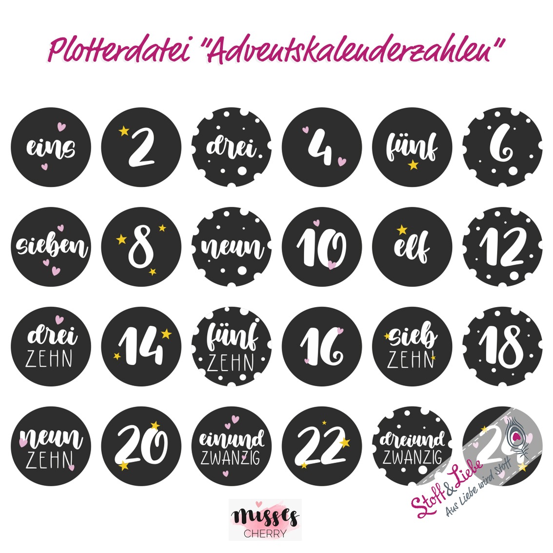 In dieser Datei enthalten sind die Zahlen 1-24 im unverkennbaren Misses Cherry Design. Sind sie nicht toll geworden? Wir sind total verliebt und sind der Meinung, dass diese Zahlen nicht nur im Advent zum Einsatz kommen können, oder? Wie wäre es zum Beispiel mit einer originellen Geburtstagsdeko?