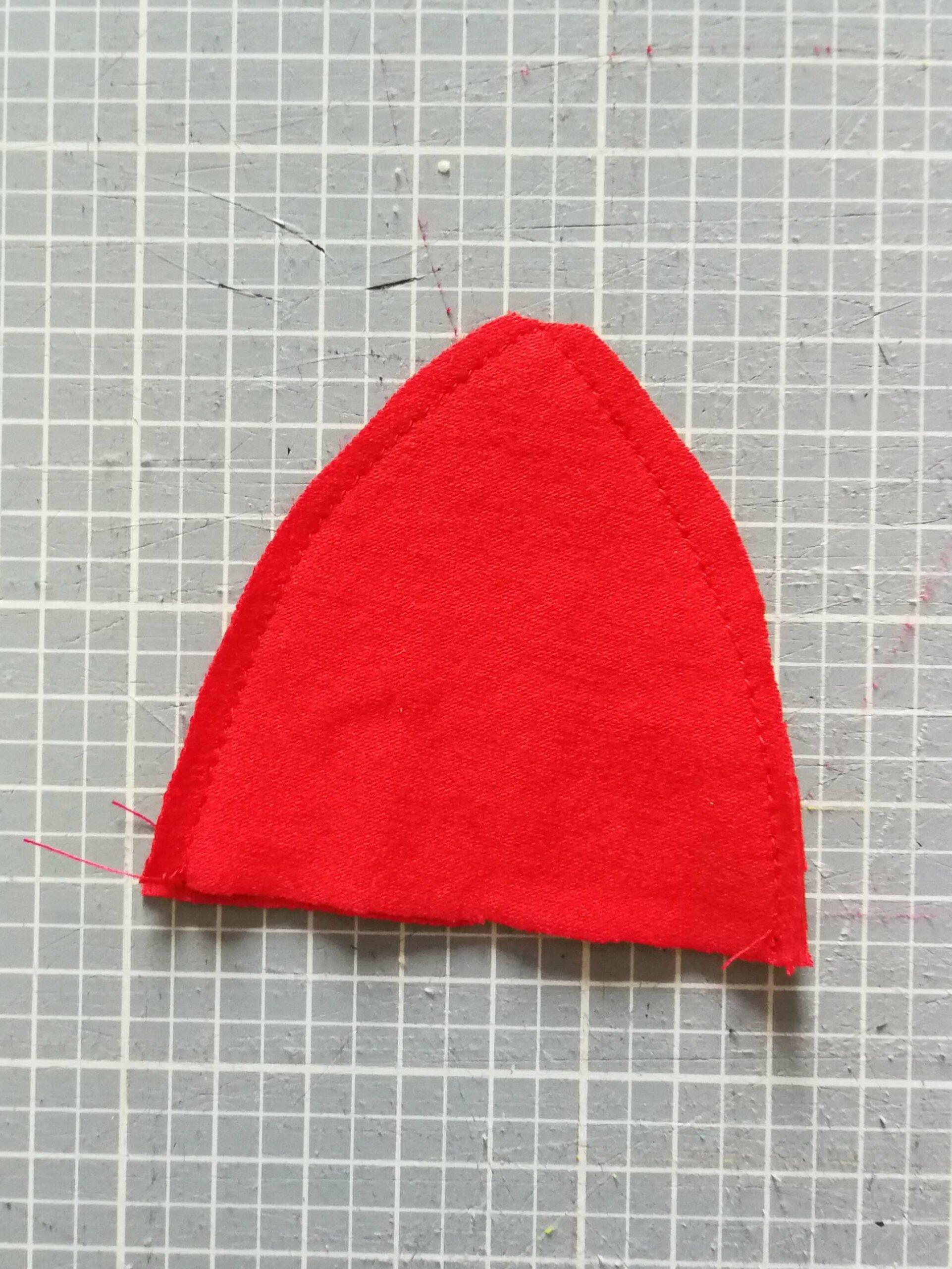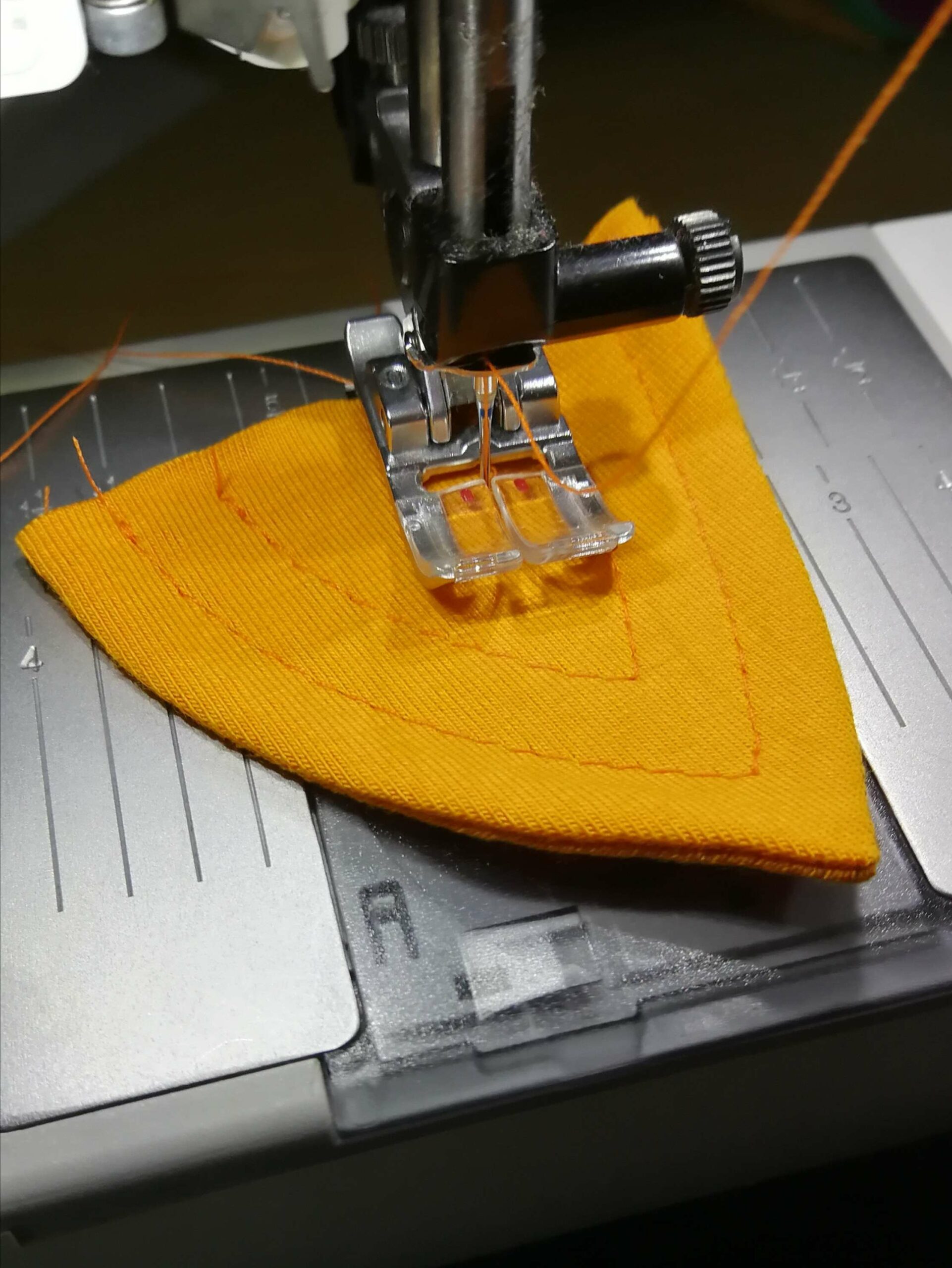 Legt die Zacken rechts auf rechts aufeinander und näht sie zusammen. Die untere Kante bleibt als Wendeöffnung offen. Kürzt die Nahtzugabe, wendet die Zacken und steppt sie ab. Ich habe jede Zacke mehrmals jeweils nähfußbreit abgesteppt, so bekommt sie etwas mehr Stand.