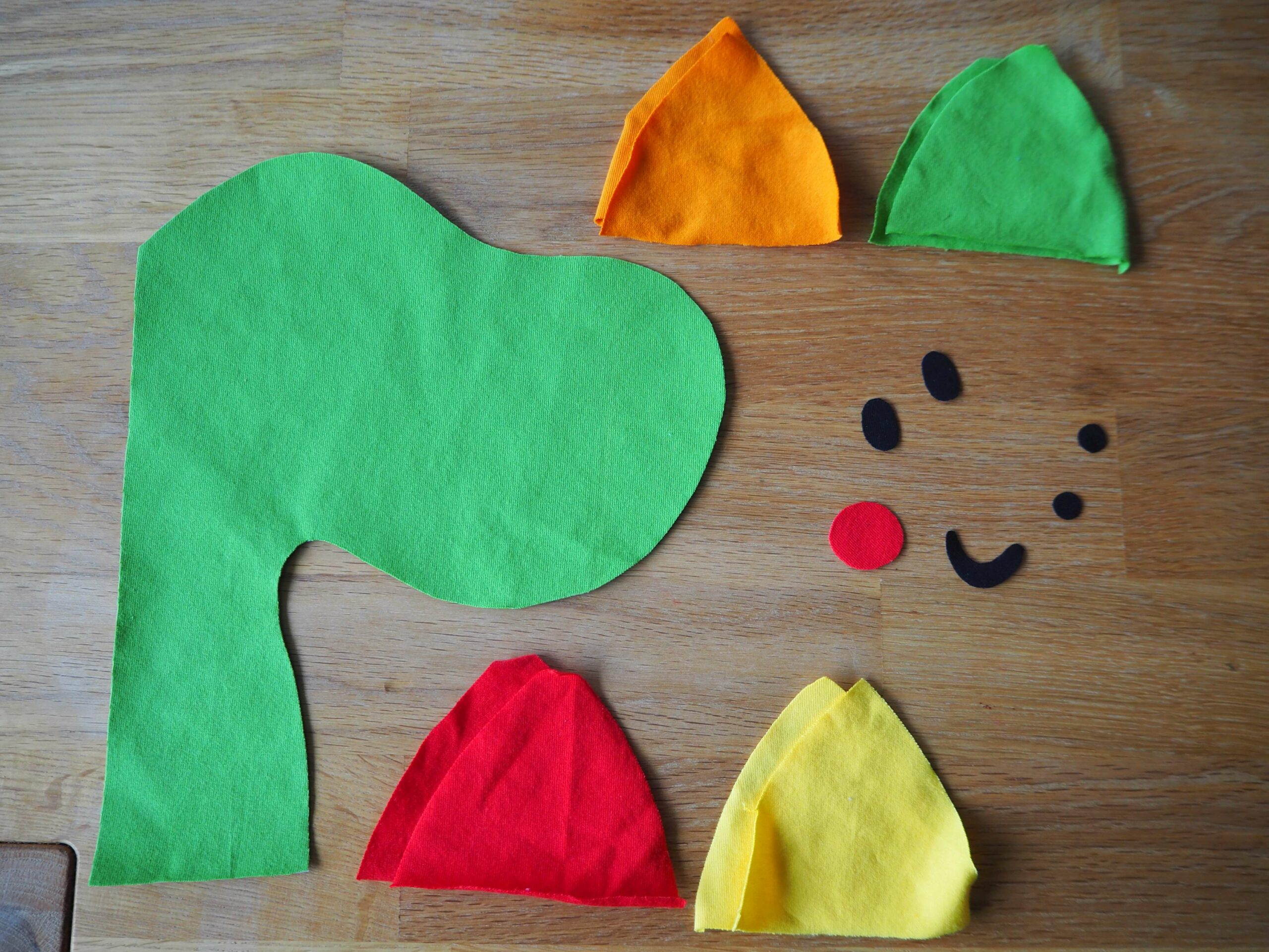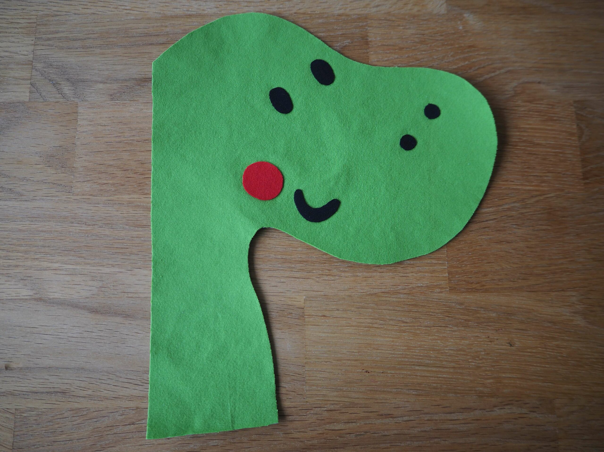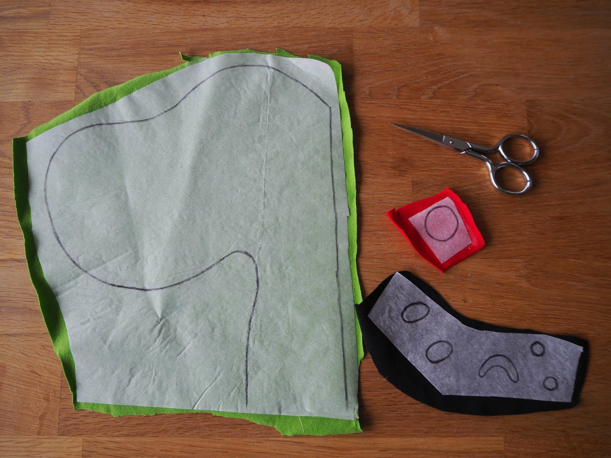 Paust zuerst alle Teile (außer den Zacken) auf die Papierseite vom Vliesofix ab (beim Gesicht bitte an der Seitenkante und je nach Projekt evtl. auch unten eine Nahtzugabe geben) und bügelt sie auf die linke Seite der jeweiligen Stoffe auf. Ich habe dafür Jersey verwendet, denn da franst nichts aus, so dass alles mit einfachem Geradstich aufgenäht werden kann.