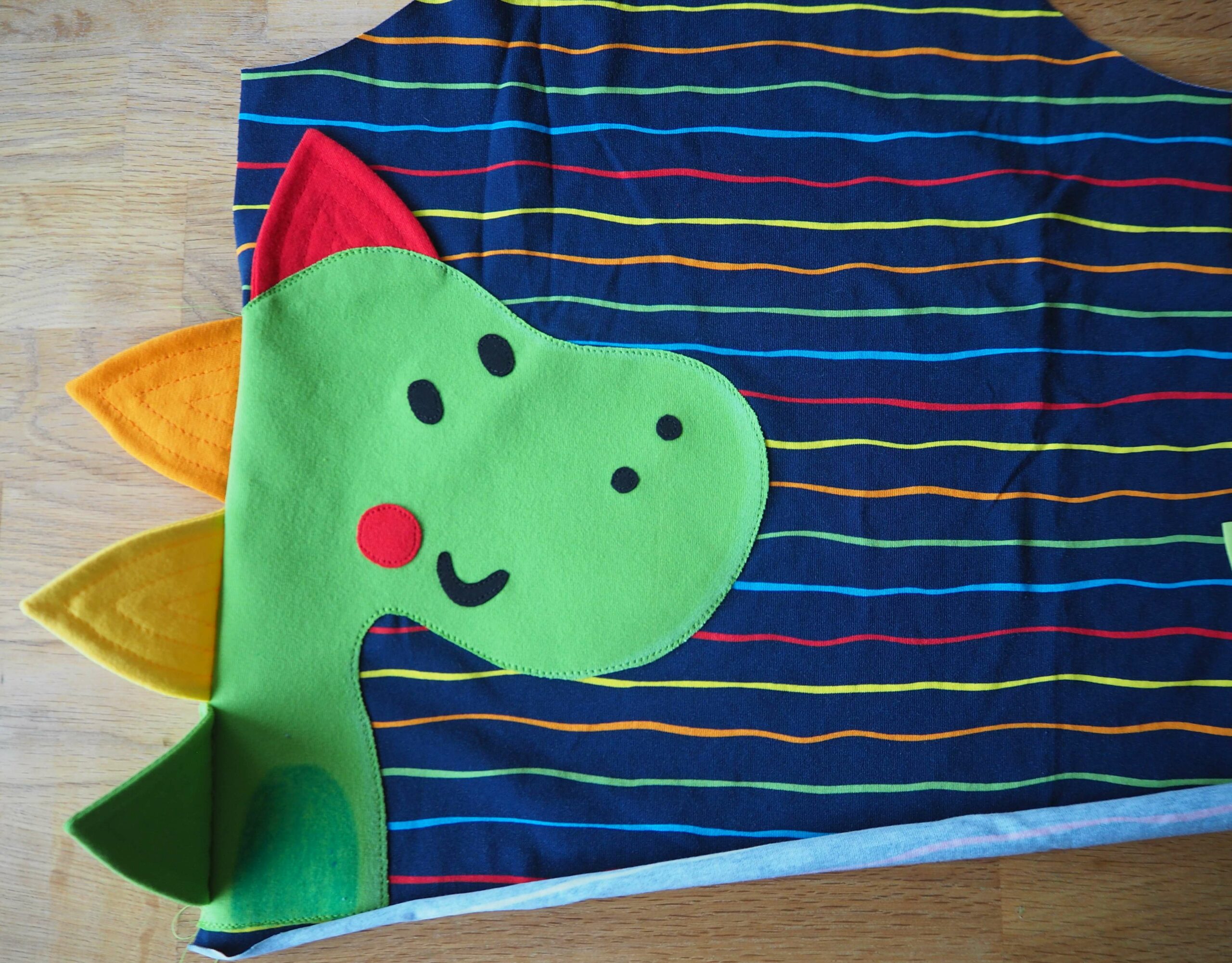 Bügele alles gut fest und nähe das Drachengesicht knappkantig fest.