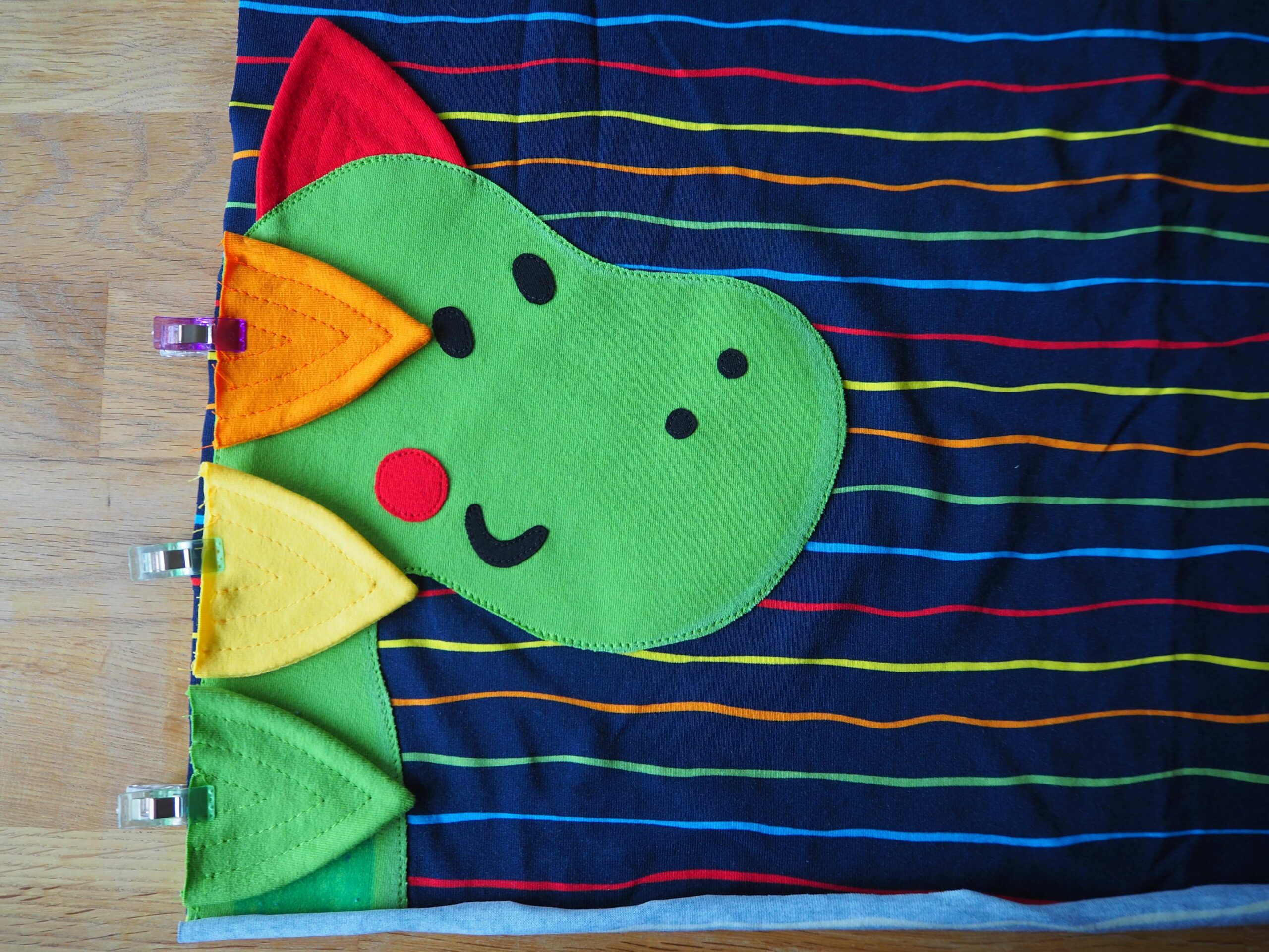 Zieht jetzt das Papier von der Rückseite des Drachengesichts ab und positioniere es auf dem Nähstück. Bevor das Gesicht gleich aufgebügelt wird, muss die erste Zacke oben am Kopf etwas unter den Rand geschoben werden, so dass sie beim Feststeppen mit angenäht wird. Achtet dabei darauf, dass nur der Rücken des Drachens in der späteren Seitennaht mit gefasst werden soll, die Zacke aber nicht.
