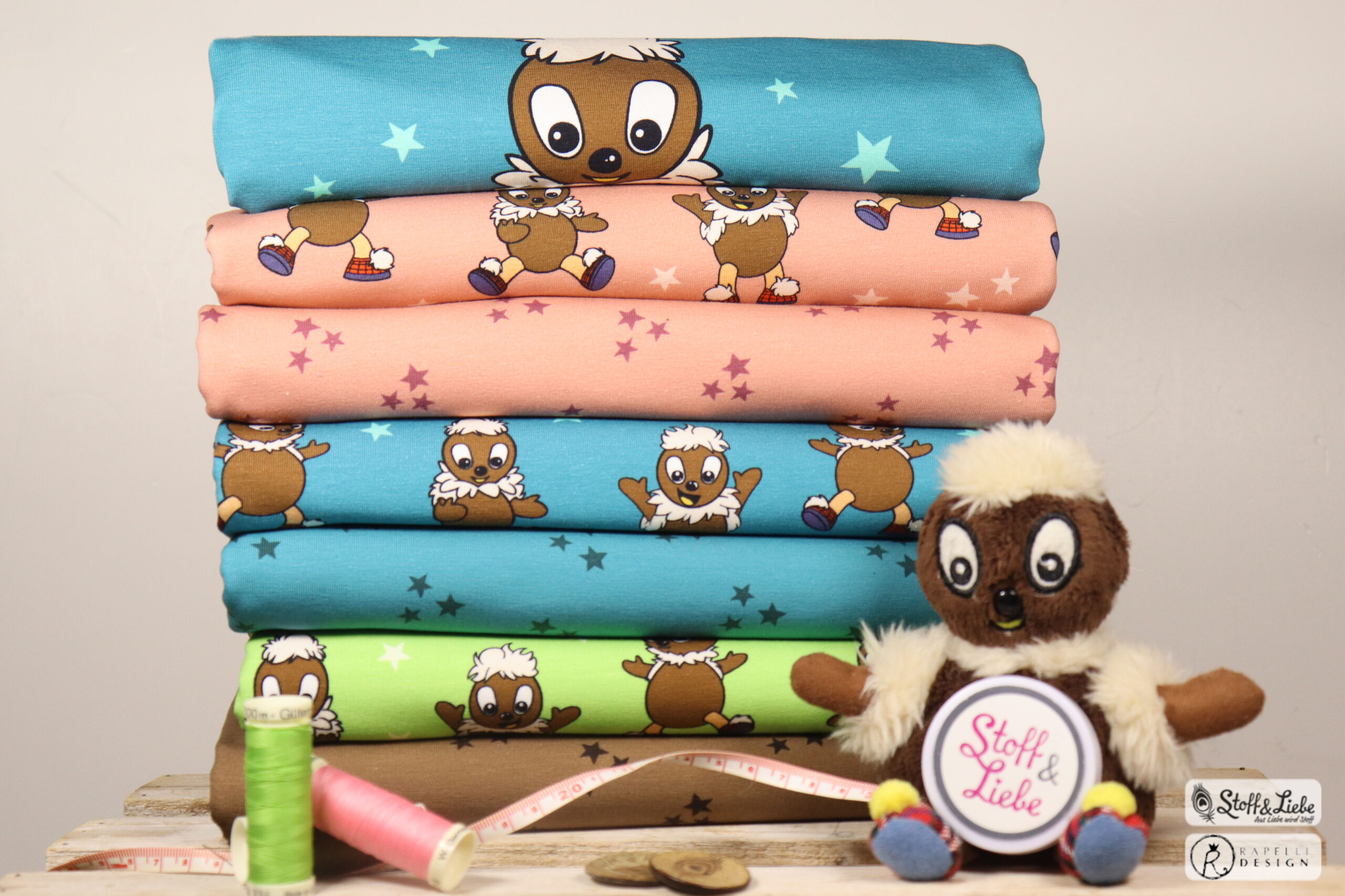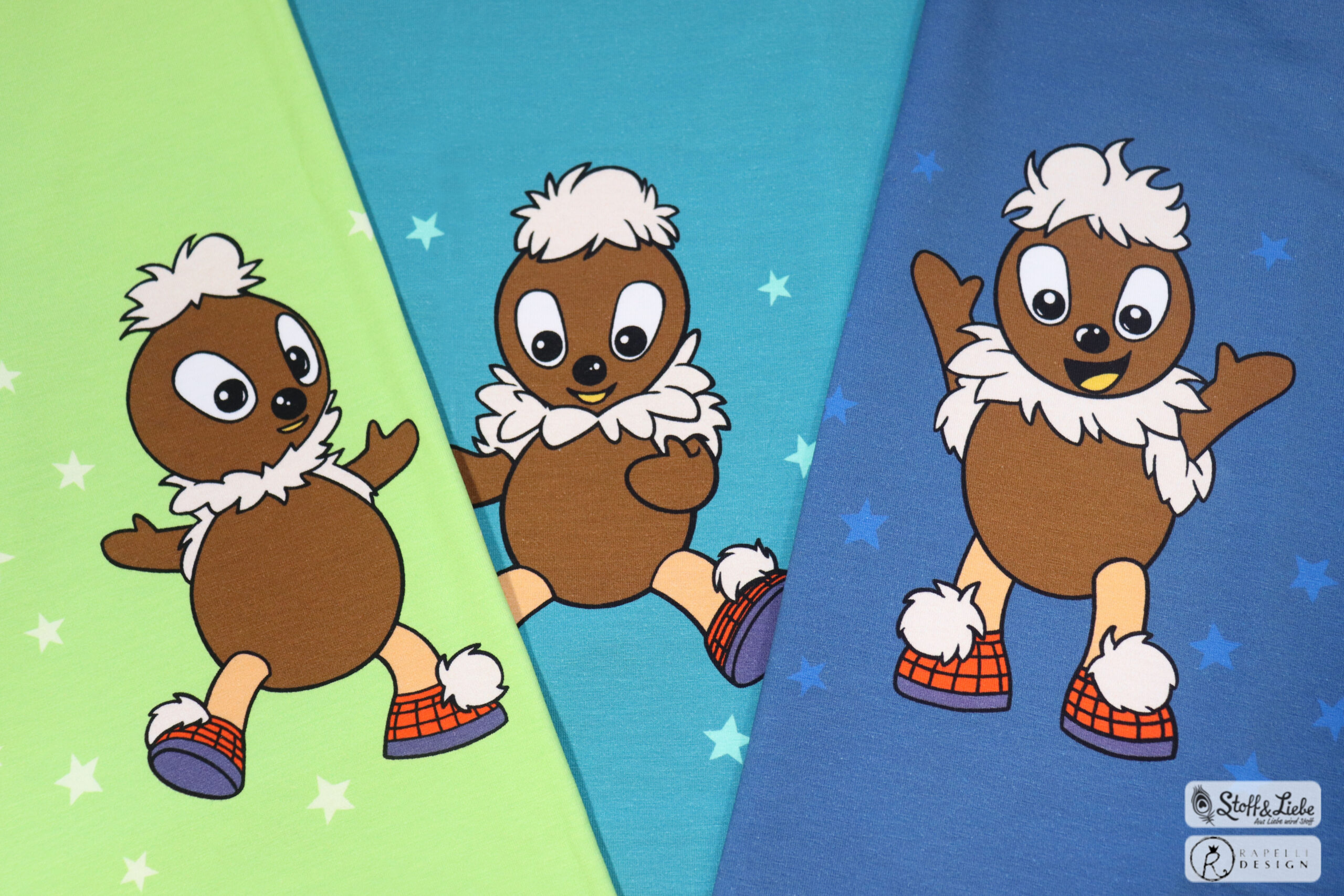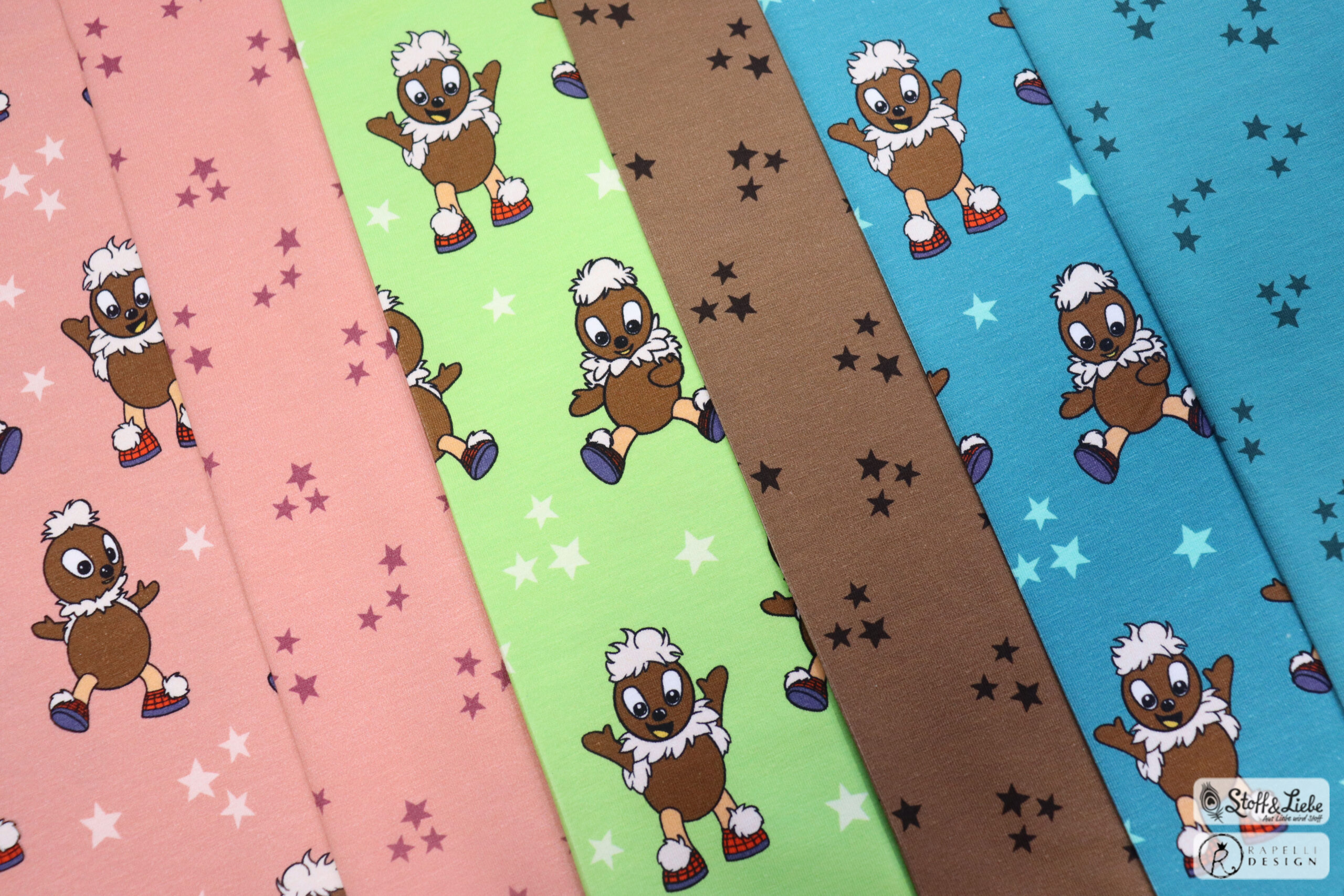 Das Pittiplatsch Panel bringt Euch drei Motive auf einer Höhe von ca. 60 cm mit. Ihr findet den süßen Pittiplatsch jeweils umrahmt von Sternen auf unifarbenen Hintergründen. Dadurch lassen sich die Panelteile vielfältig kombinieren. Entweder mit Unis aus unserer Pamuklinie oder auch den passenden Allover- und Kombistoffen, die wir Euch im Folgenden vorstellen.