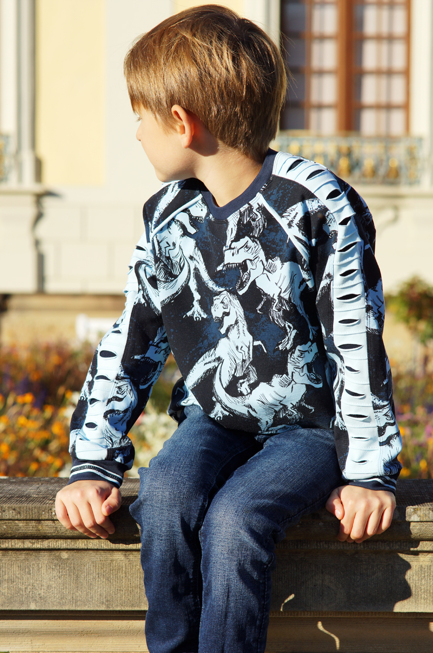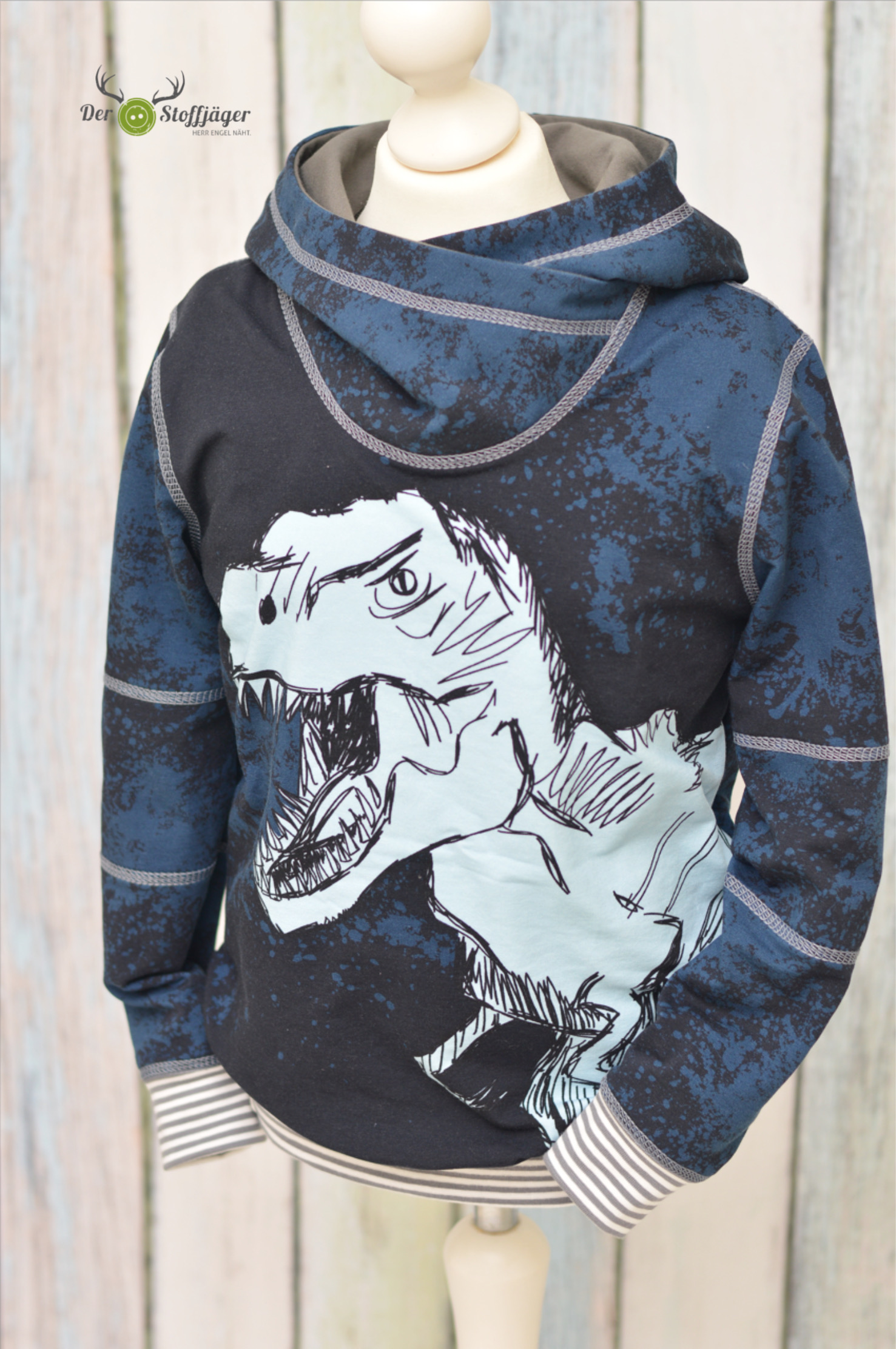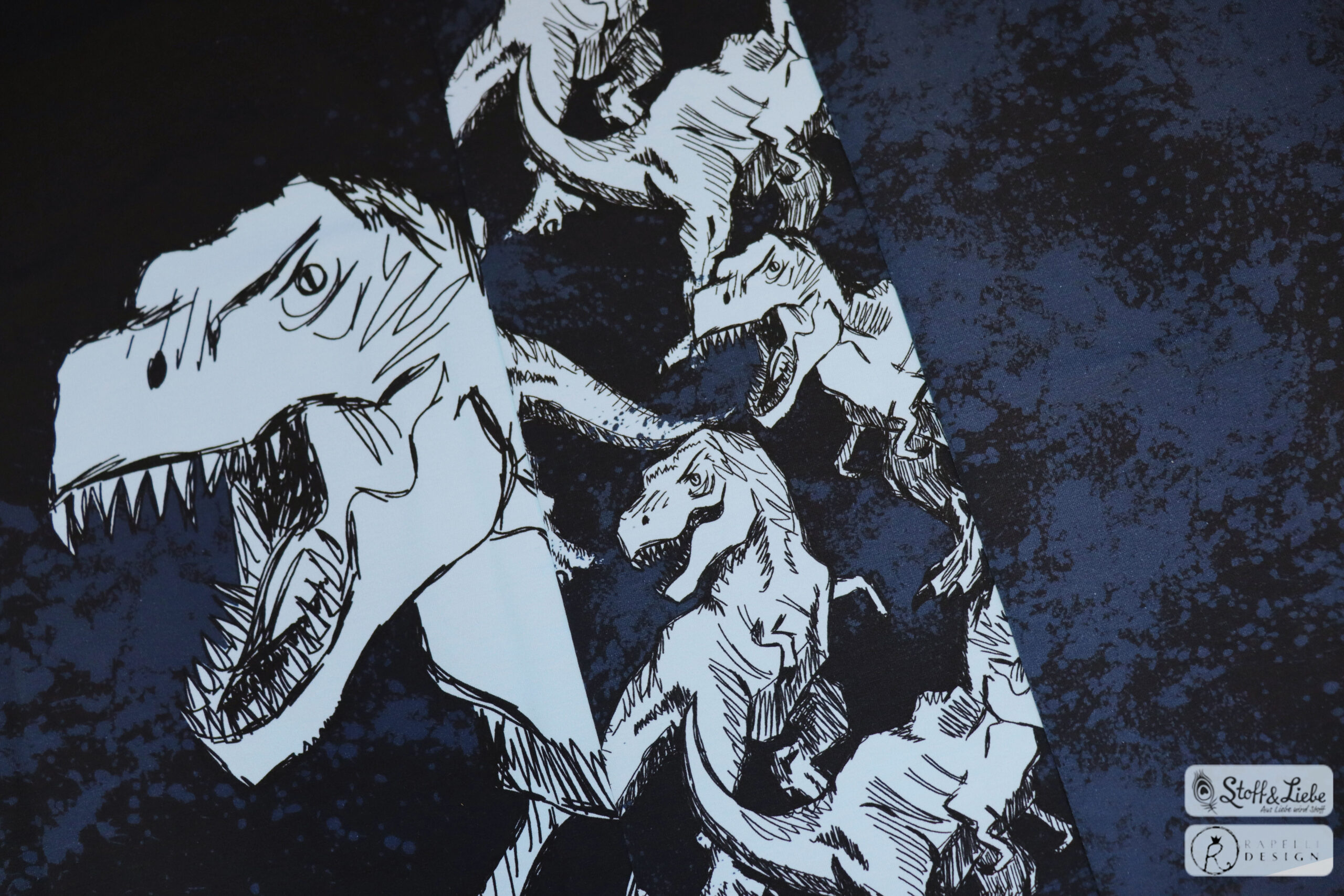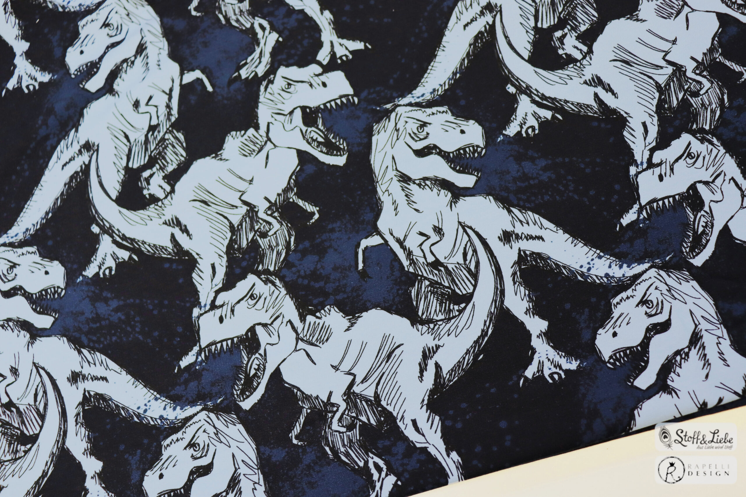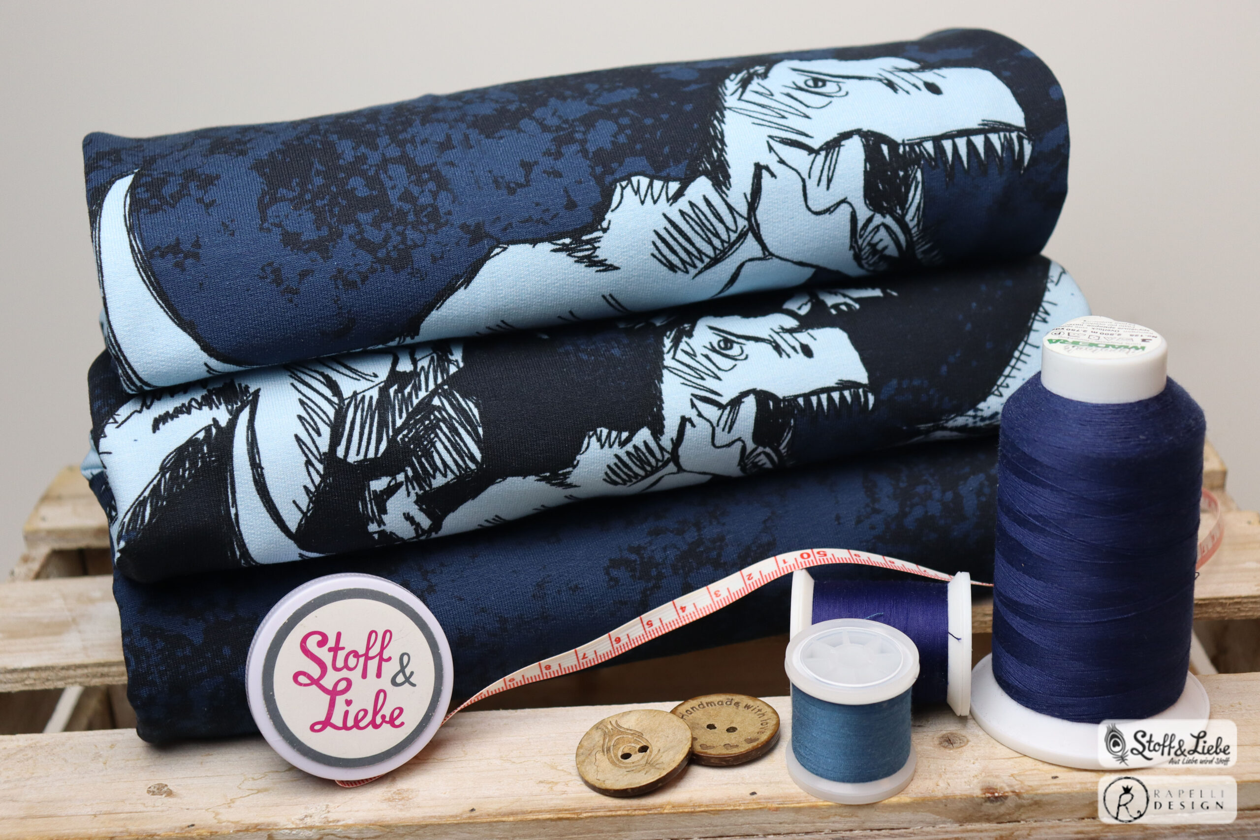Außerdem gehört zu dieser Kollektion ein Allover. Auch hier findet Ihr die Dinos, wie beim Panel in einem Hellblau auf dem Used-Look Untergrund. Der perfekte Stoff für alle Dinoliebhaber, die es etwas cooler mögen. Ob Ihr ihn zum Panel kombiniert oder solo vernäht, der Stoff ist in jedem Fall ein Hingucker und lässt sich genauso wie das Panel prima kombinieren. Egal ob lässig oder etwas schicker, lasst Eurer Kreativität freien Lauf und näht Eure neuen Lieblingsteile ganz in Eurem Stile.