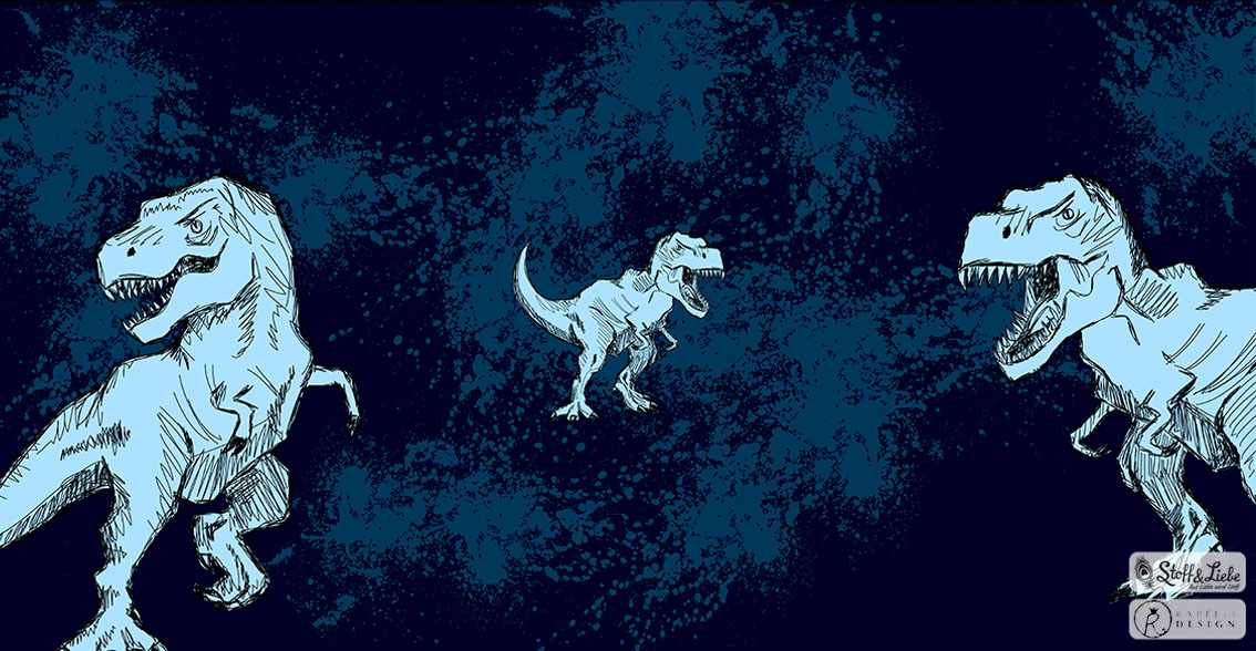 Das Mister T Panel bringt Euch drei Motive auf einer Höhe von ca. 76 cm mit. Ihr findet die coolen Dinosaurier in einem hellen Blau auf einem Used Look Hintergrund in Dunkelblau und Schwarzblau. Das Panel lässt sich nicht nur mit dem passenden Allover- und Kombistoff kombinieren, auch mit Unis aus unserer Pamuklinie, könnt Ihr hier nach Herzenslust arbeiten. Durch den dunklen Untergrund lassen sich prima Highlights in knalligen Farben setzen oder eben auch Ton in Ton arbeiten, ganz wie Ihr es lieber mögt.