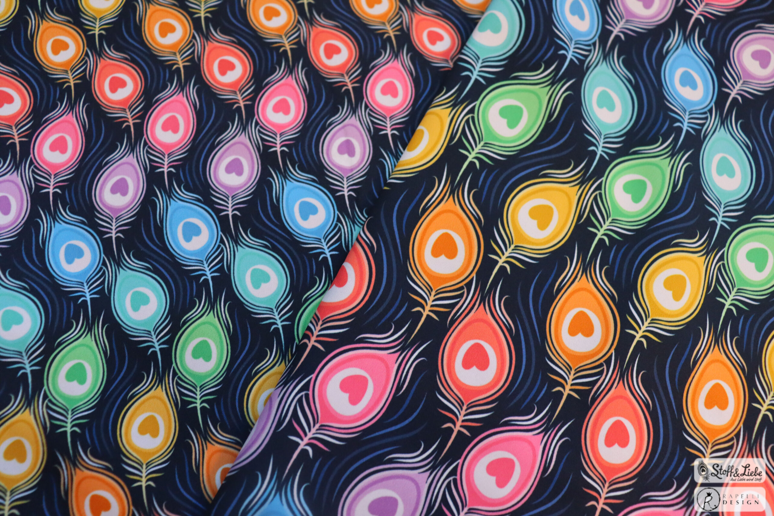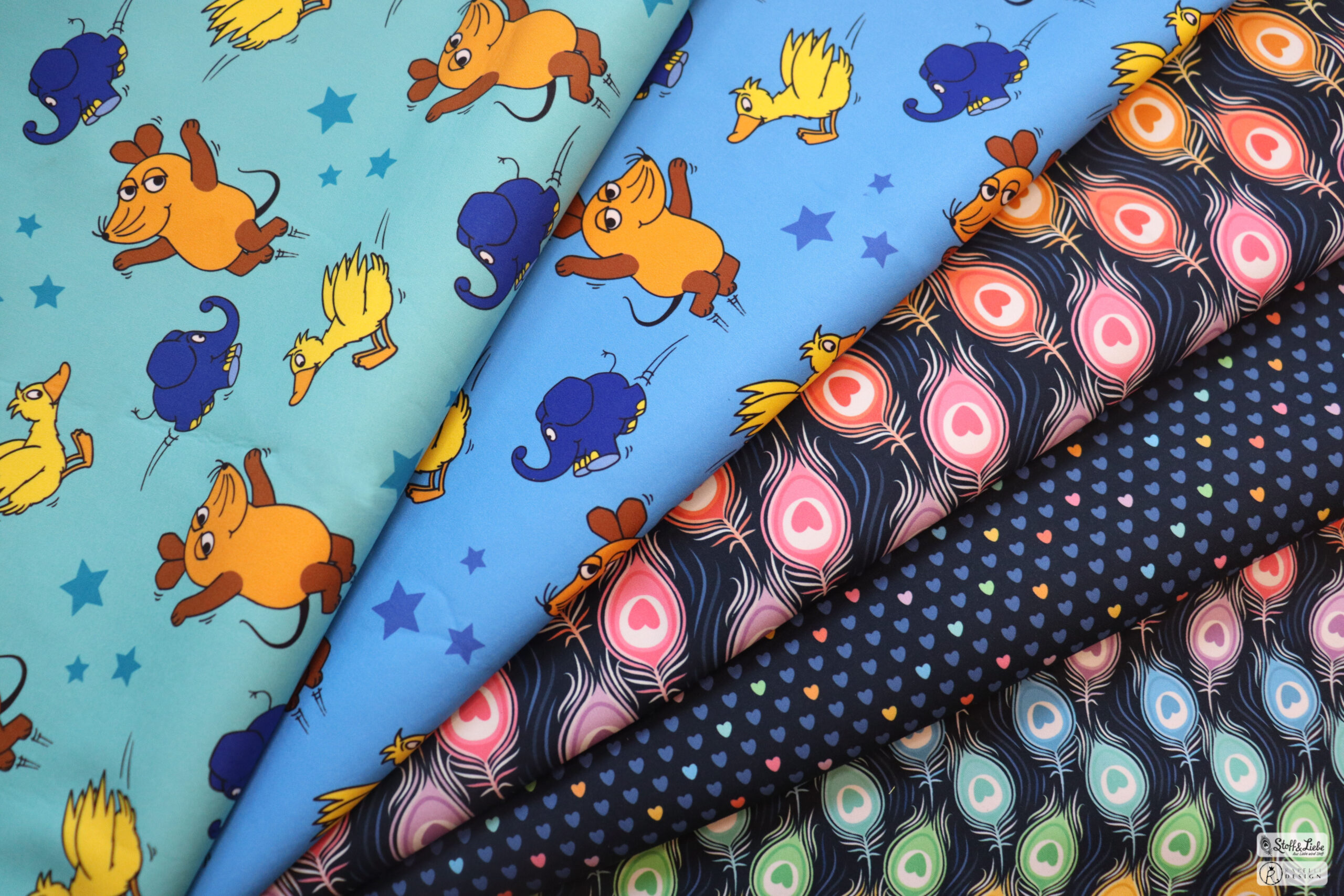 Der Frühling ist schon fast zu sehen und langsam können wir die dicken Wintersachen im Schrank lassen. Aber wahrscheinlich werden wir, bis der Frühling ganz da ist, noch mit dem ein oder anderen Regenschauer überrascht und deshalb wären für all die Tage zwischen Winter und Sonnenschein passende Stoffe doch prima, oder? Deshalb freuen wir uns sehr, Euch heute unsere ersten Stoffdesigns auf Softshell in dieser Saison präsentieren zu können. Es warten auf Euch Designs für Groß und Klein: „Pavo Rainbow“ und „Hier kommt die Maus“.