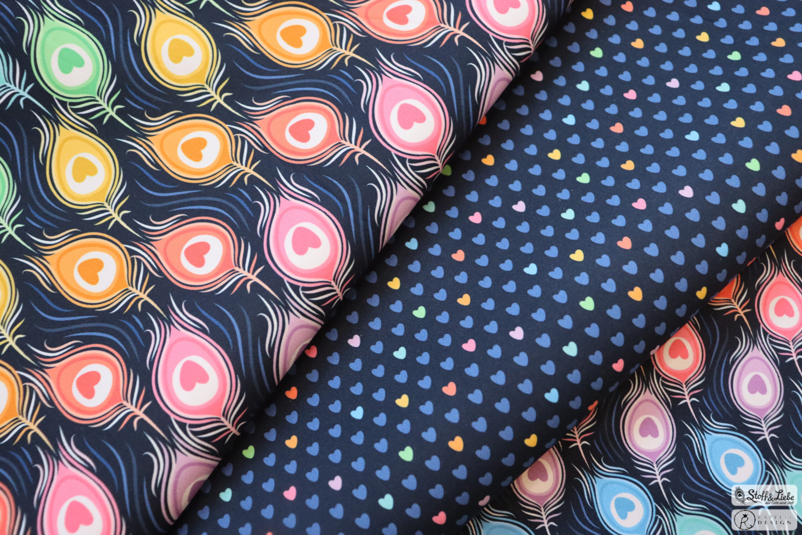 Wir haben für Euch Pavo Rainbow in zwei Größen ( ca. 8 und ca. 5,5 cm) sowie passende Herzen. Die Stoffe lassen sich kombiniert, genauso gut wie solo vernähen, außerdem bringt der wunderschöne Farbverlauf viele Möglichkeiten zum Kombinieren mit.