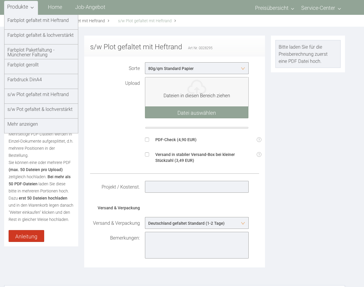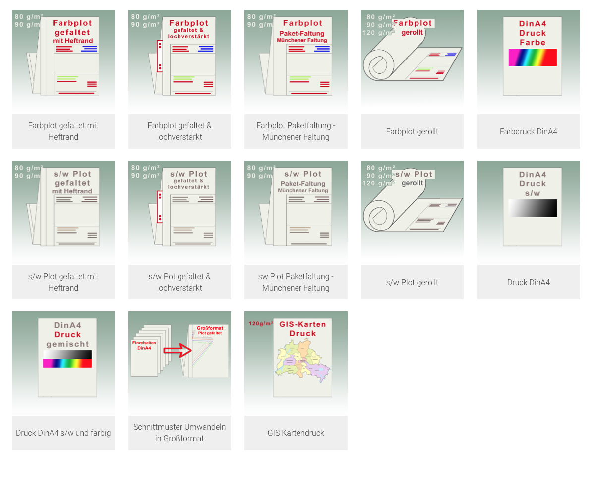 Bei „diePlotterei.de“ könnt Ihr unter anderem Baupläne, Cad-Zeichnungen, Repropläne, Modellbau-Pläne und was für uns vor allem interessant ist: Schnittmuster drucken lassen. Ihr könnt natürlich nicht nur A0 Dateien drucken, natürlich auch andere gängige Größen, das Ganze in Schwarz/Weiß oder Farbe. Im Folgenden seht Ihr eine Übersicht der Produkte, zwischen denen Ihr wählen könnt: