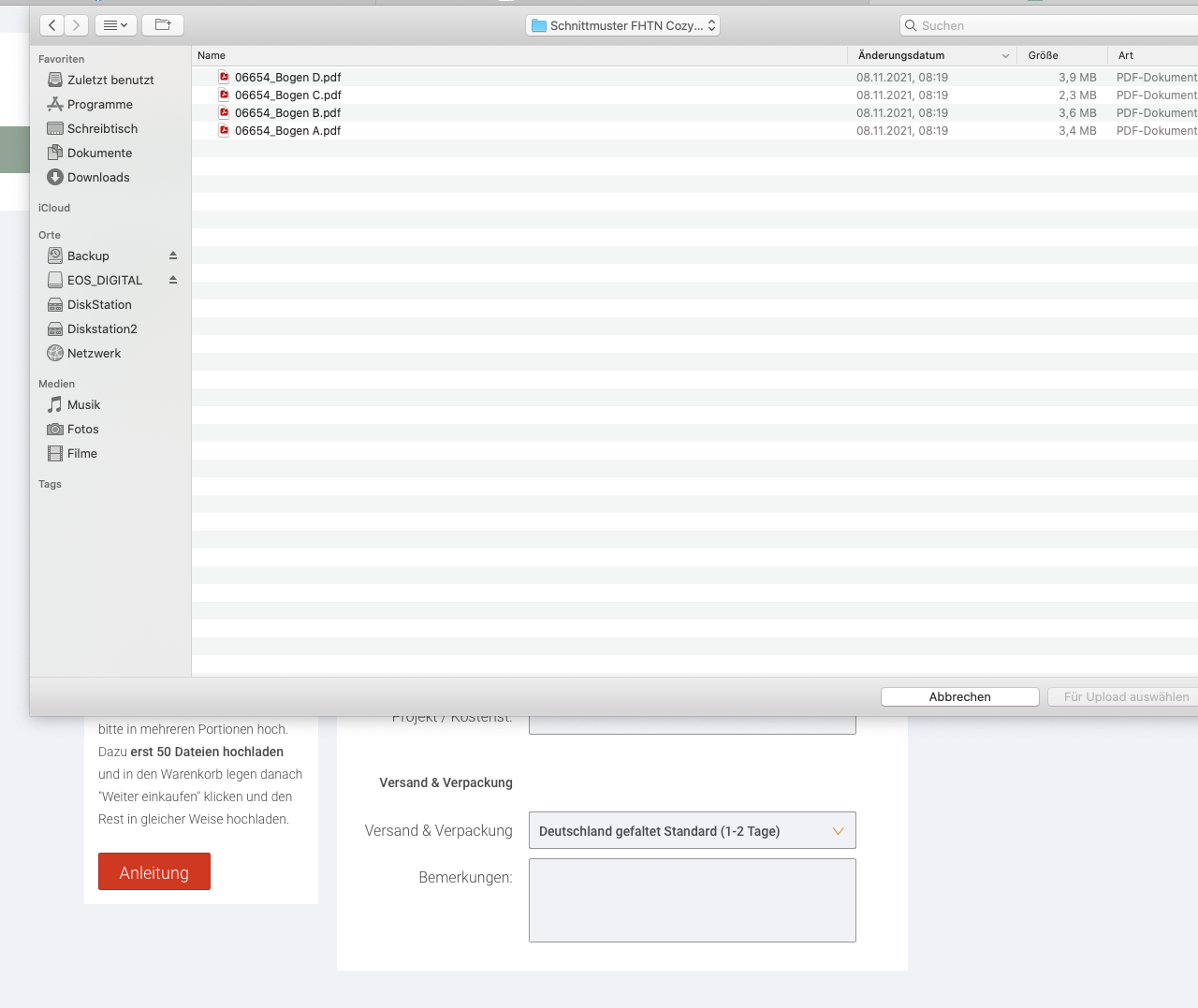 Nachdem Ihr auf der Startseite (wie oben gezeigt) oder über die Produktauswahl Eure Wahl getroffen habt (wir haben uns für s/w Plott gefaltet mit Heftrand und einer Stärke von 80g/qm auf Standardpapier entschieden), klickt Ihr auf „Datei auswählen“. Hier könnt Ihr nun auf Eure Ordner zugreifen und auswählen welche Schnittmuster Ihr hochladen möchtet.