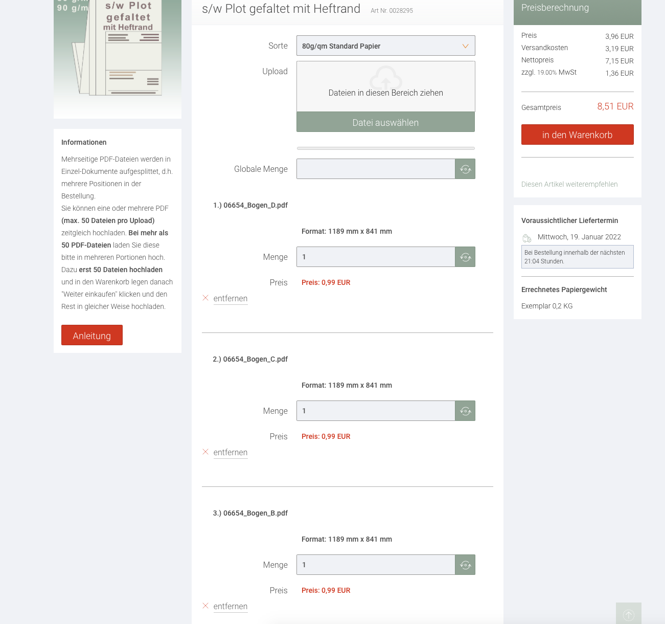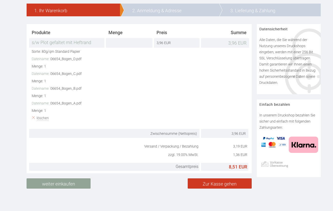 So ladet Ihr jetzt alle Dateien hoch, die Ihr drucken lassen wollt. Wie oben erwähnt, habt Ihr dabei Eure Kosten immer im Blick. Einmal, unter den hochgeladen Dateien und einmal in der rechten Seitenleiste unter dem Punkt Preisberechnung. Hier klickt Ihr auf „in den Warenkorb“, wenn Ihr alle Dateien hochgeladen habt. Nun kommt Ihr auf die nächste Seite, wie Ihr auf dem rechten Bild seht.