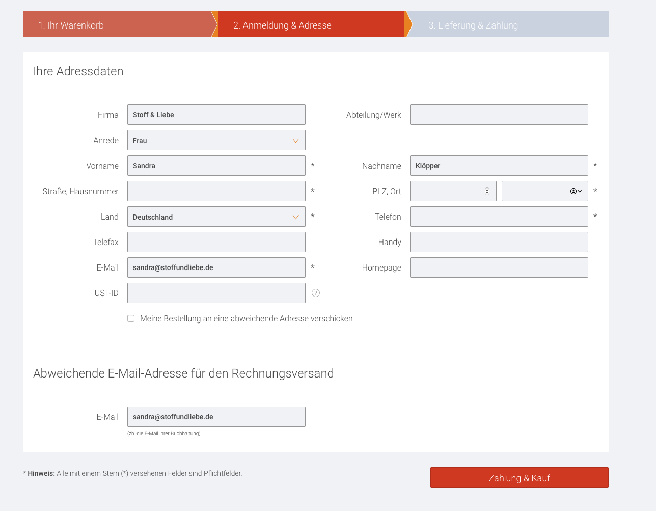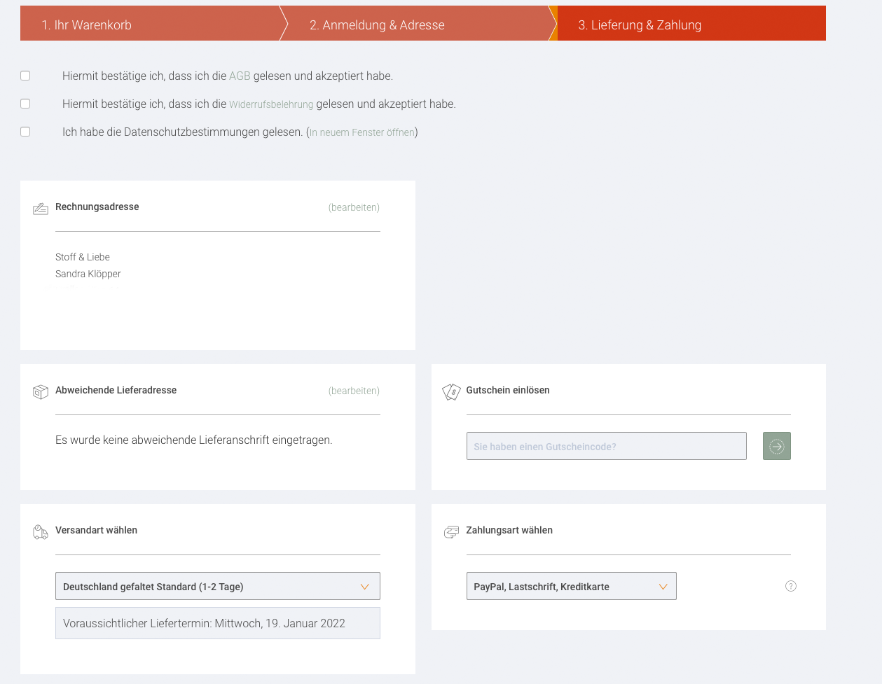 Hier gebt Ihr Eure Kontakt- und Versanddaten ein bzw. wenn Ihr Euch schon ein Kundenkonto angelegt habt, werden Eure Daten angezeigt. Danach geht es weiter mit „Zahlung & Kauf“. Hier könnt Ihr Eure Versand- und Zahlungsart wählen, eine abweichende Lieferadresse eingeben oder einen Gutschein Code einlösen.