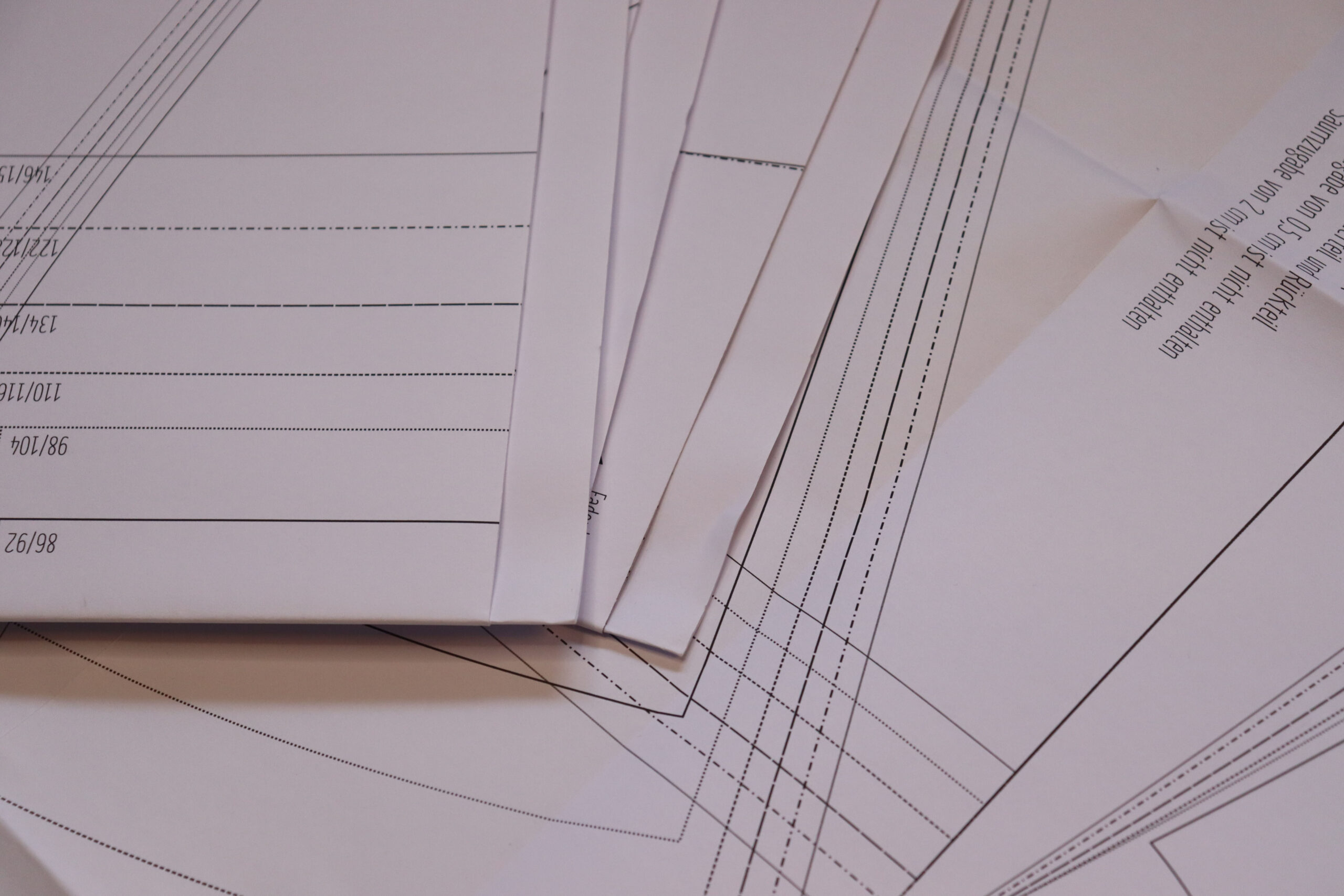 Nachdem unsere Ausdrucke angekommen sind, haben wir uns sofort an die Arbeit gemacht. Übrigens ging die Lieferung wirklich wahnsinnig schnell. Wir haben am Dienstag Nachmittag bestellt und bereits am Mittwoch Mittag unsere Plotts in der Post gehabt. Turbo, oder? Und das war nicht nur bei unserer ersten Bestellung so, mittlerweile haben wir schon ein paar Mal öfter verschiedene Schnittmuster bestellt. Die „längste“ Wartezeit waren 2 Tage und das Warten lohnt sich einfach.
