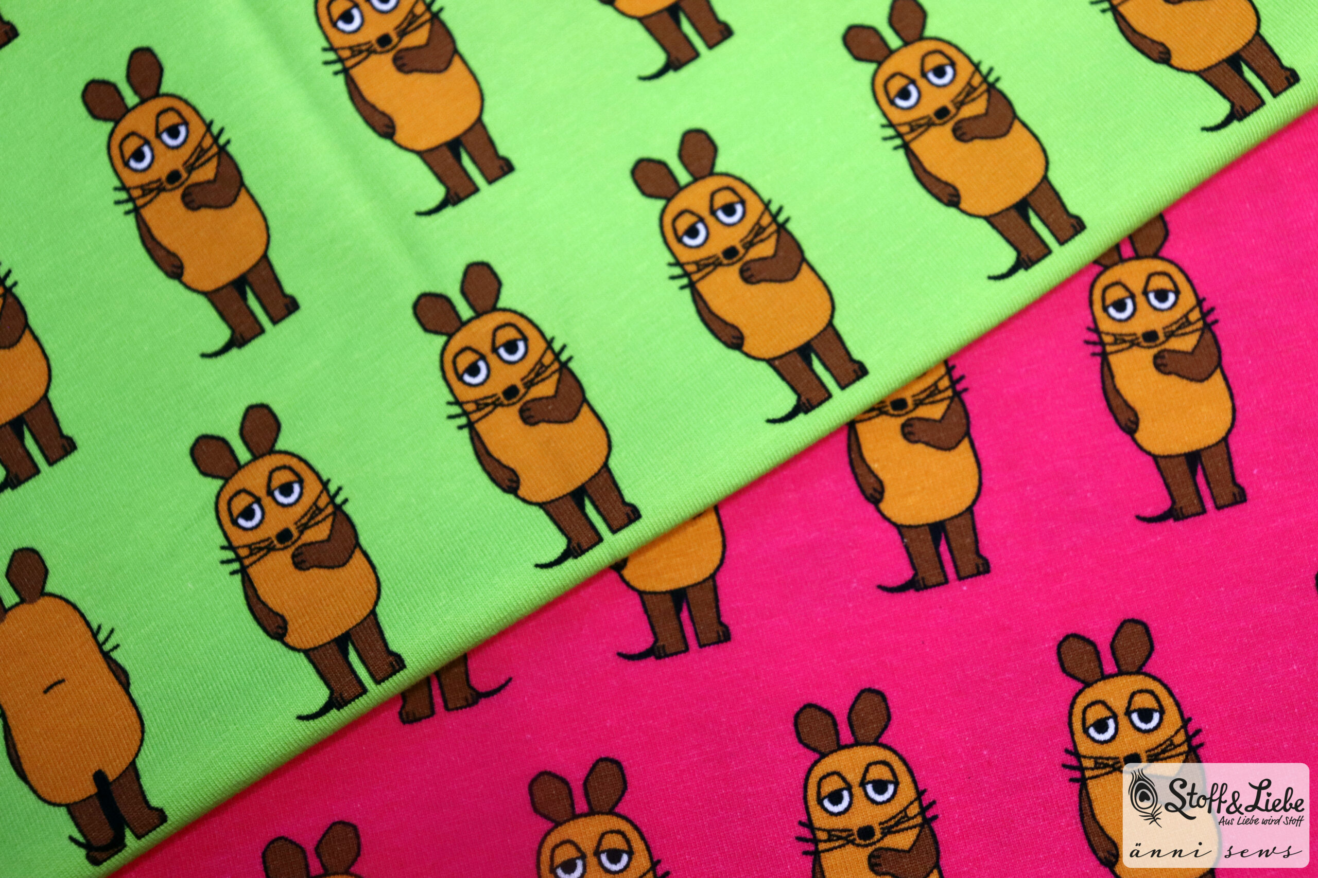 Ihr kennt unseren niedlichen „Die Maus Vorne – Hinten“ Allover ja schon aus dem letzten Jahr. Damals gab es ihn auf Jersey und French Terry. In dieser Woche haben wir ihn nun in zwei neuen Farben für Euch: Pink und Hellgrün.