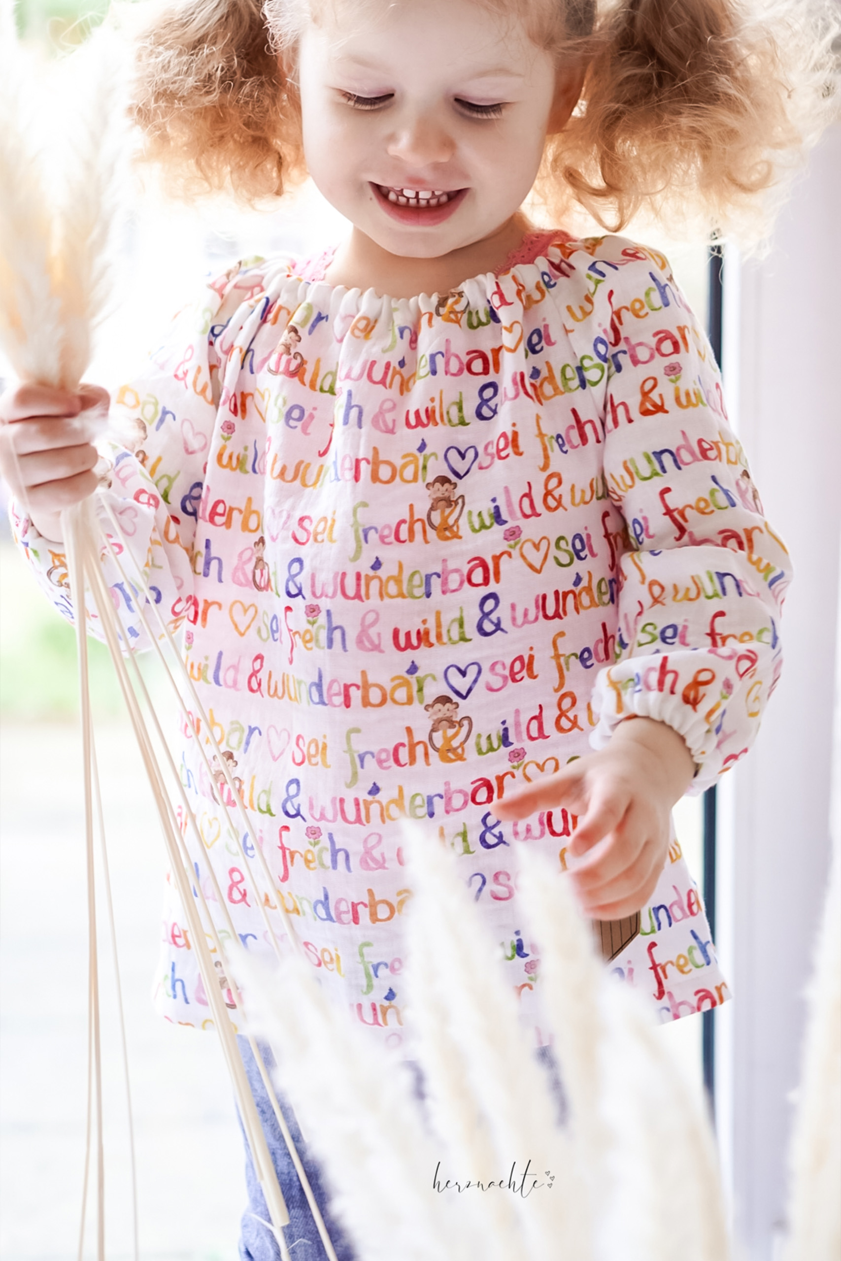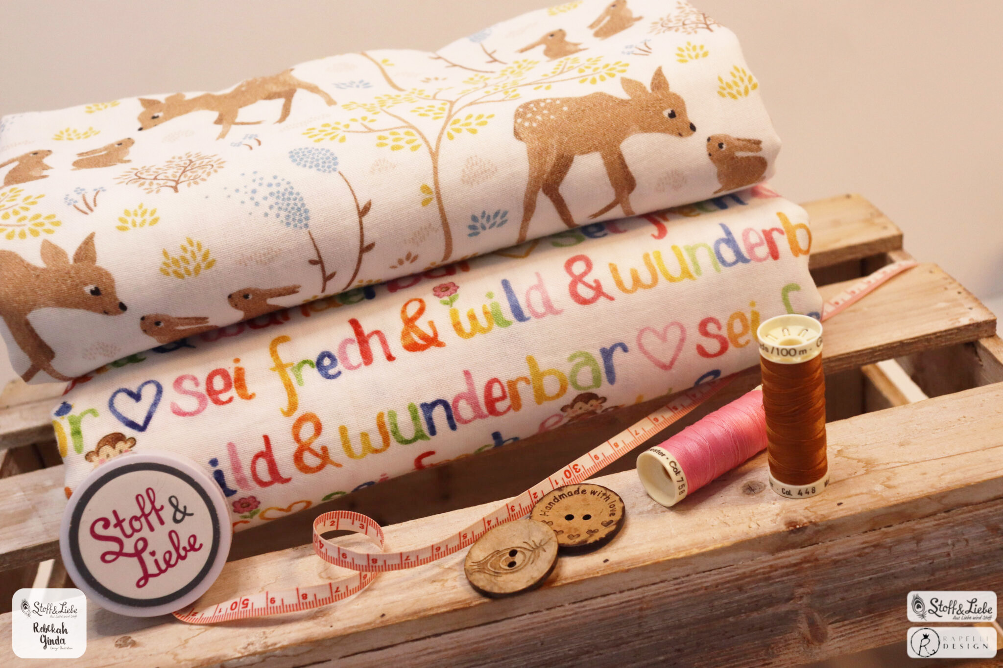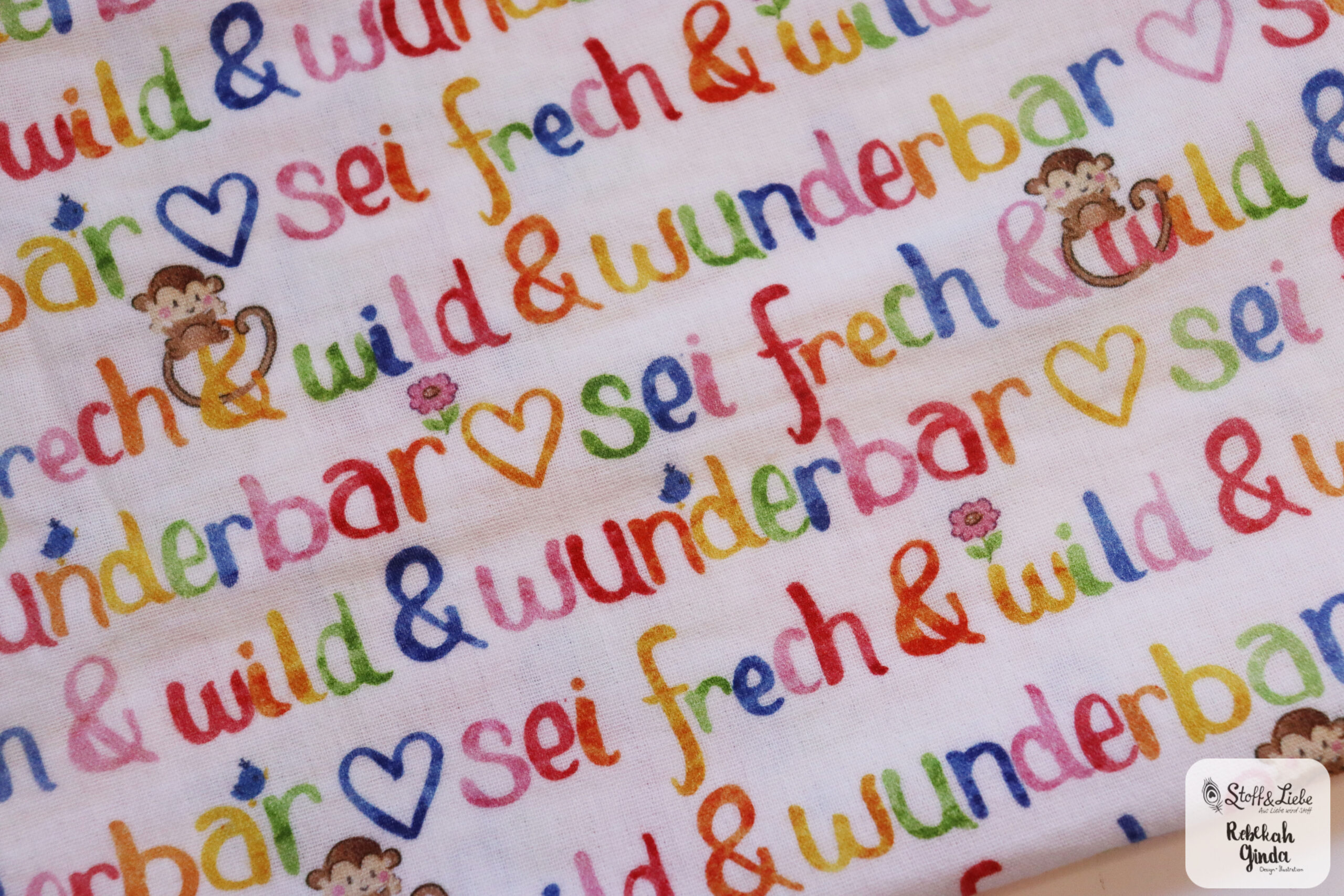 Und jetzt kommen wir zu dem zweiten Design auf Musselin „Sei frech & wild“ aus der Feder von Rebekah Ginda. Dieses Design habt Ihr und natürlich auch wir, sehr ins Herz geschlossen. Uns scheint, als ob Ihr gar nicht genug davon bekommen könnt. Wir hatten dieses Design bereits auf Jersey, French Terry, Canvas, Softshell und Lycra. Es stand außer Frage, Sei frech & wild & wunderbar auf Musselin ist ein absolutes Muss!