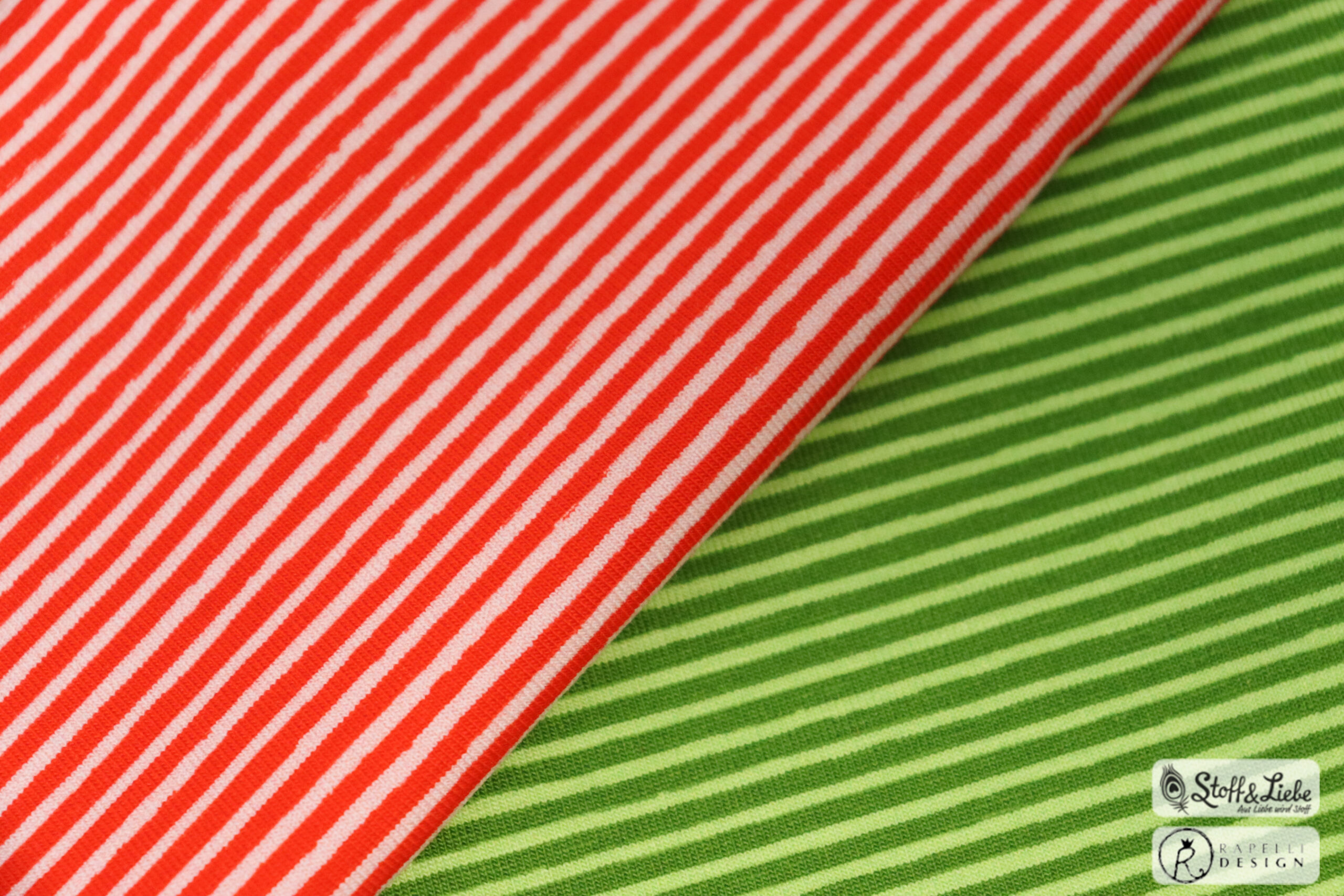 Was darf als Kombistoff nicht fehlen? Ganz genau: Ringelies! Vielleicht sind wir ein bisschen süchtig nach diesen tollen Streifen, aber sie sind einfach so toll einzusetzen und das für Groß und Klein. Diesmal haben wir sie für Euch in zwei Farben Rot und Grün.