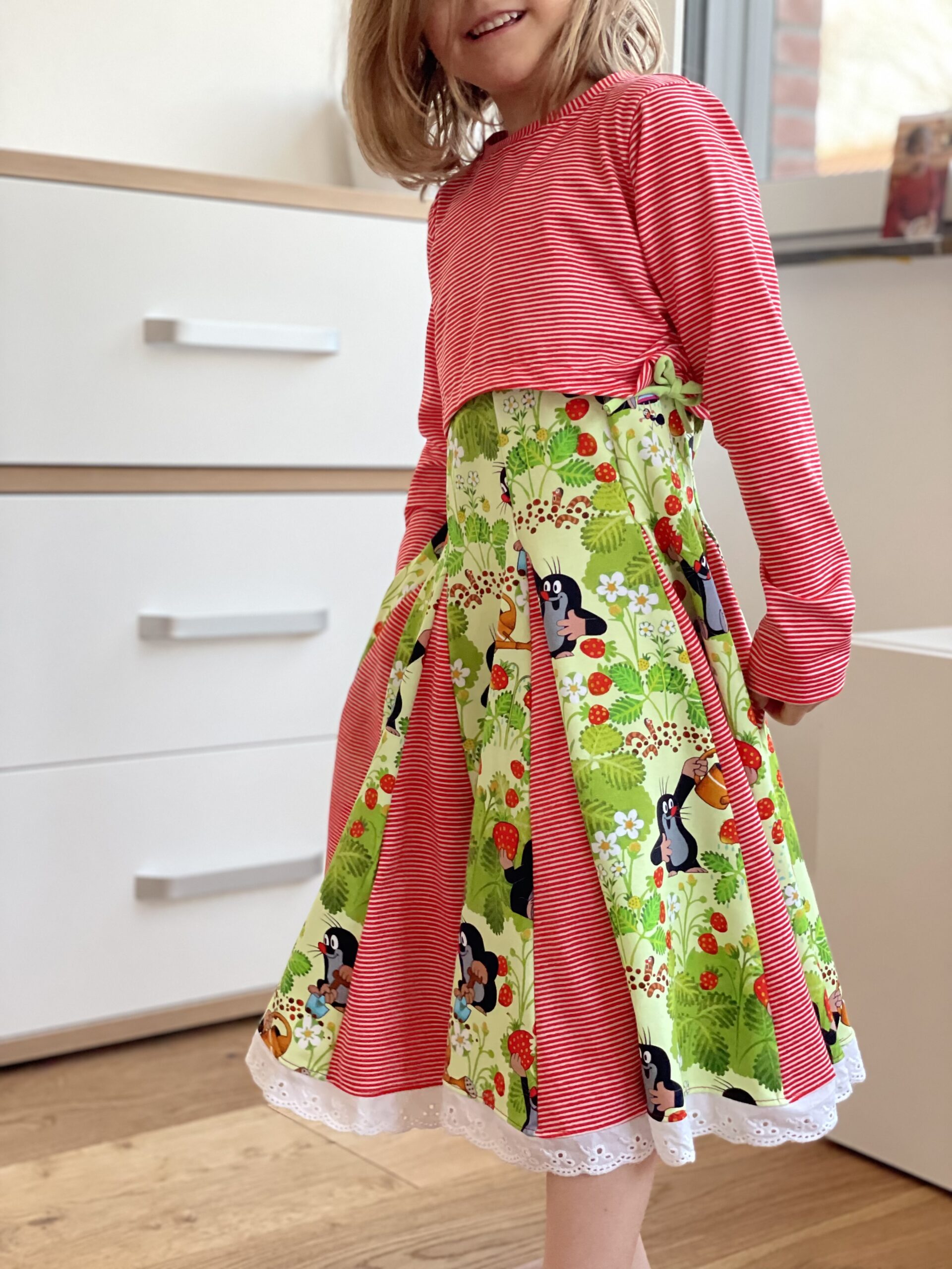 ich wollte auch noch gerne wissen, welches Schnittmuster das Kleid aus der vorletzten Bilderreihe ist (Drehkleid mit den roten Dreiecken)?
