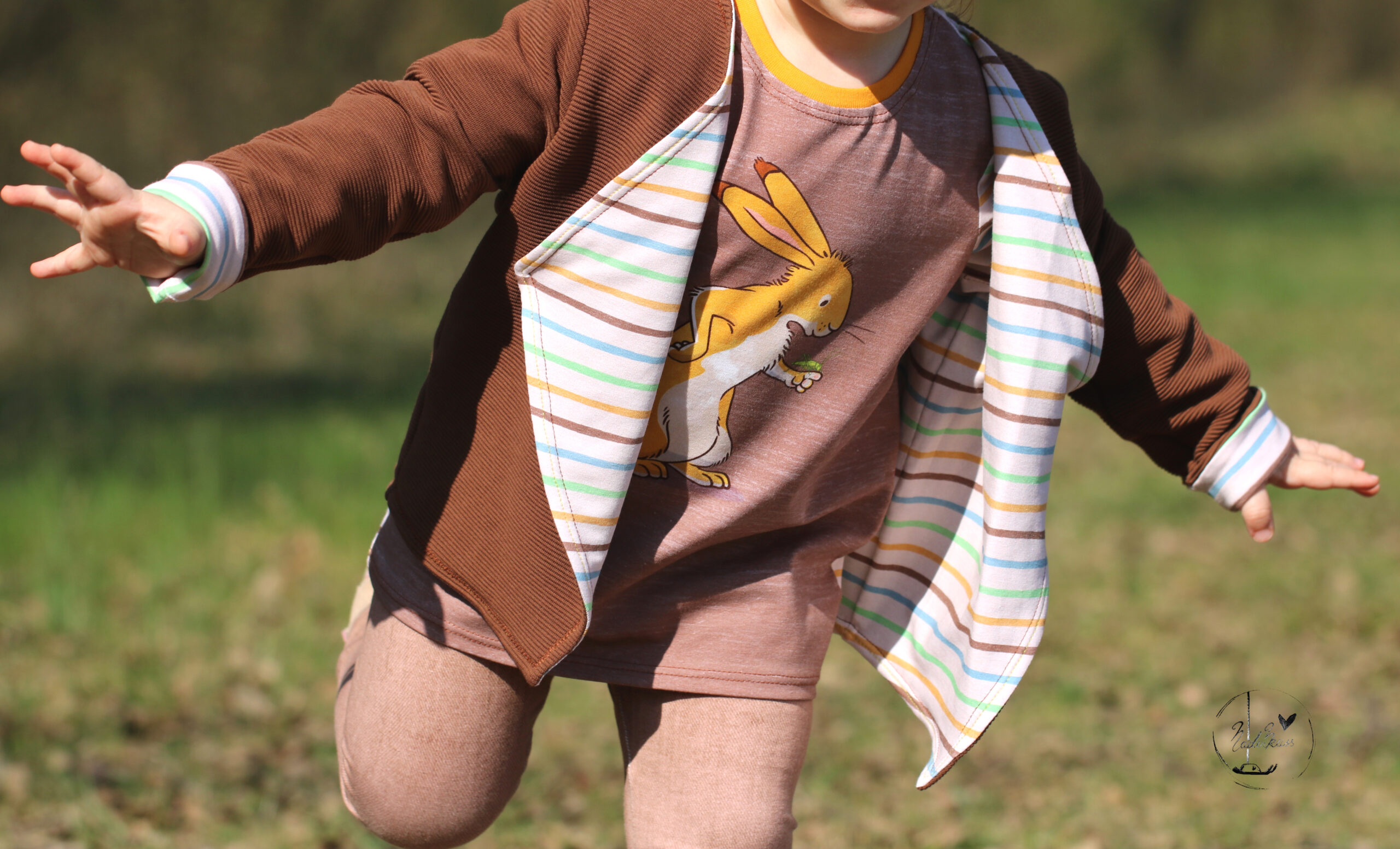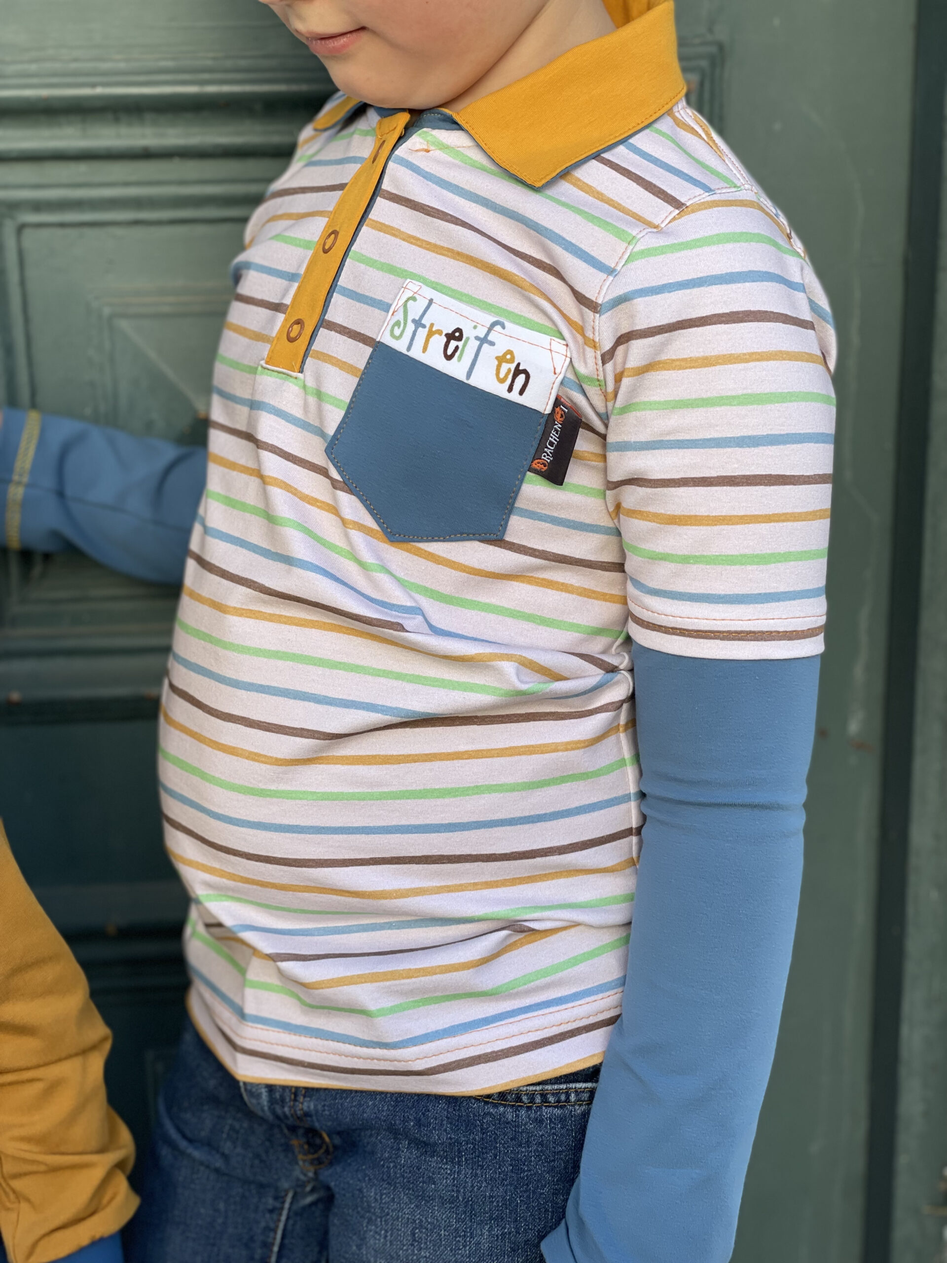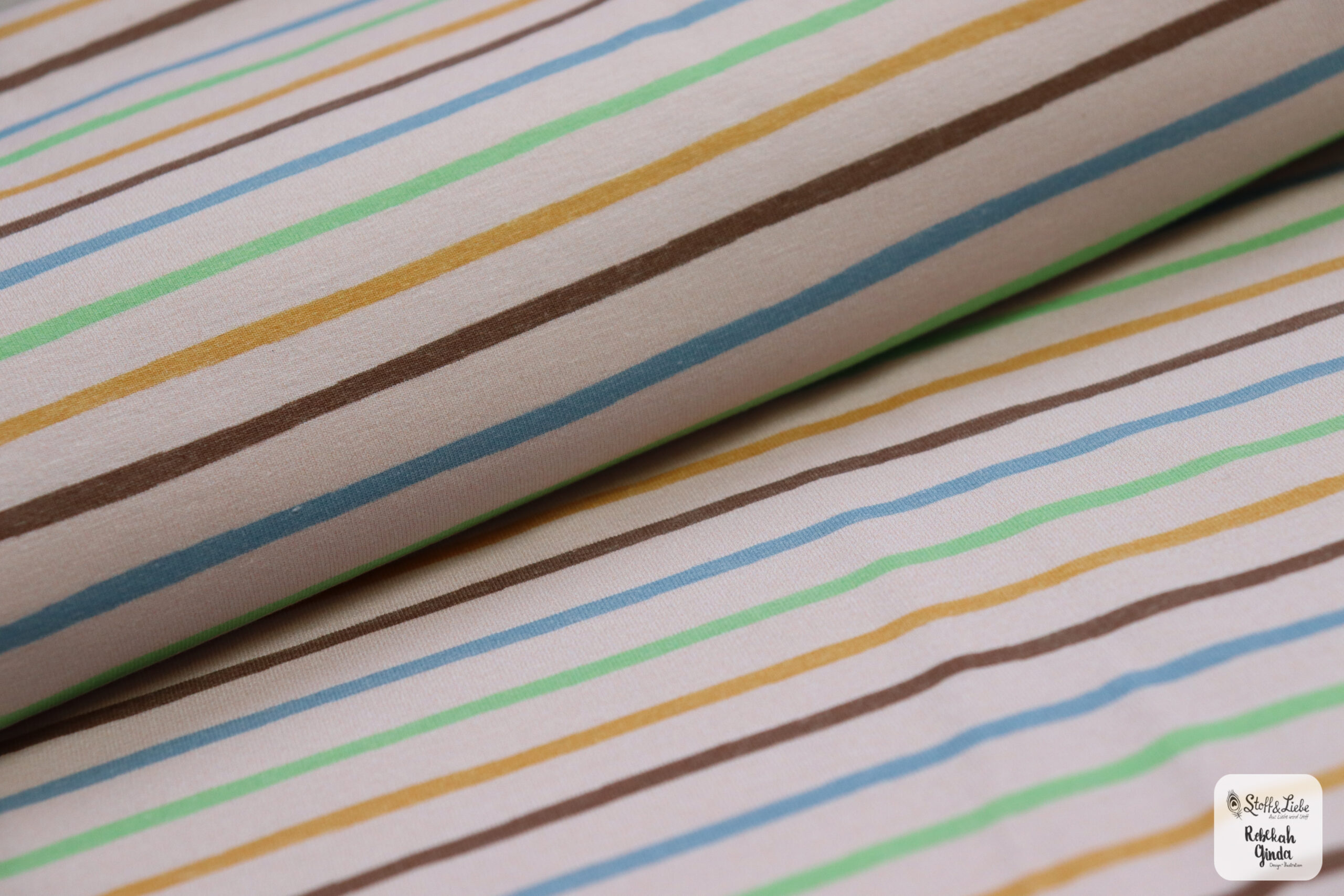 Unser Kombistoff „Ausgewaschene Streifen“ passt nicht nur perfekt zum Panel, sondern ist wie immer auch Solo vernäht ein toller Hingucker. Der leicht beige Untergrund lässt die Streifen in Senf, Grün, Blau und Braun so richtig schön strahlen und zur Geltung kommen.