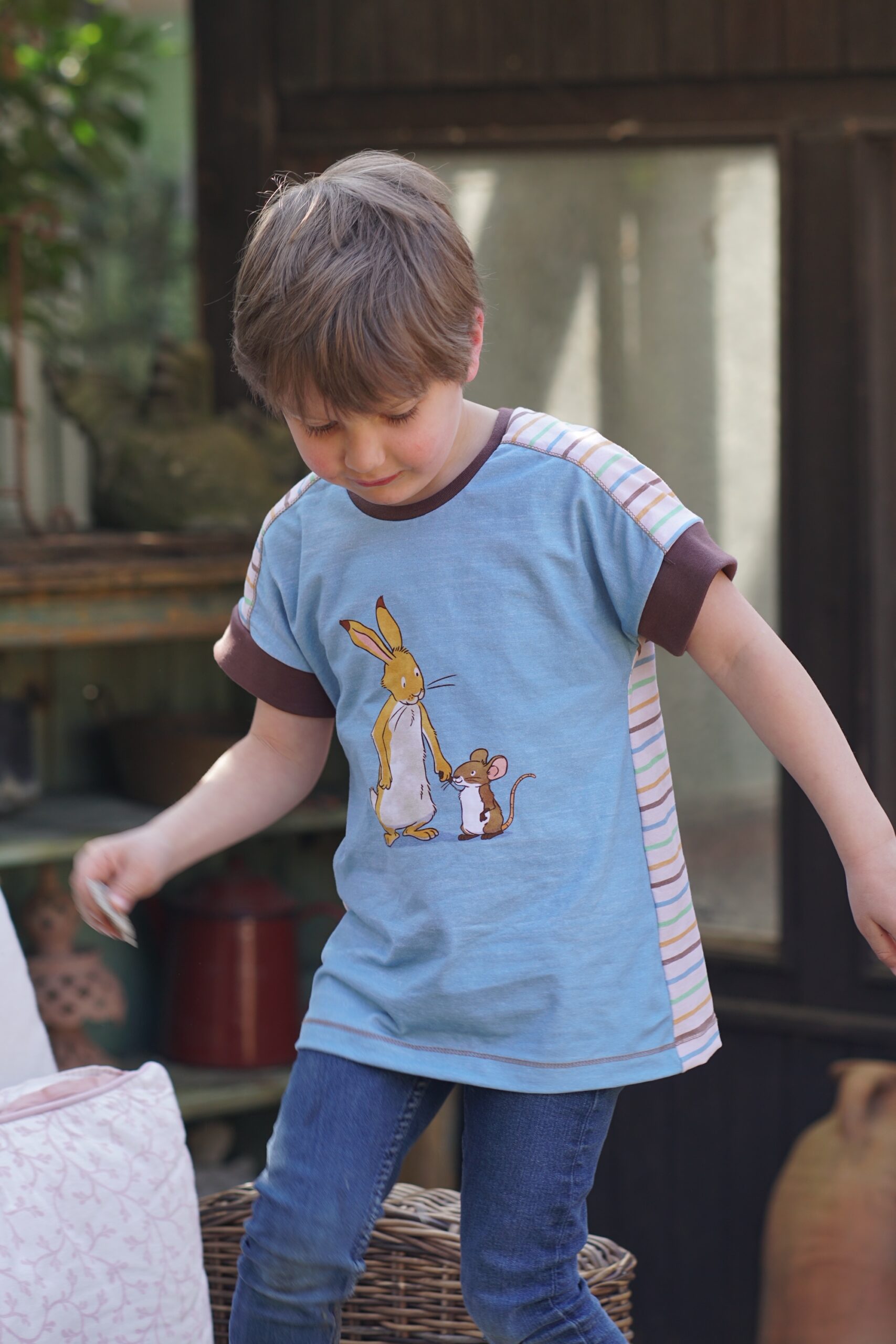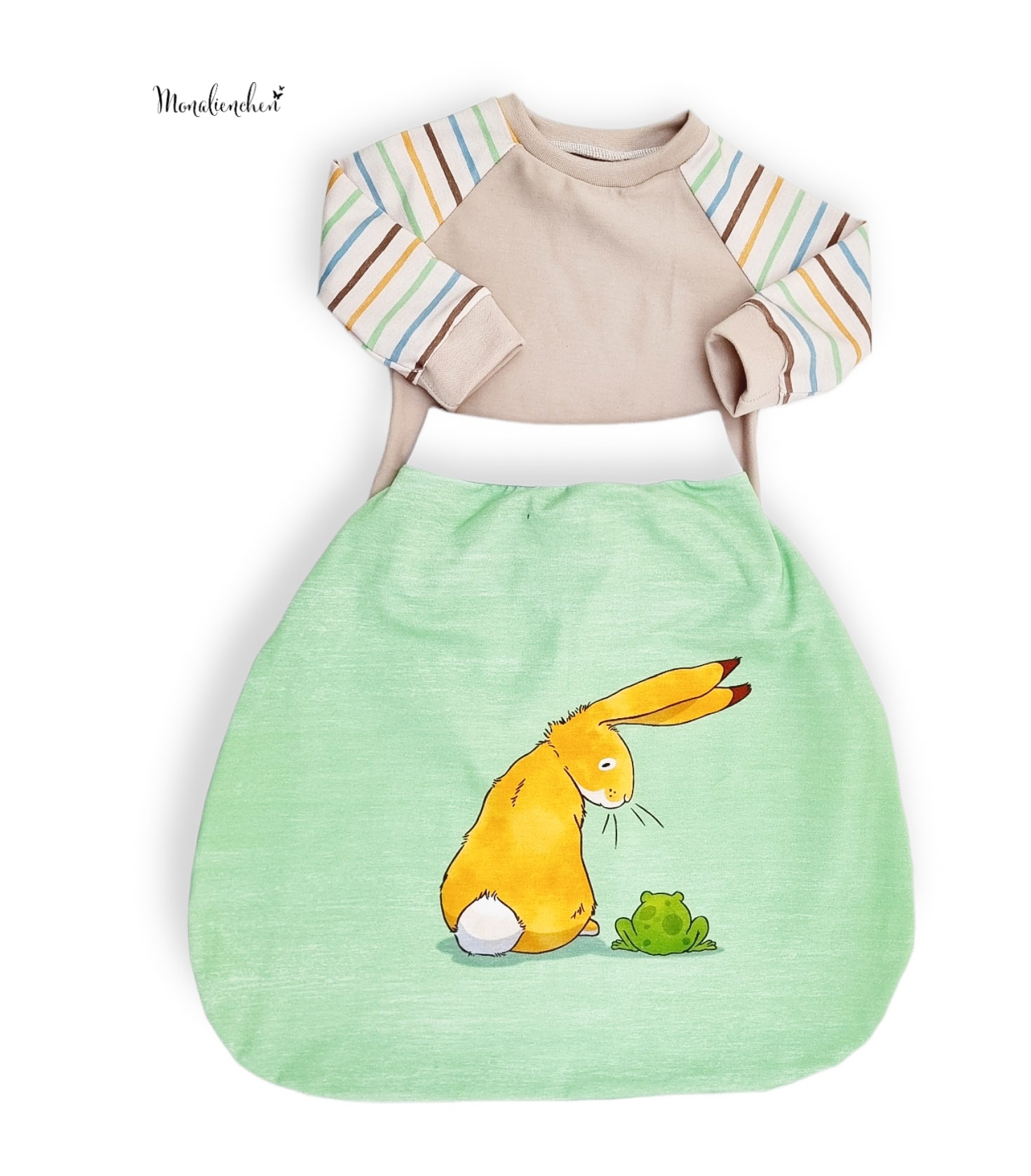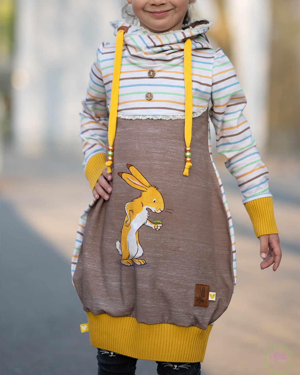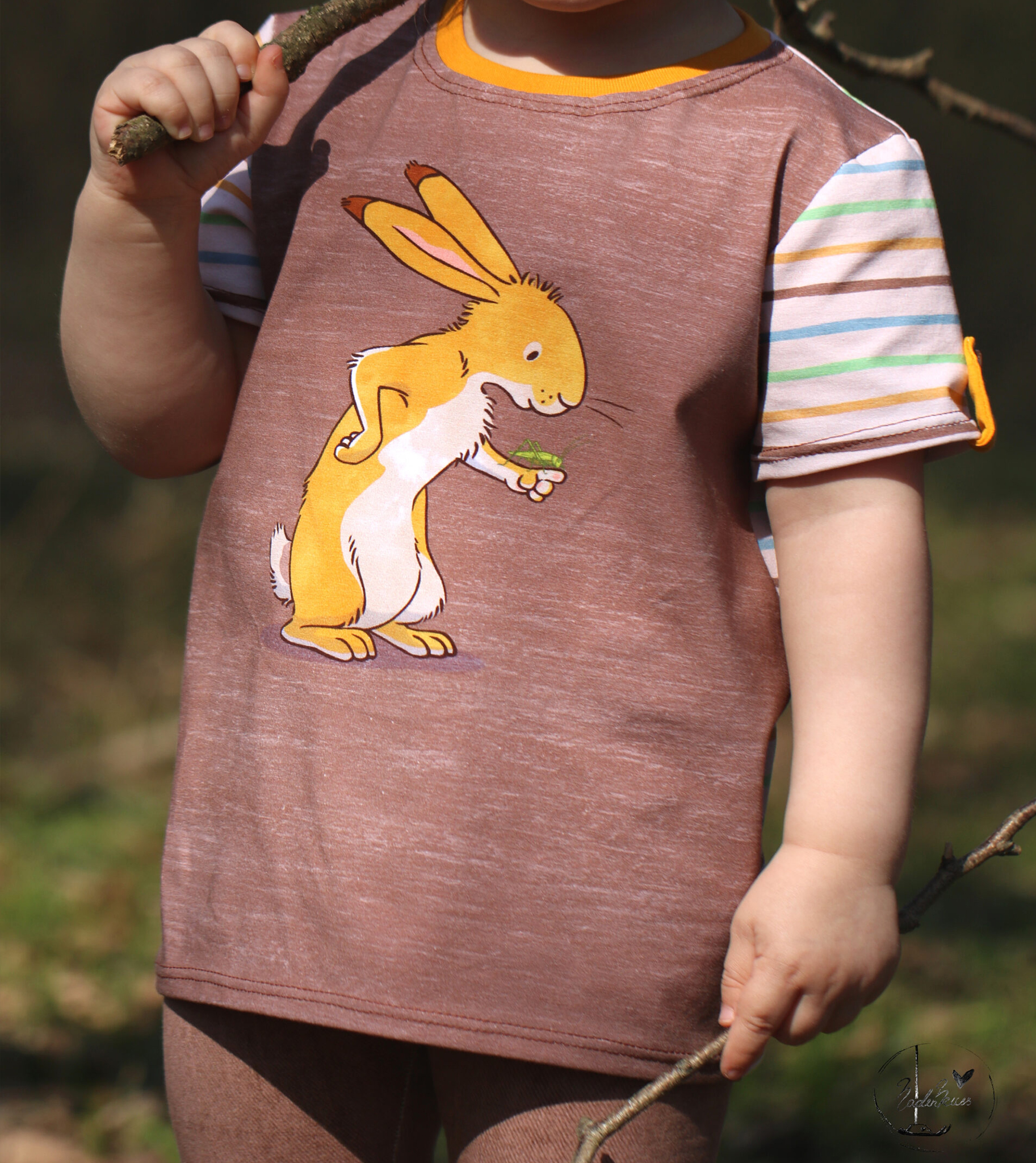 Unser Kombistoff „Ausgewaschene Streifen“ passt nicht nur perfekt zum Panel, sondern ist wie immer auch Solo vernäht ein toller Hingucker. Der leicht beige Untergrund lässt die Streifen in Senf, Grün, Blau und Braun so richtig schön strahlen und zur Geltung kommen.