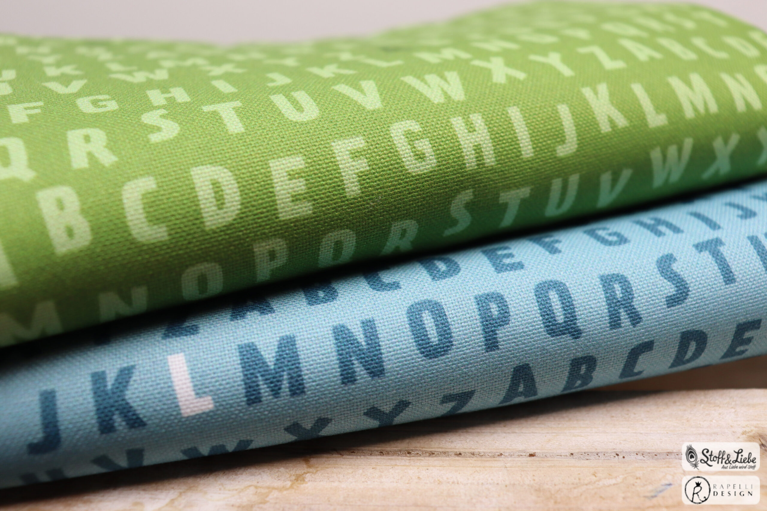 Natürlich ist auch diesmal der „ABC“ Kombistoff wieder dabei, ebenfalls in Oliv und Smokey Blue. Die einzelnen Buchstaben haben eine Höhe von ca. 1,3 cm. Somit lassen sich mit diesen Stoffen auch ganz prima Highlights setzen oder Teilungen einarbeiten.