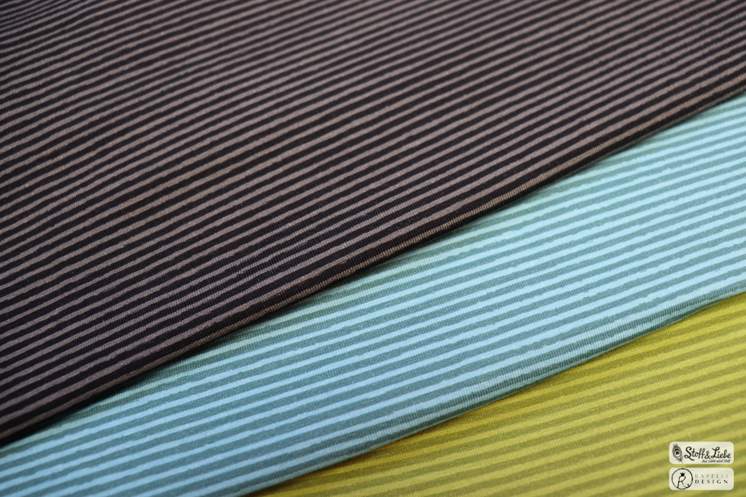 Was darf als Kombistoff nicht fehlen? Ganz genau! Unsere Ringelies! Diesmal haben wir sie für Euch in drei Farben: Schwarz, Petrol und Oliv. Eine Farbe schöner als die andere, wir wissen gar nicht, welche unser Favorit ist. Könnt Ihr Euch entscheiden?
