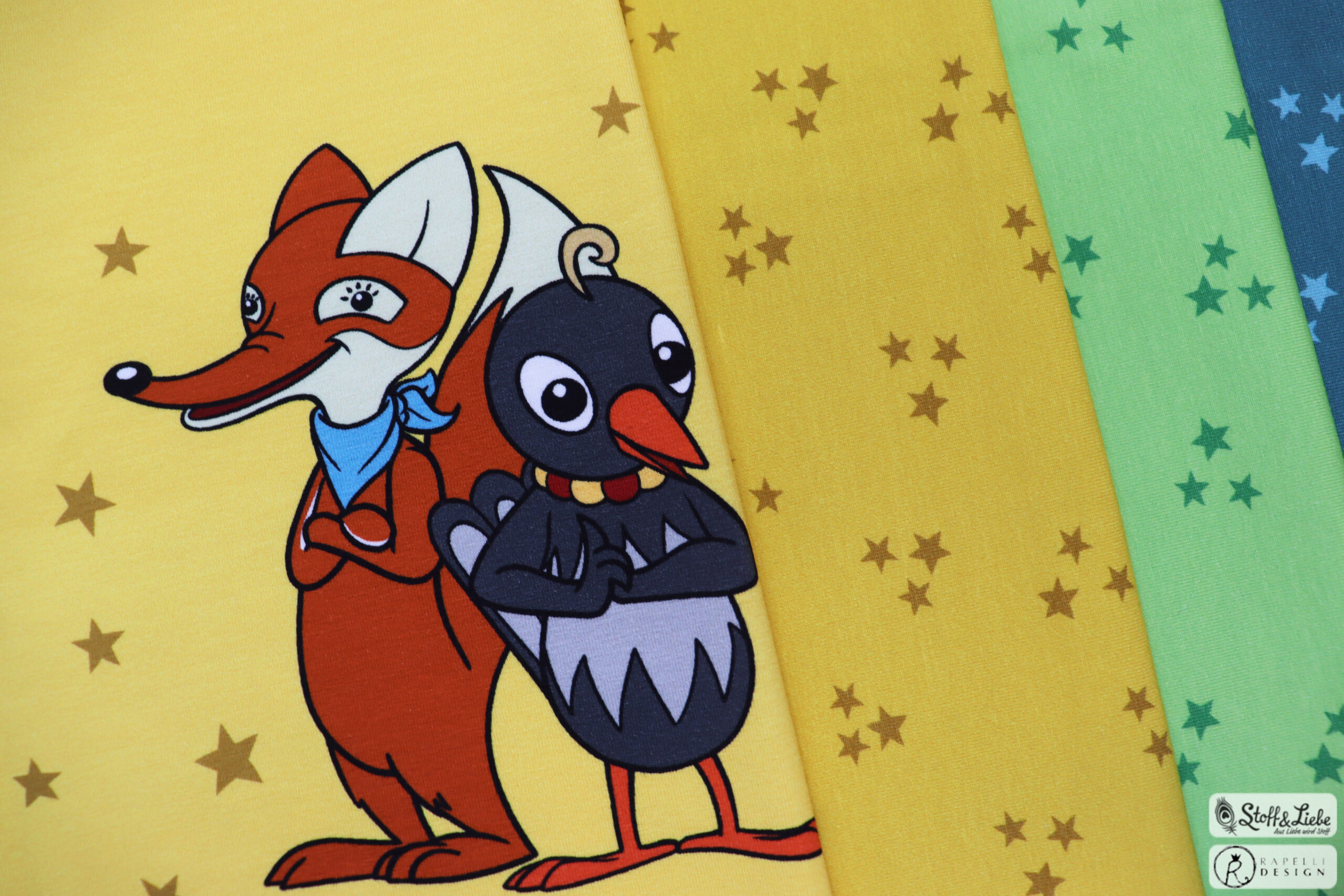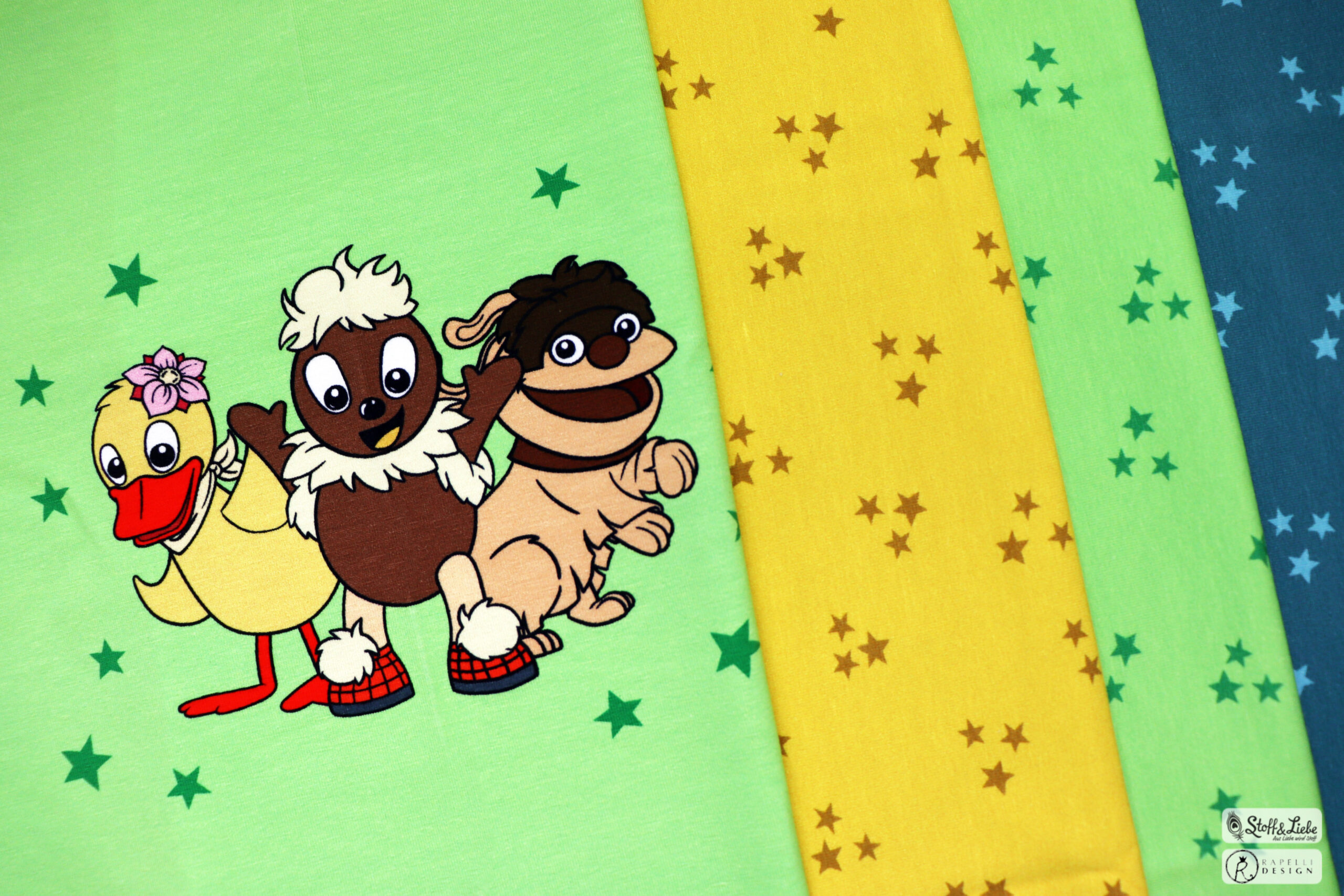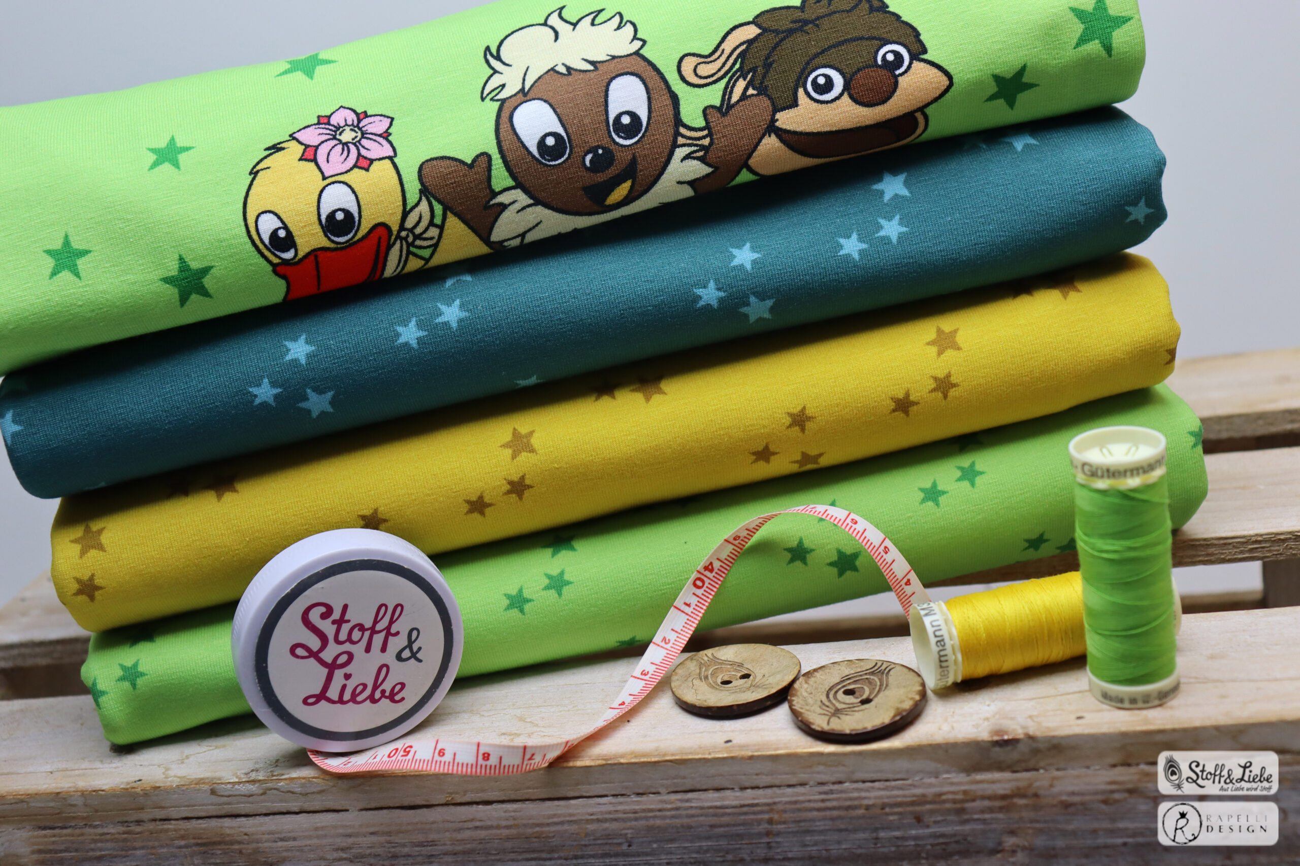 Die Kollektion „Unser Sandmännchen – All Stars“ besteht aus einem Panel und drei passenden Kombistoffen. Alle Stoffe der Kollektion erhaltet Ihr auf Jersey mit einer Materialzusammensetzung von 95 % Baumwolle und 5 % Elasthan und wurden von unserer lieben Marleen von Rapelli Design für uns umgesetzt.