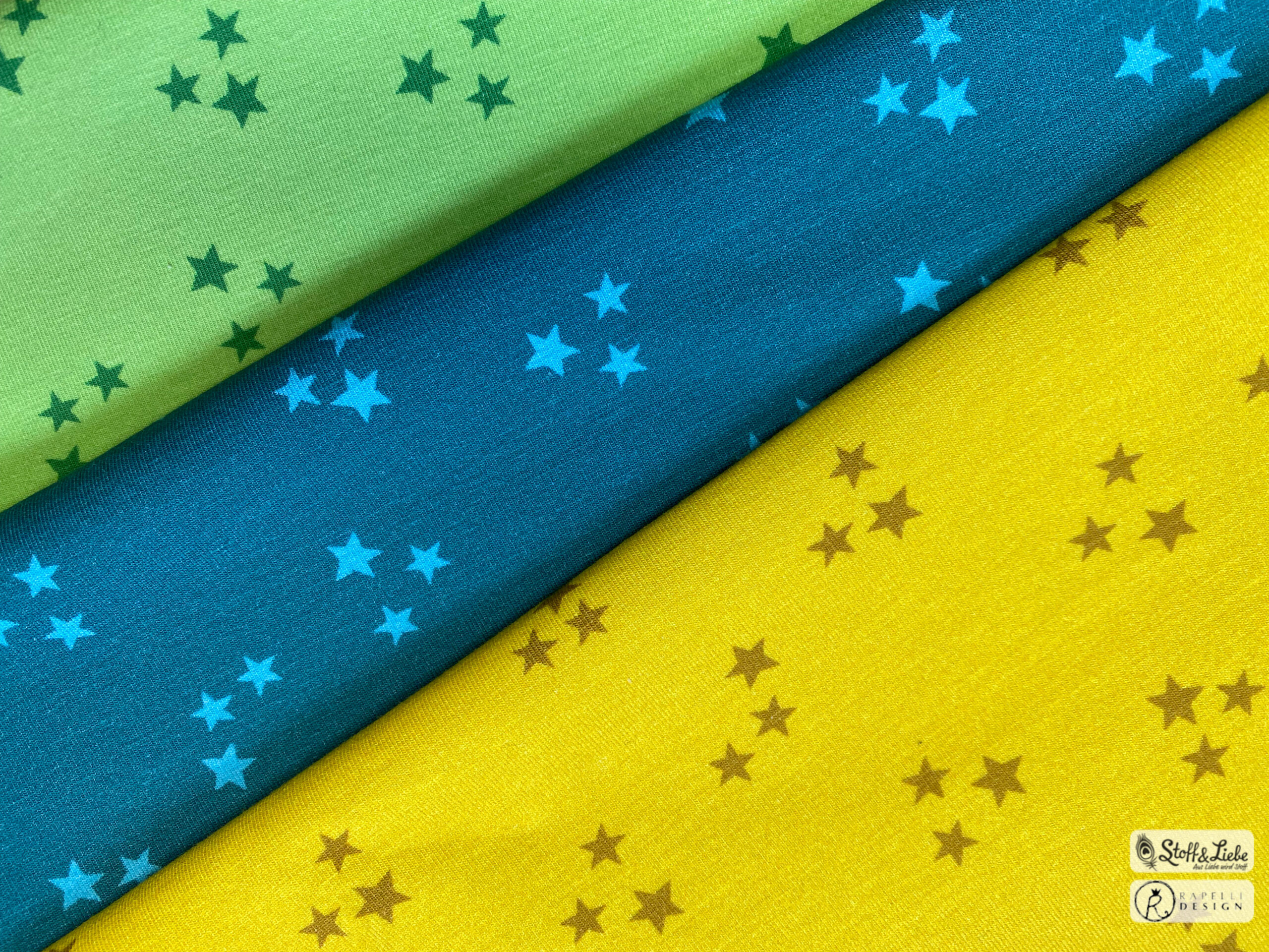 Wie Ihr seht, lässt sich auch diese Kollektion wieder perfekt untereinander kombinieren. Ihr könnt die Stoffe innerhalb einer Farbgruppe vernähen oder auch bunt mischen. Außerdem lassen sich die Sterne auch ganz prima mit einem Plott, einer Stickerei oder Applikation versehen.