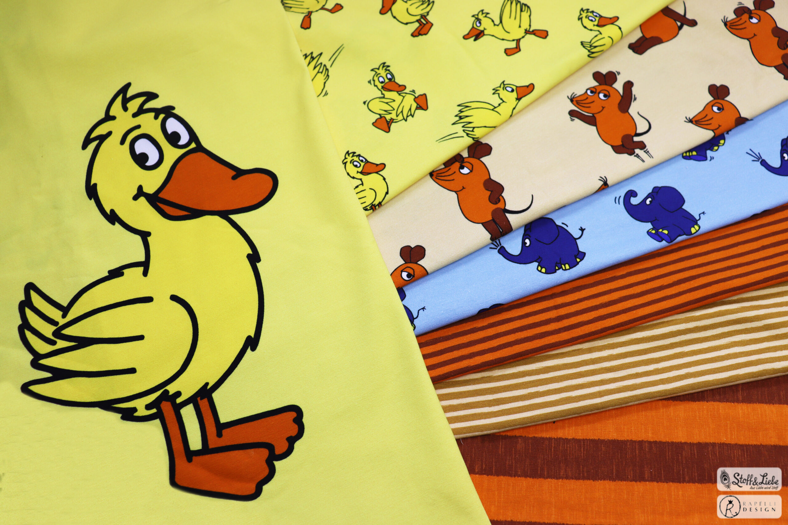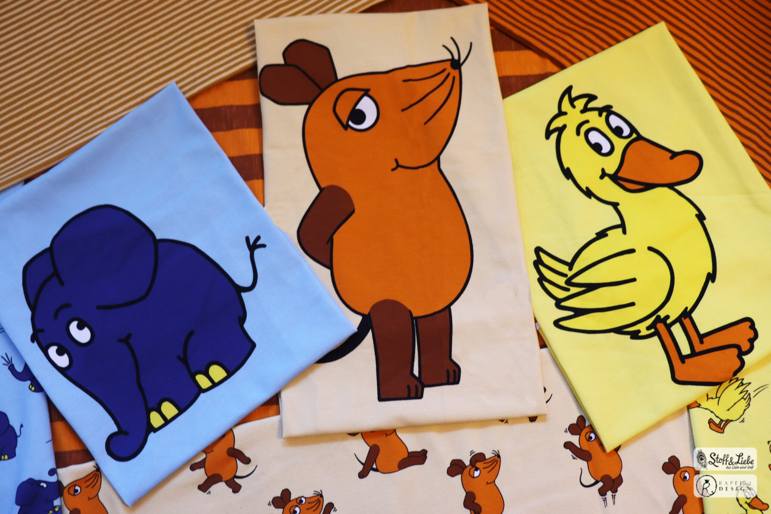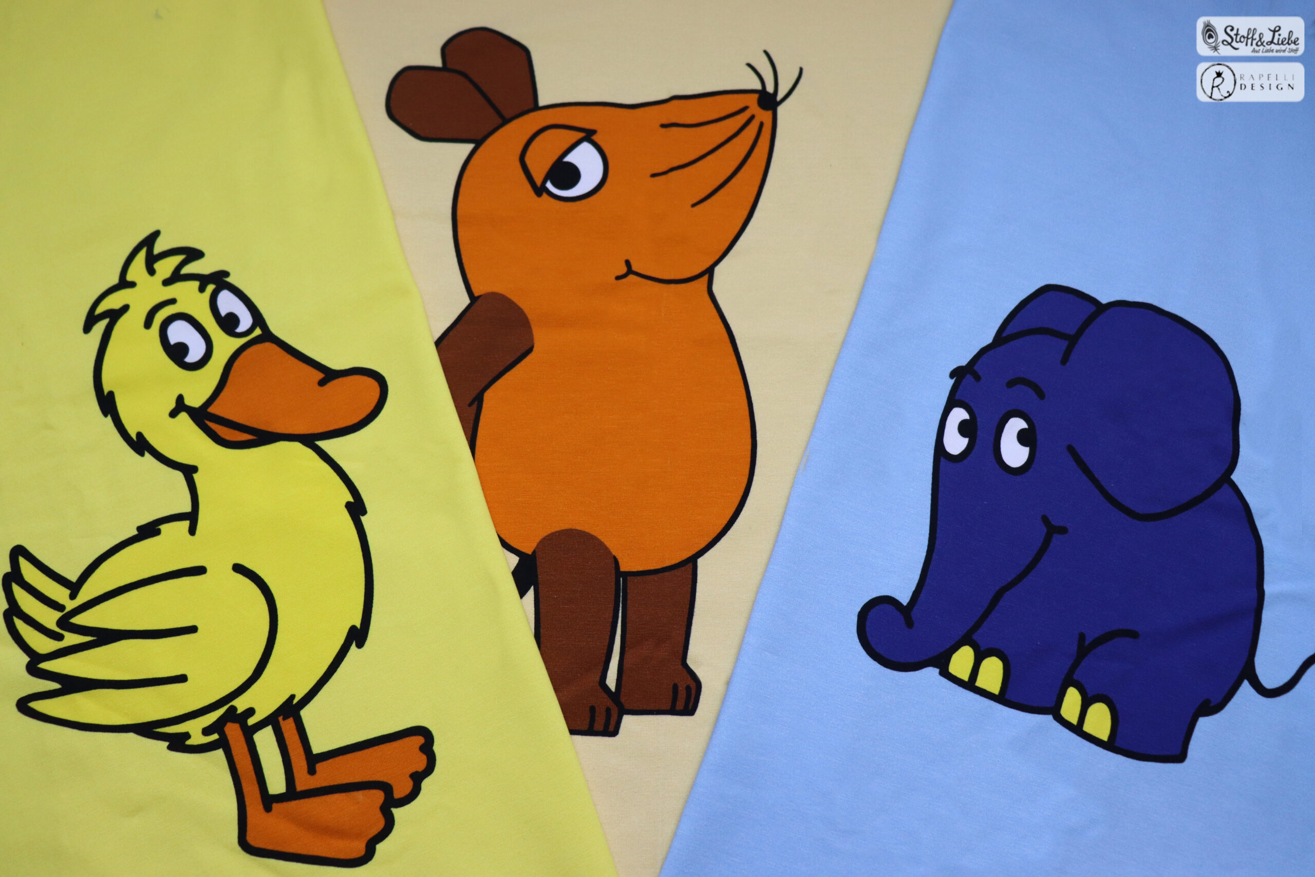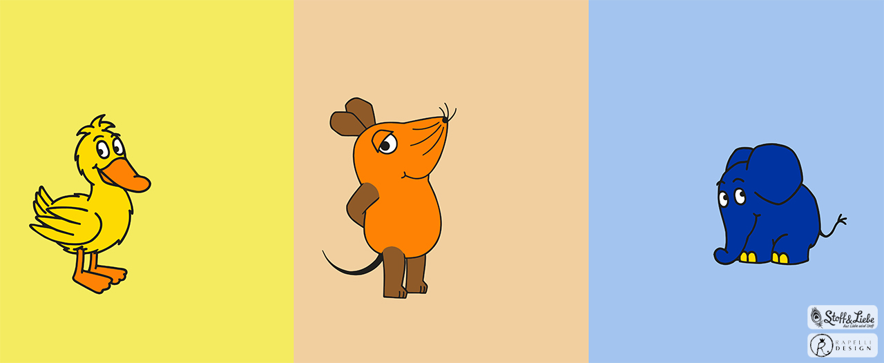 Allover „Die Maus“, „Der Elefant“ und „Die Ente“