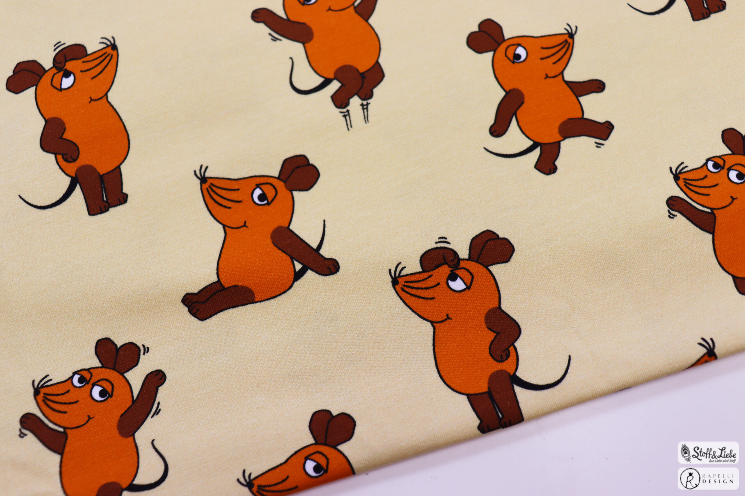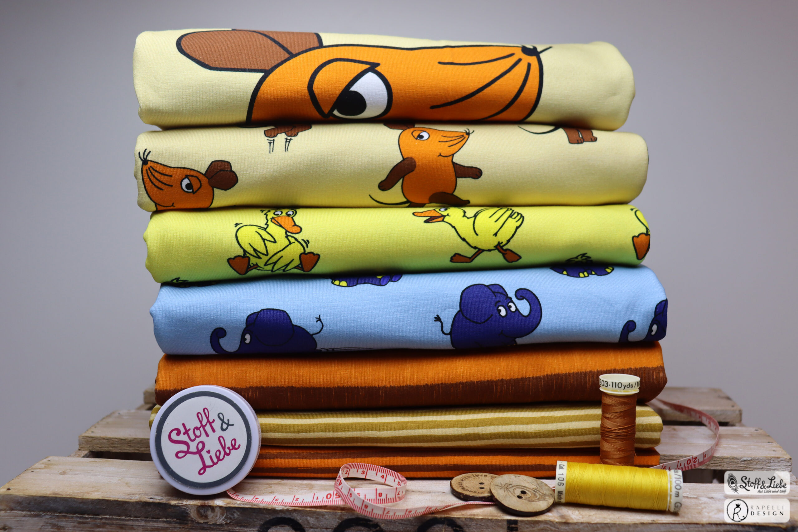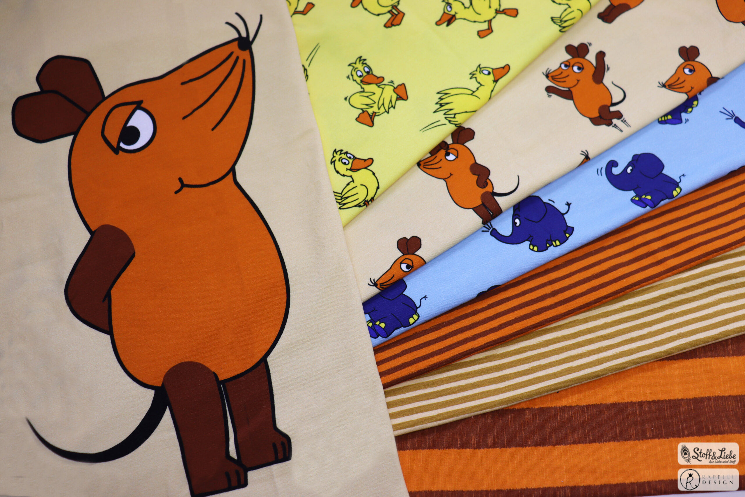 Unsere „Die Maus – Freunde “ Kollektion wurde umgesetzt von der lieben Marleen von Rapelli Design und hält ein Panel, drei Hauptstoffe und passend dazu drei Kombistoffe für Euch bereit. Die Stoffe dieser Kollektionen erscheinen auf butterweichem Jersey und haben eine Materialzusammensetzung von 95 % Baumwolle und 5 % Elasthan.