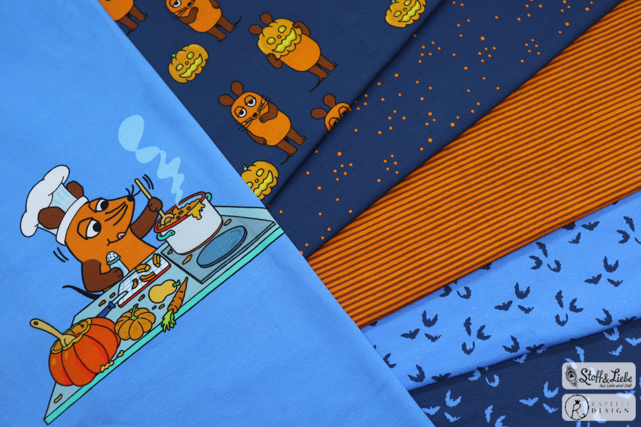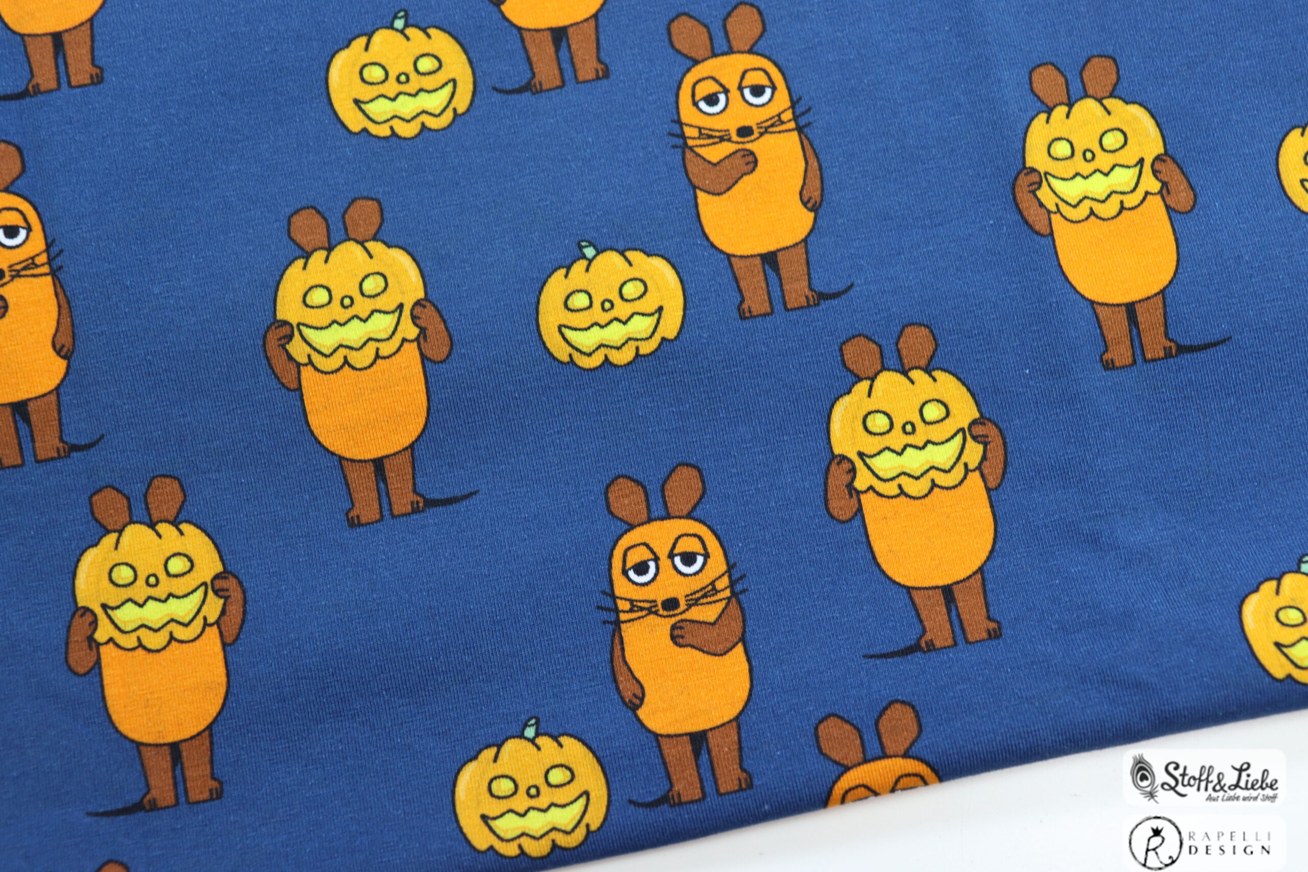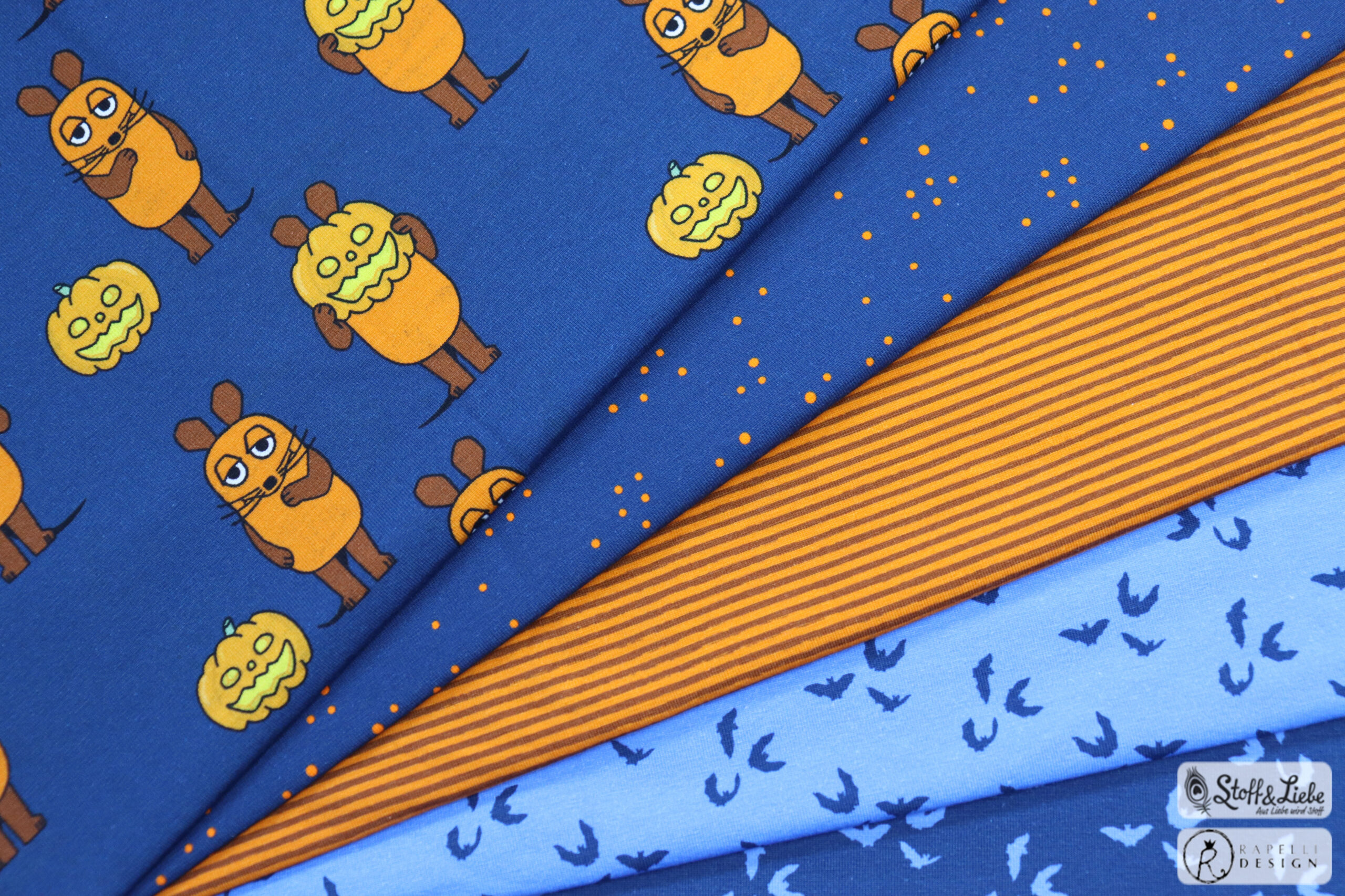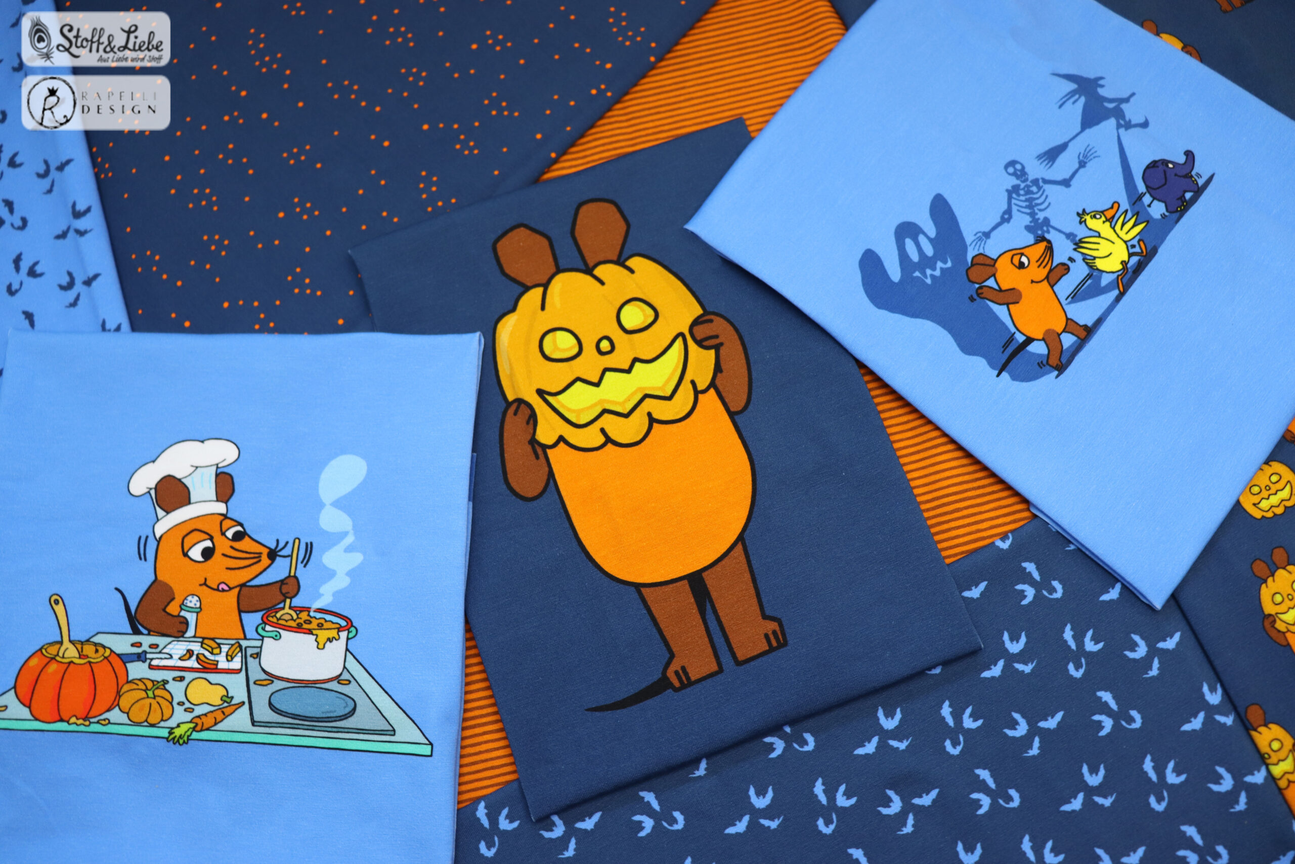 Unsere „Die Maus – Halloween “ Kollektion wurde umgesetzt von der lieben Marleen von Rapelli Design und hält ein Panel, einen Hauptstoff und passend dazu drei Kombistoffe für Euch bereit. Die Stoffe dieser Kollektionen erscheinen auf Jersey in unserer gewohnten Spitzenqualität und haben eine Materialzusammensetzung von 95 % Baumwolle und 5 % Elasthan.