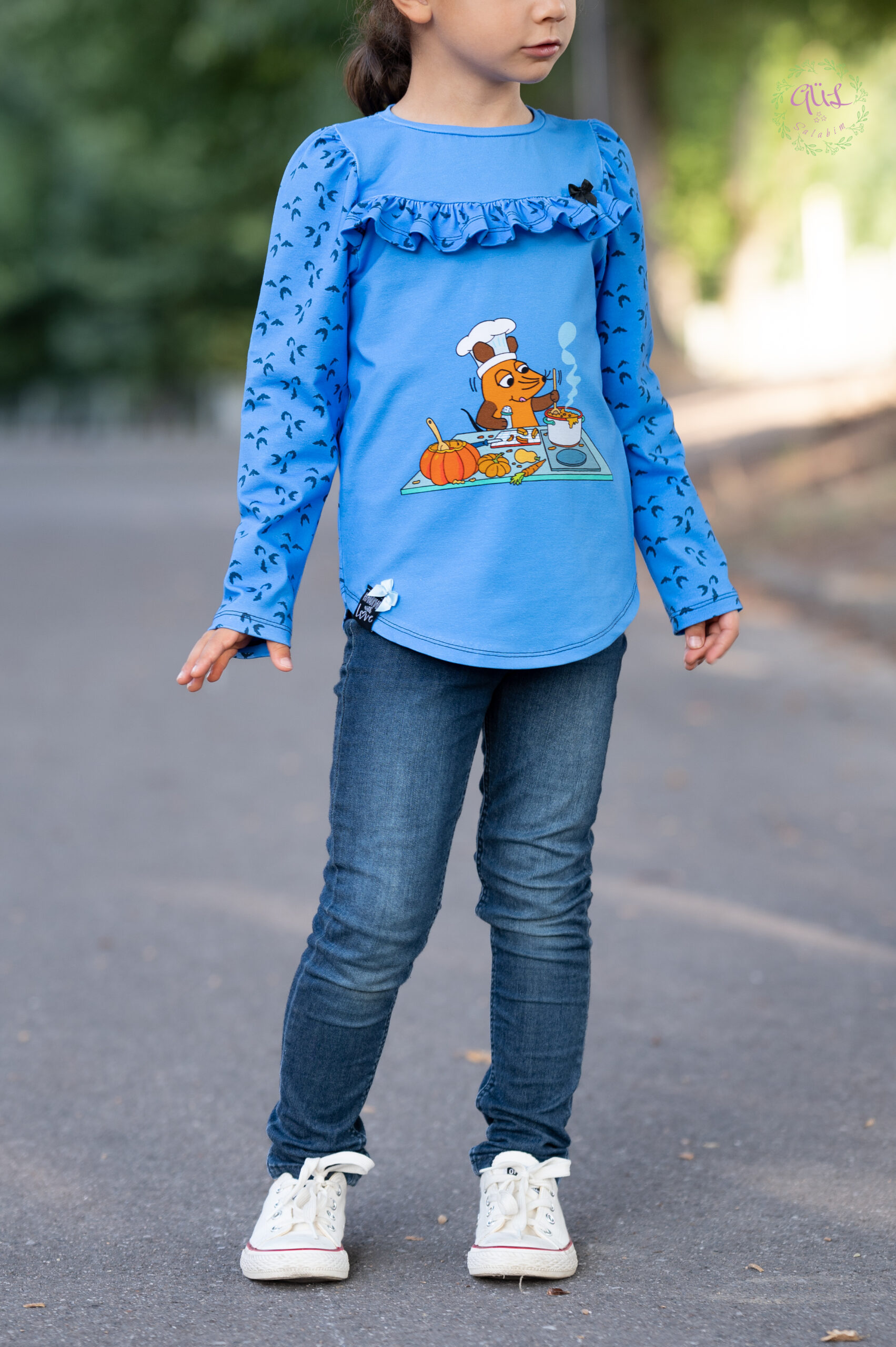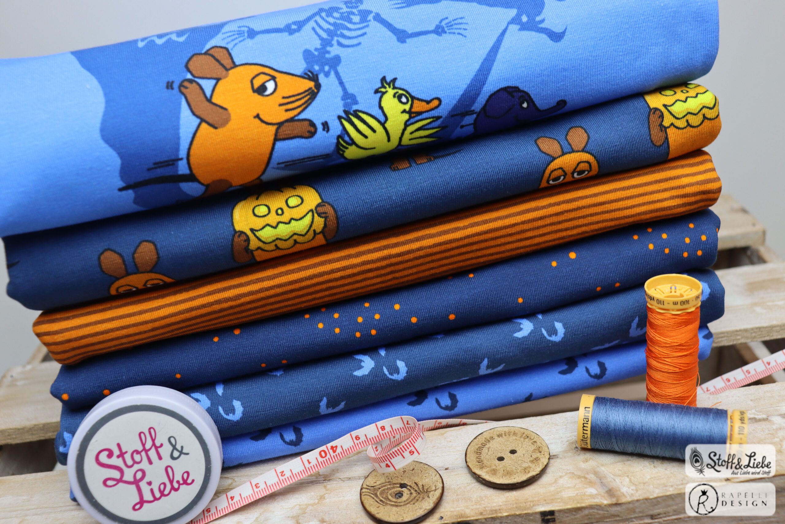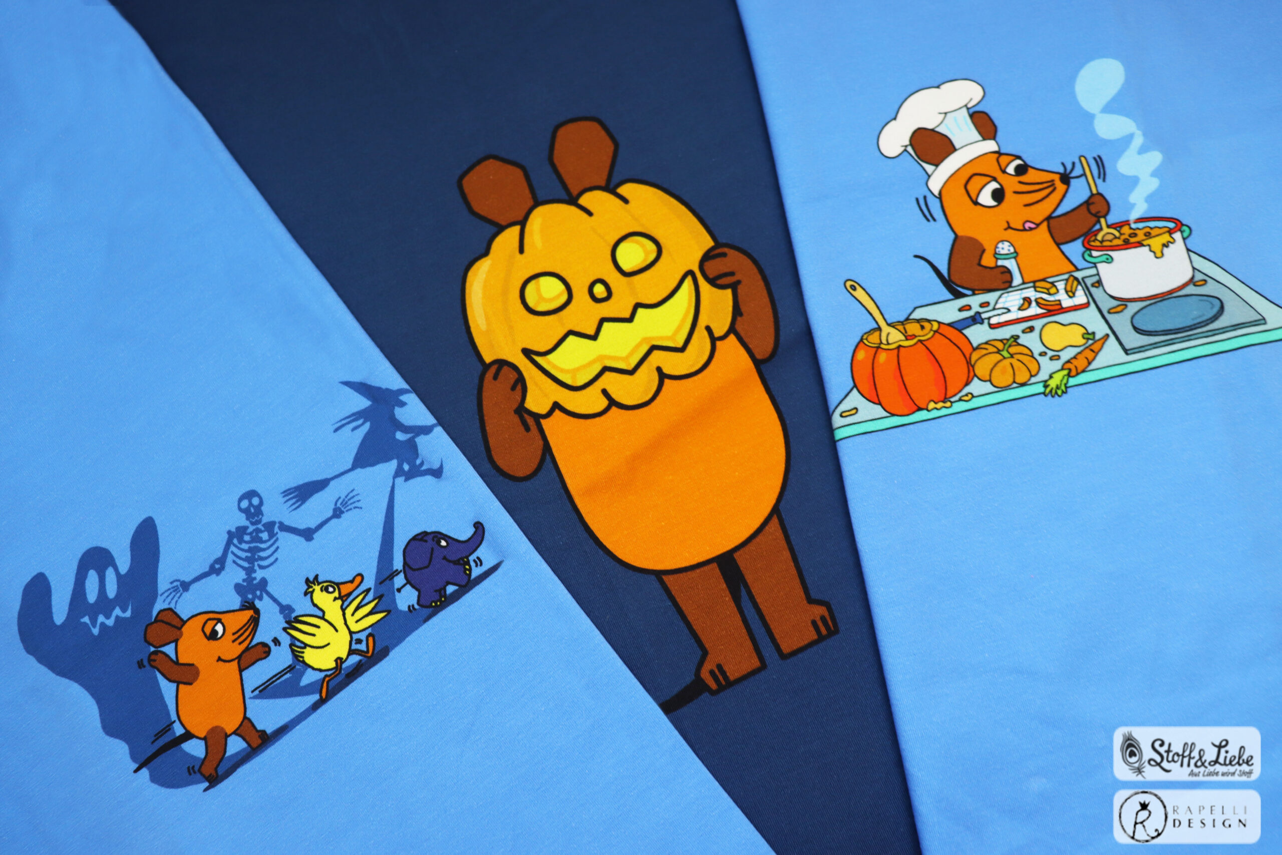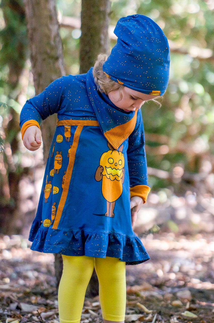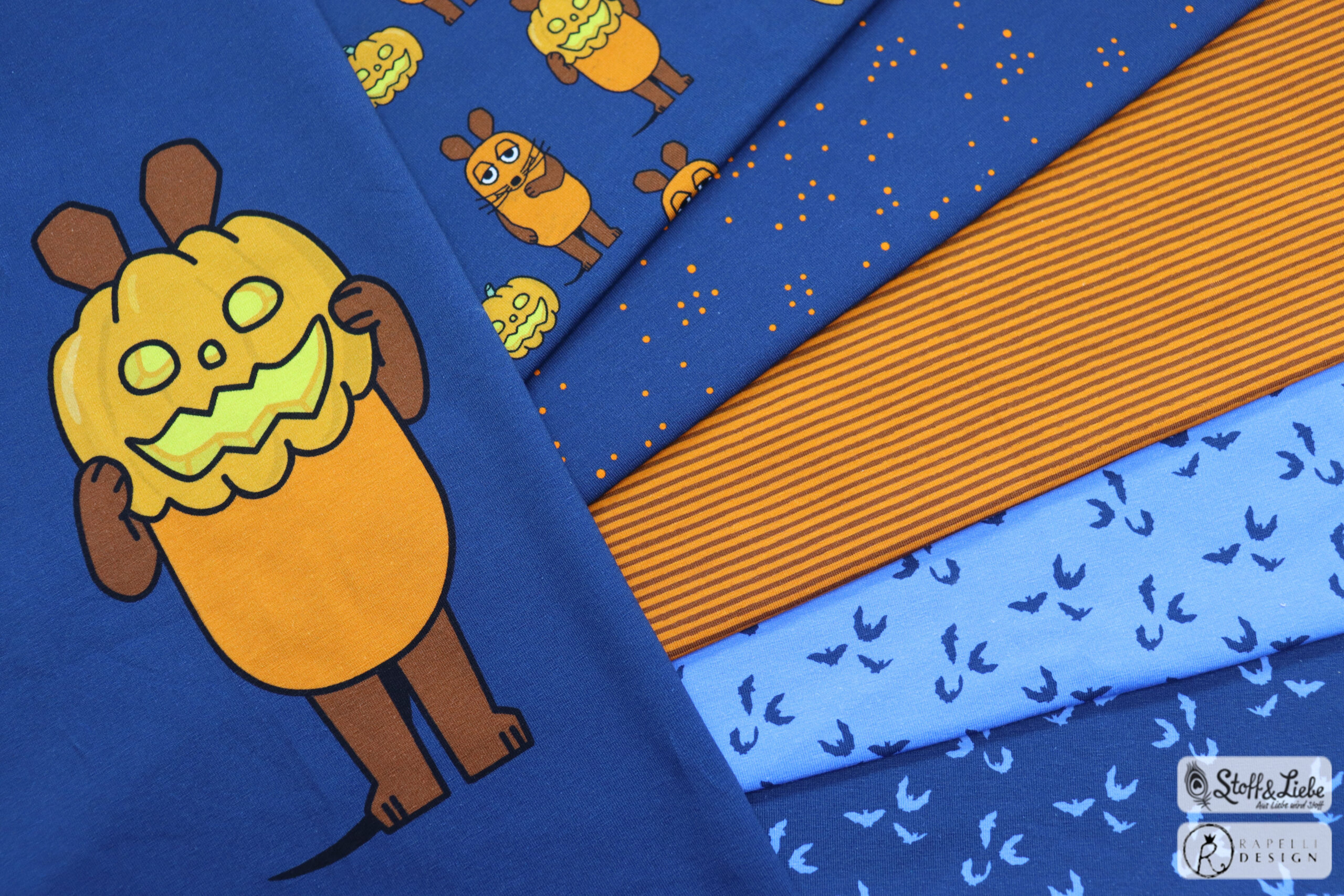 Unsere „Die Maus – Halloween “ Kollektion wurde umgesetzt von der lieben Marleen von Rapelli Design und hält ein Panel, einen Hauptstoff und passend dazu drei Kombistoffe für Euch bereit. Die Stoffe dieser Kollektionen erscheinen auf Jersey in unserer gewohnten Spitzenqualität und haben eine Materialzusammensetzung von 95 % Baumwolle und 5 % Elasthan.