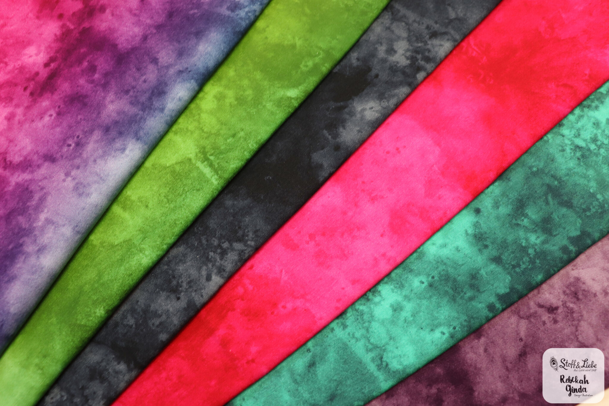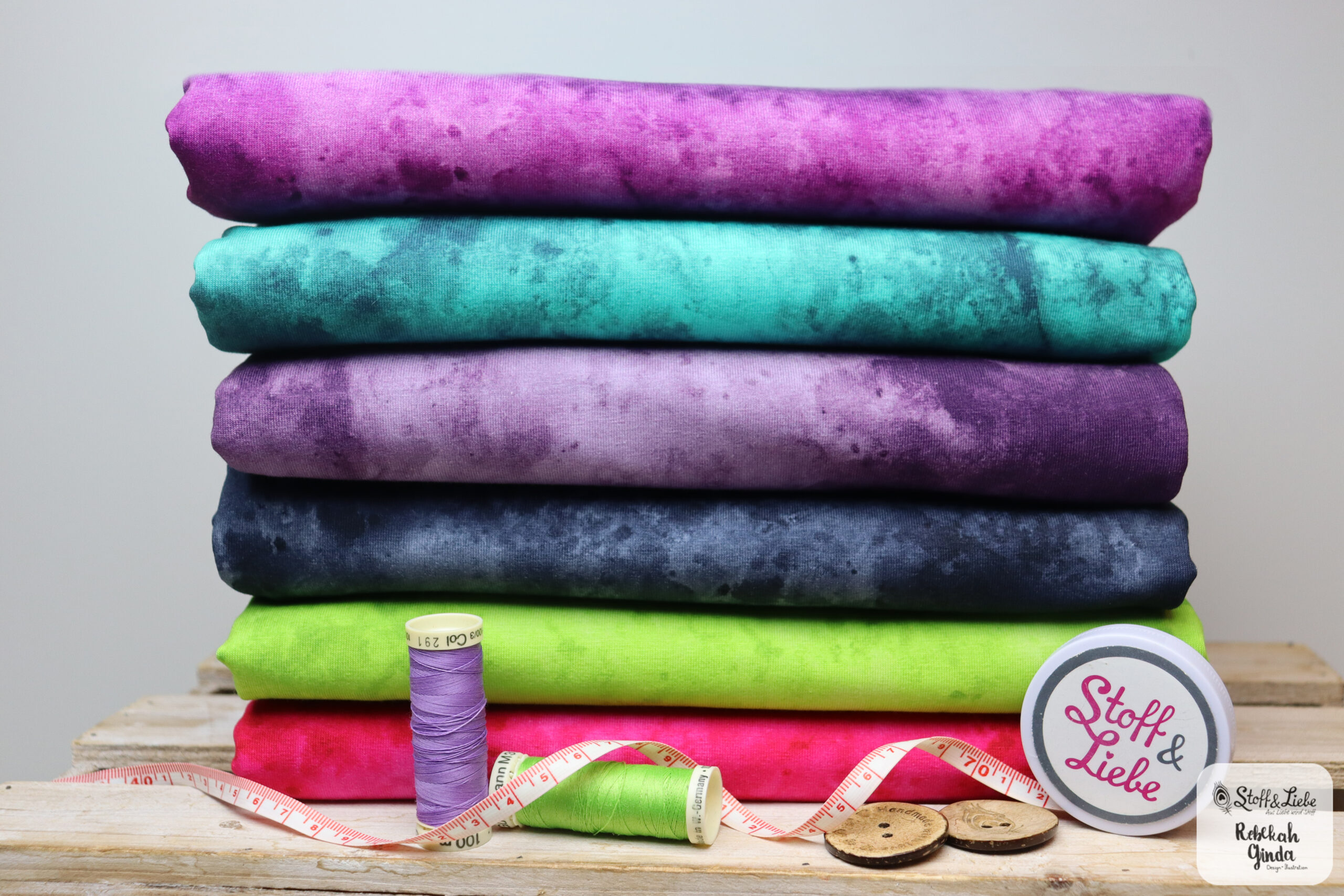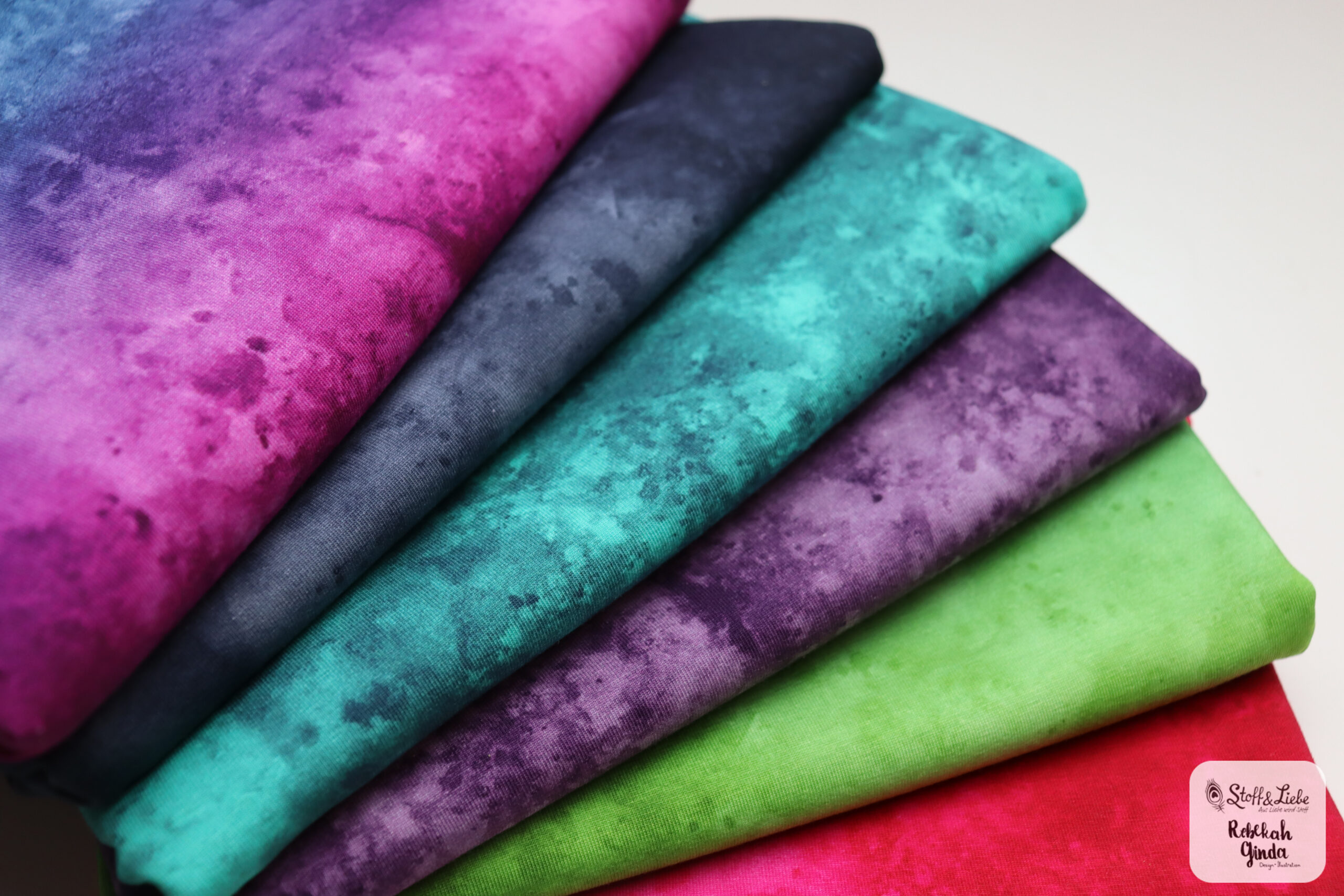 Unsere Watercolor Kollektion umfasst sechs fantastische Farbstellungen auf wunderbar weichem Jersey mit einer Materialzusammensetzung von 95 % Baumwolle und 5 % Elasthan. Das Design stammt aus der Feder von Rebekah Ginda.