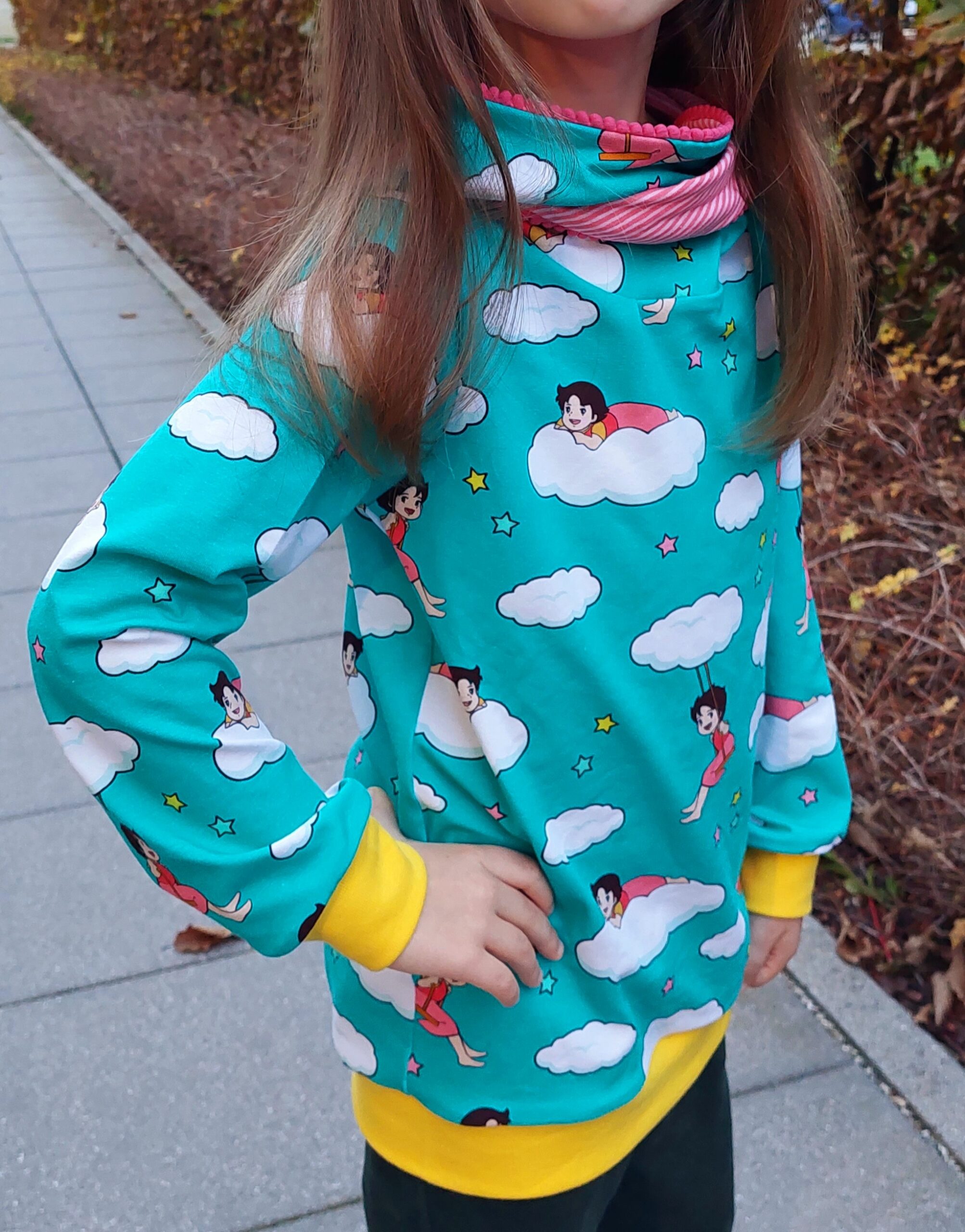 Als Kombistoff können wir Euch zu „Heidi – Wolken“ aus unserer Pamuk-Linie empfehlen 028 Aqua sowie 922 und 100 Weiß. Passendes Garn wäre hier der Allesnäher von Gütermann in den Farbnummern 339 und 800.