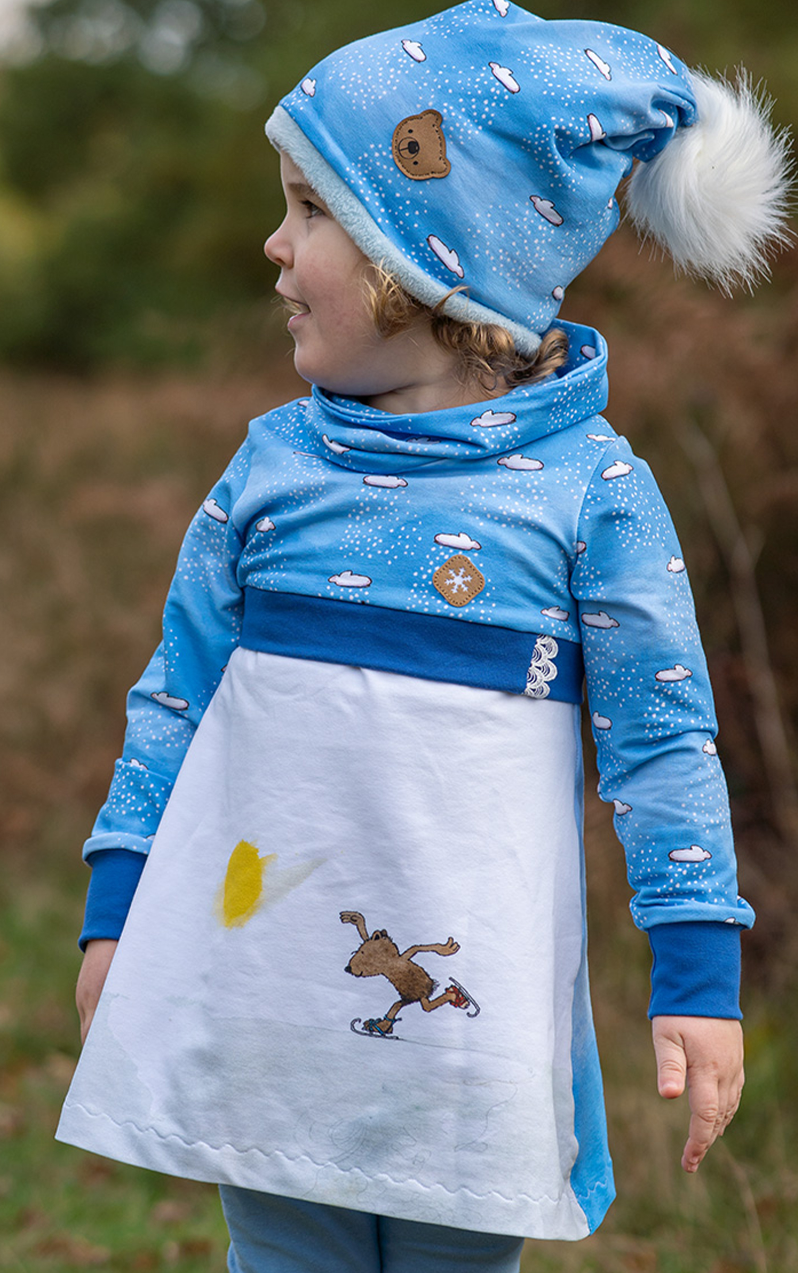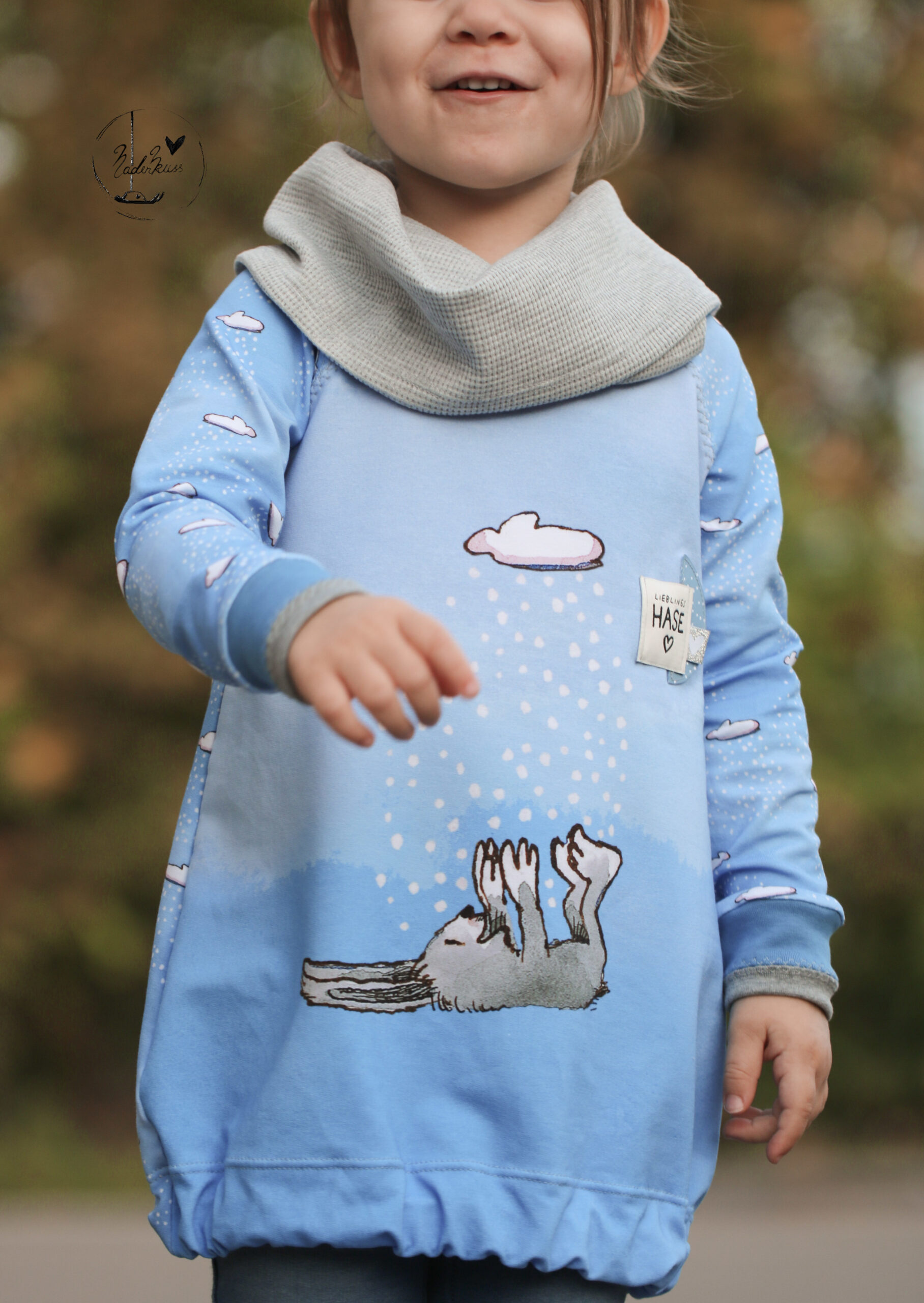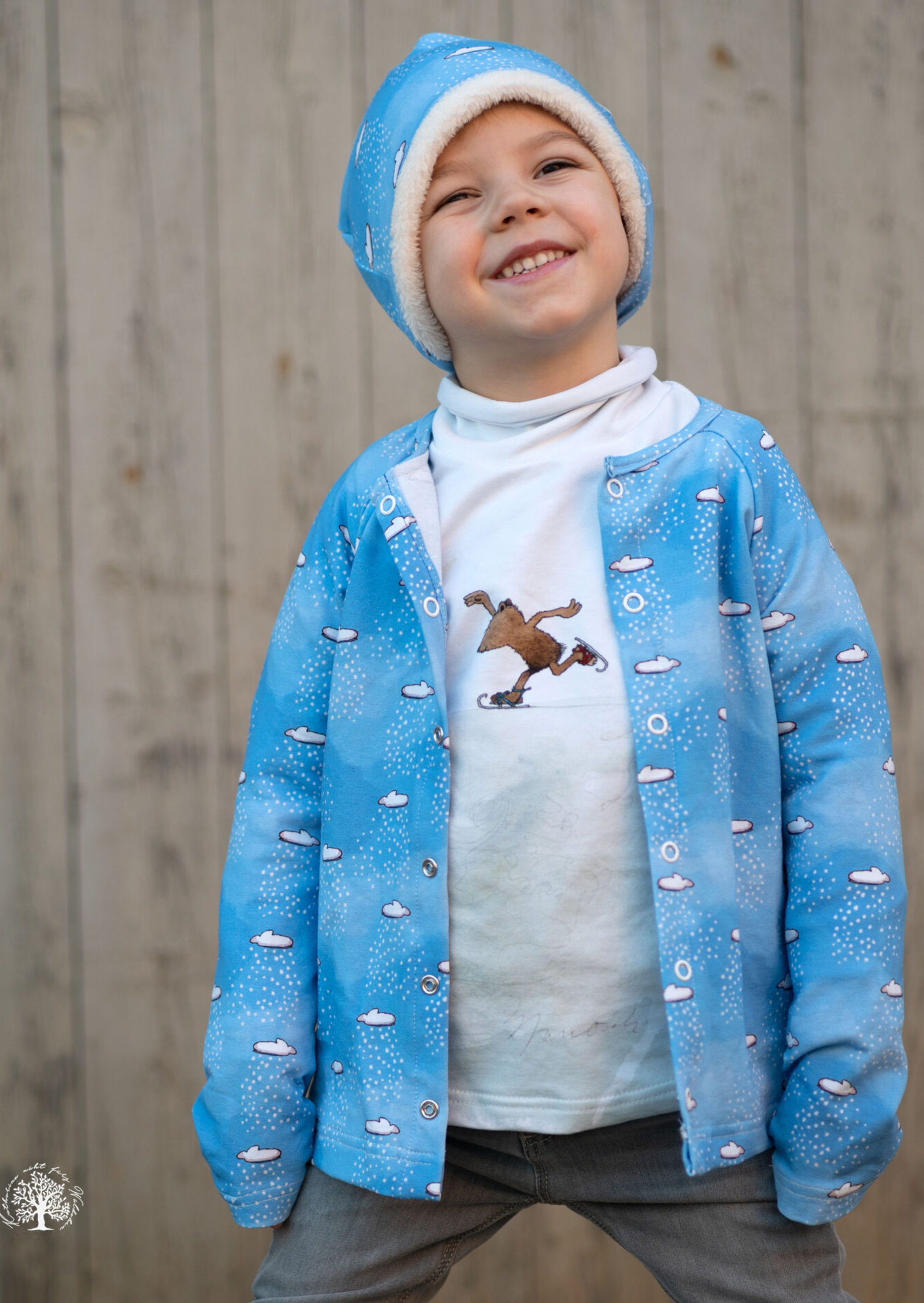 Als Kombistoff haben wir für Euch „Schneewolken“, ebenfalls mit leichtem Aquarelleffekt. Sie passen einerseits perfekt zu dem Panelbild mit dem Hasen und andererseits sind sie auch mit den anderen Stoffen der Kollektion prima kombinierbar und machen so jedes Nähstück um Eyecatcher. Probiert doch einfach mal aus, welche Kombination Euch am besten gefällt.