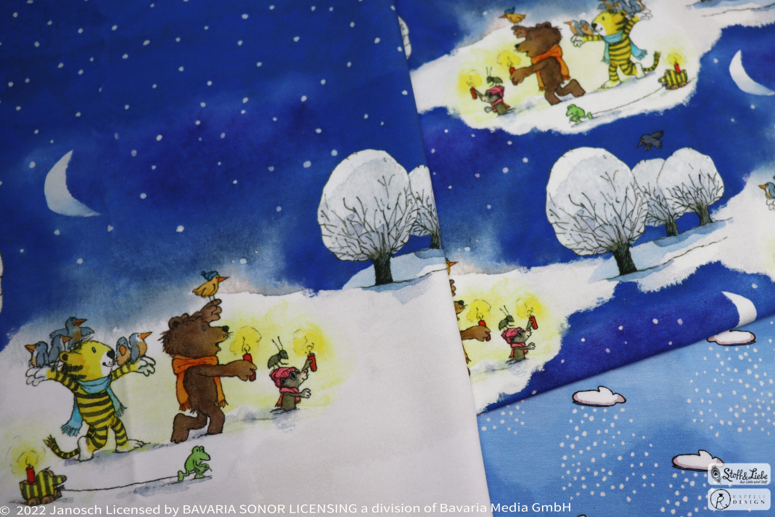 Als Hauptstoff haben wir den zuckersüßen, vor allem aber detailreichen “Oh, wie schön ist Schnee!“ für Euch. Die Motivgrößen liegen zwischen ca. 2 cm (Tigerente mit Kerze) bis ca. 6,5 cm (Bär mit Vogel). Somit ist der Allover perfekt für Nähwerke in allen Größen nutzbar.