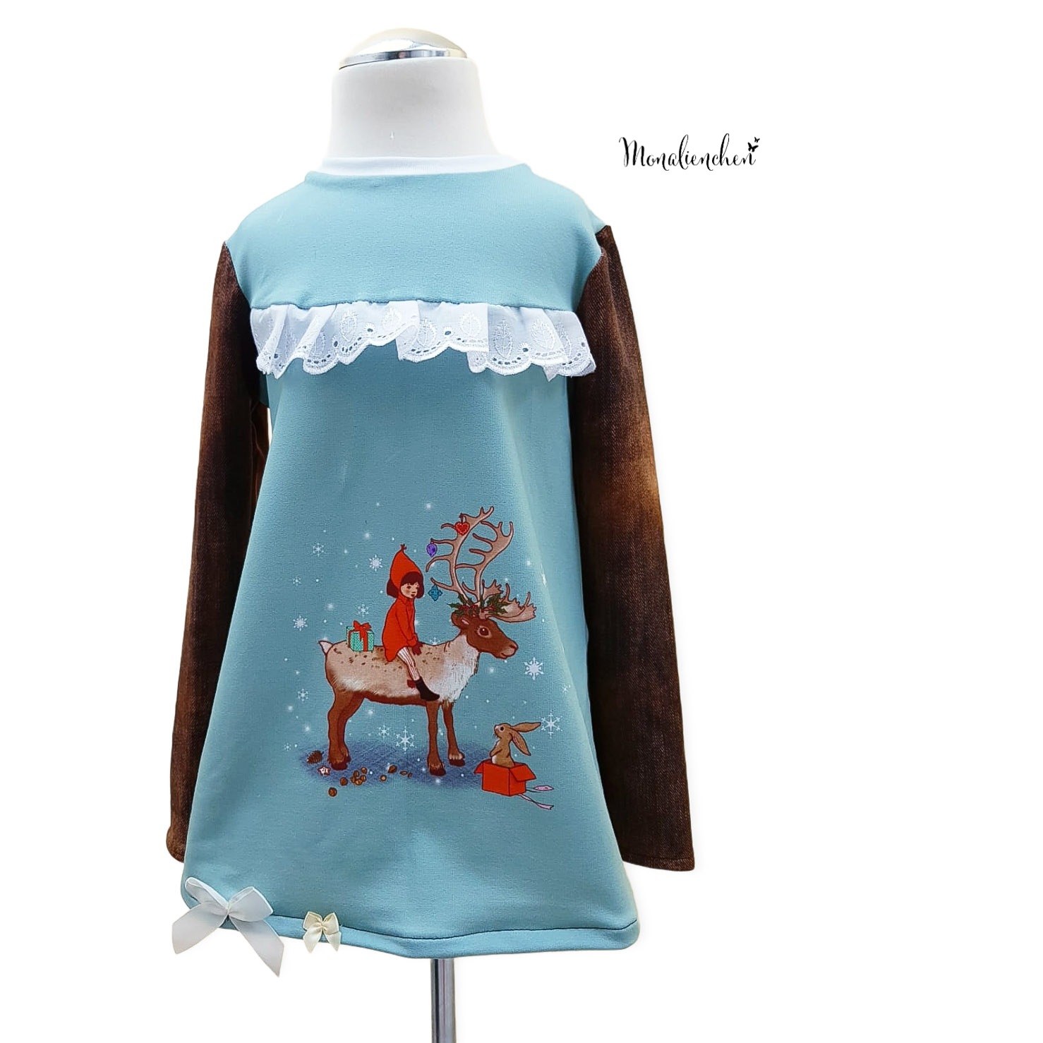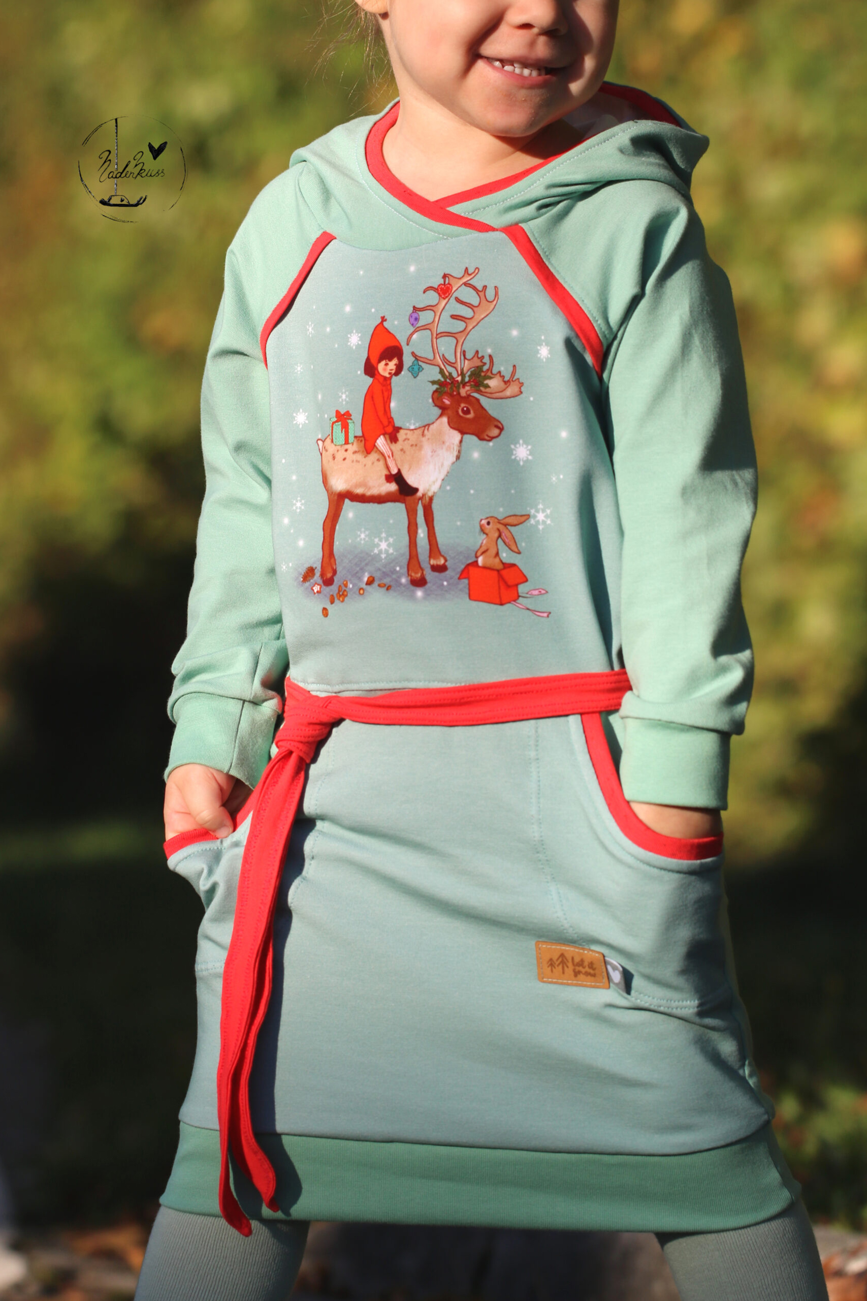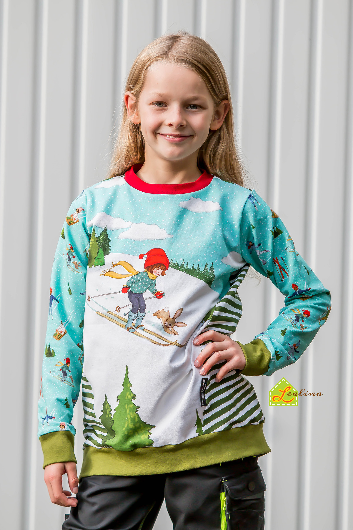Das „Ski with me“ Panel hat eine Höhe von ca. 65 cm und ist somit perfekt für kleine und große Belle & Boo Fans geeignet. Das Panel hat eine Aufteilung von 1/3 zu 2/3. Das heißt, auf dem ersten Teil des Panels findet Ihr Belle& Boo als großflächiges Motiv beim Skifahren und auf dem zweiten Teil den passenden Allover auf einem richtig tollen Mint.