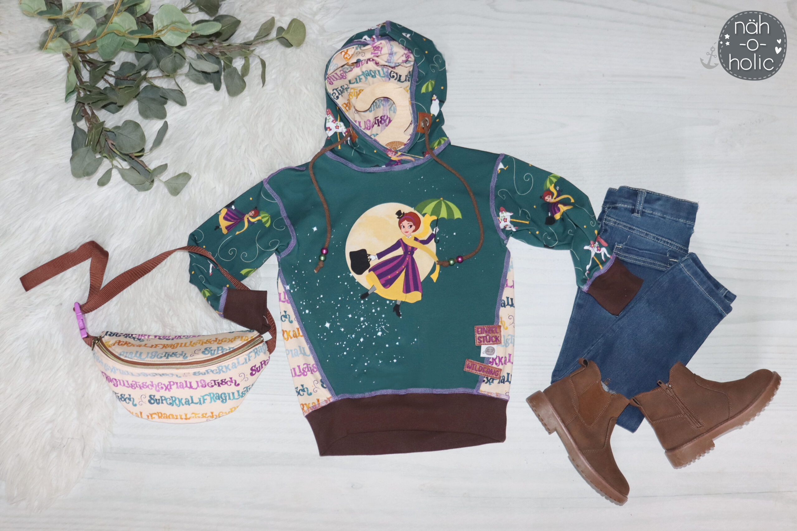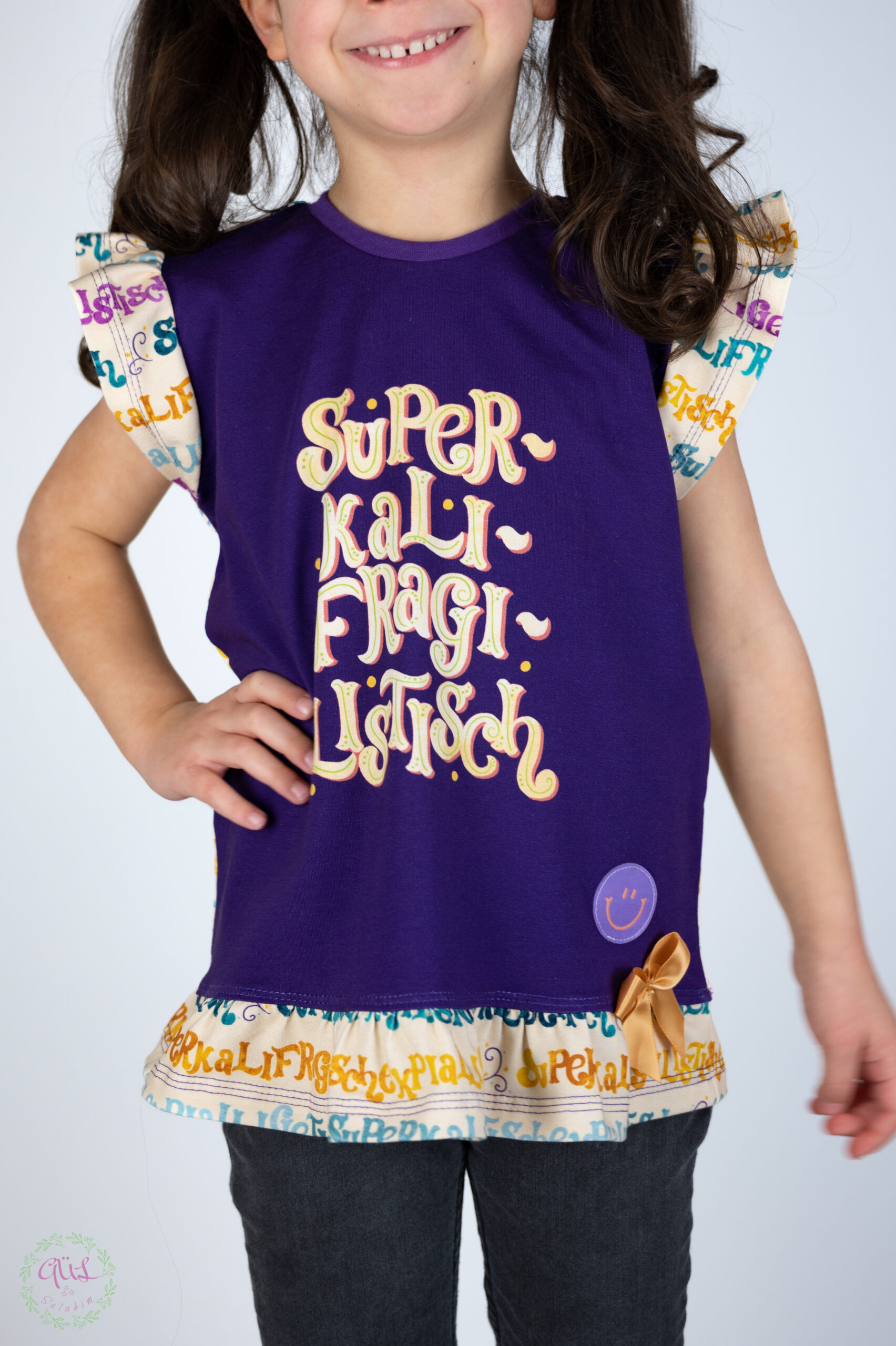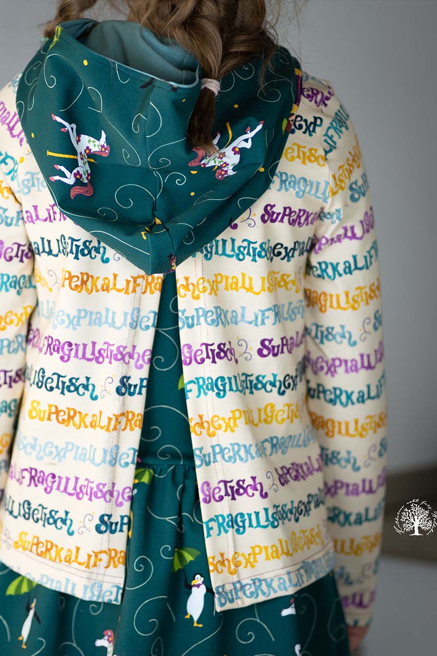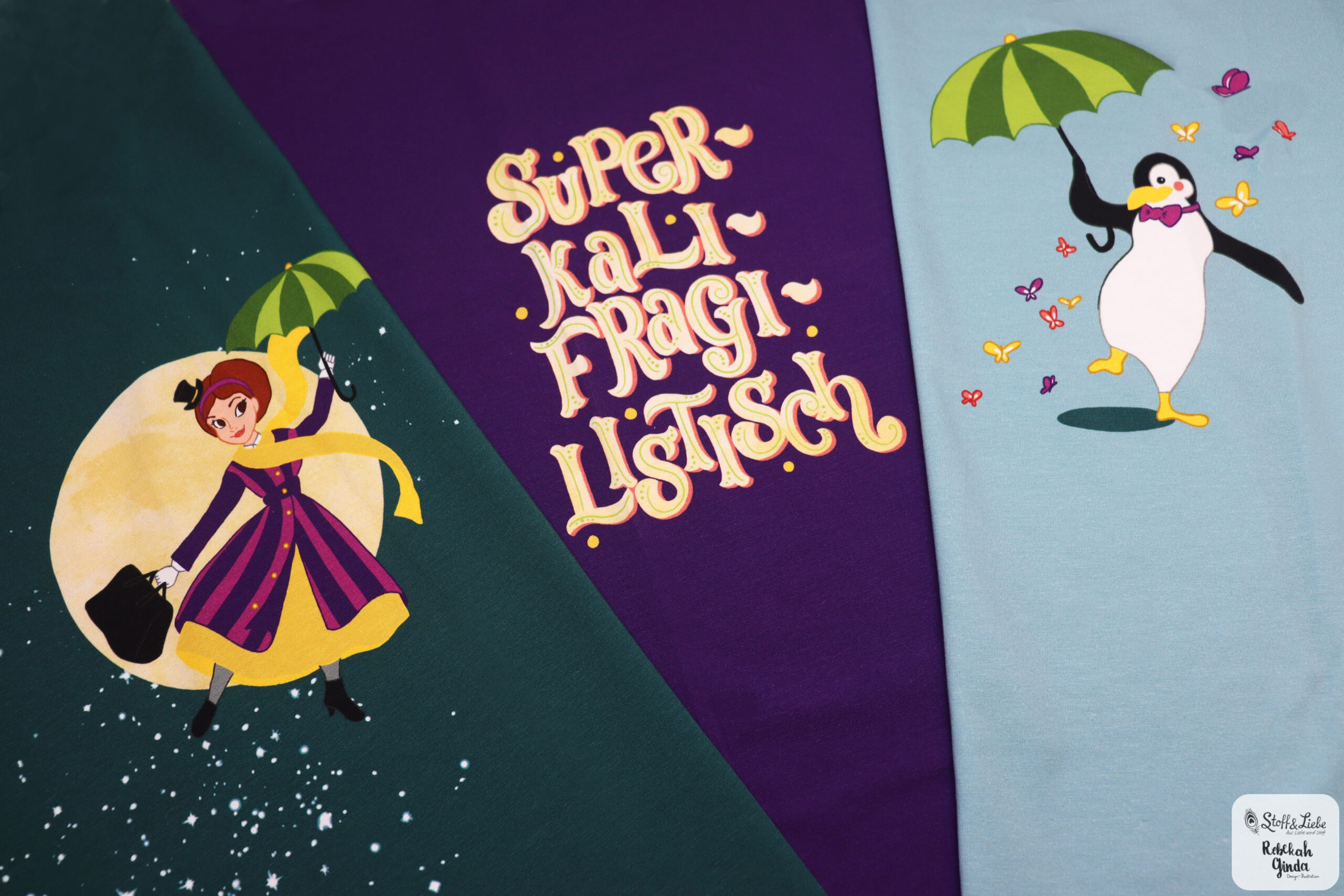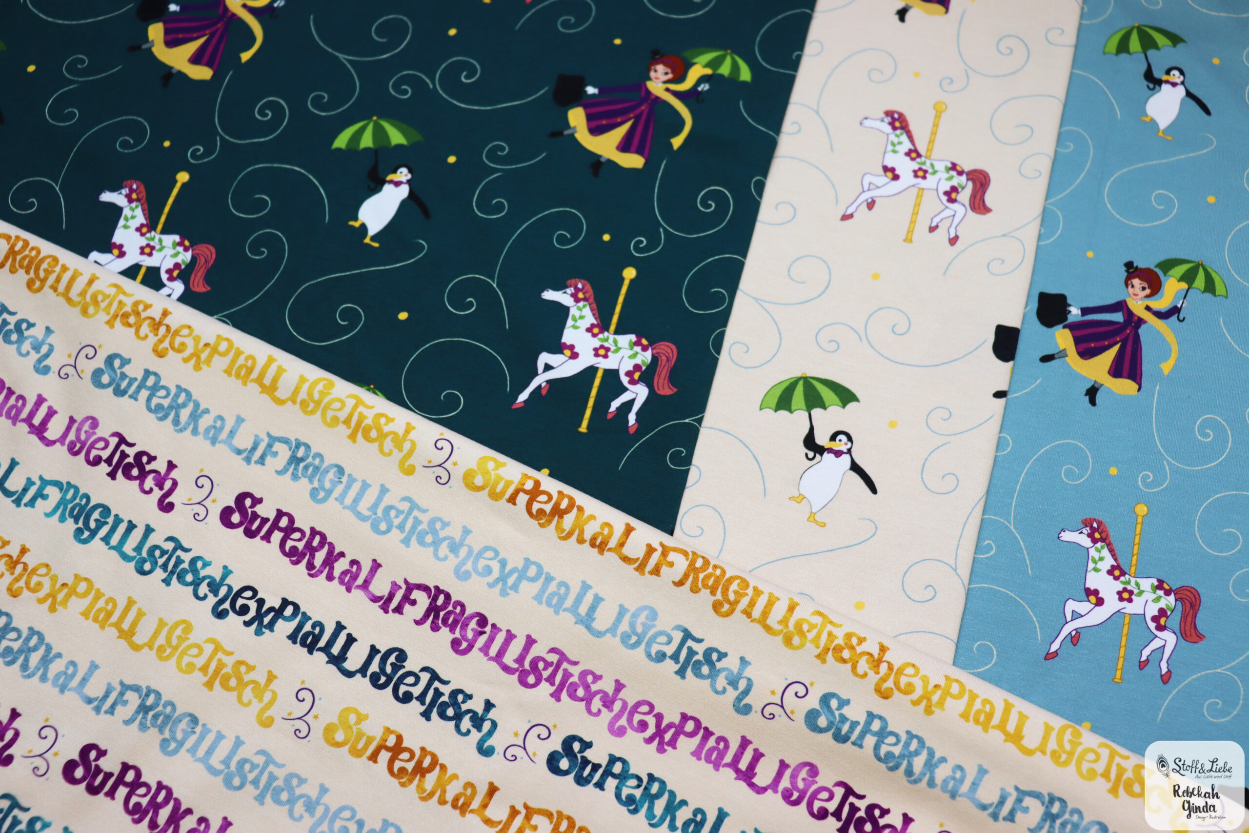 Das Panel hat eine Höhe von ca. 60 cm und bringt Euch drei magisch angehauchte Motive auf wundervollen Farben mit. Während Ihr den Schriftzug „Superkalifragilistisch“ auf einem tollen Lila findet, habt Ihr das Motiv der Dame mit dem Schirm, welche von Glitzer umgeben ist, auf einem kräftigen Petrol und den Pinguin umrahmt von Schmetterlingen auf einem Hellblau.
