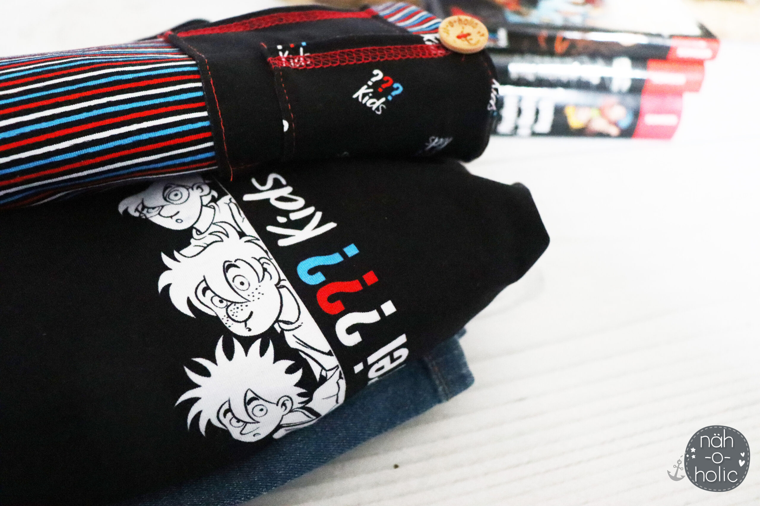 Ebenfalls neu dabei sind die „Fragestreifen“. Unsere Cannelloni im Look von Justus, Peter & Bob gefüllt. Genau wie die Fragezeichen und Punkte lassen sie sich toll zu den anderen Stoffen kombinieren. Allerdings sind sie auch eine tolle Grundlage für einen z.B. Plott oder Stickerei.