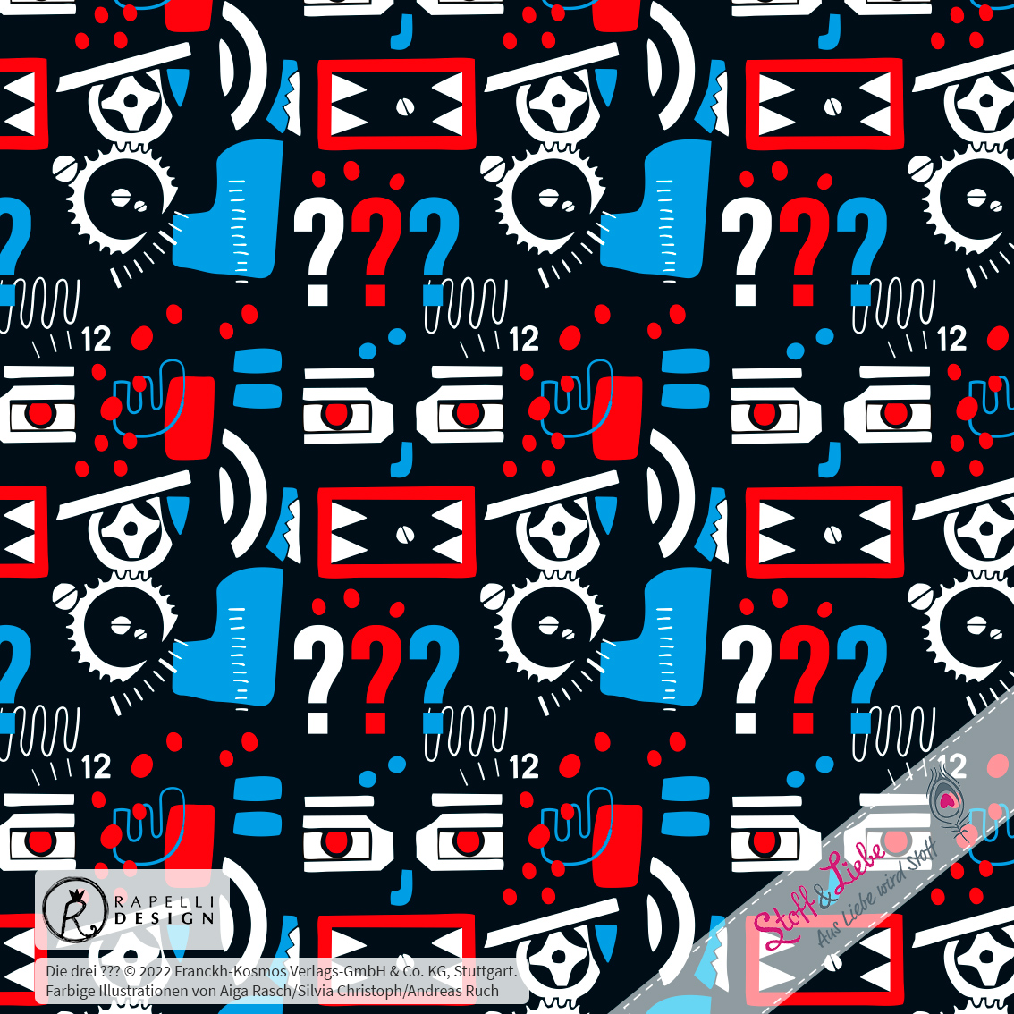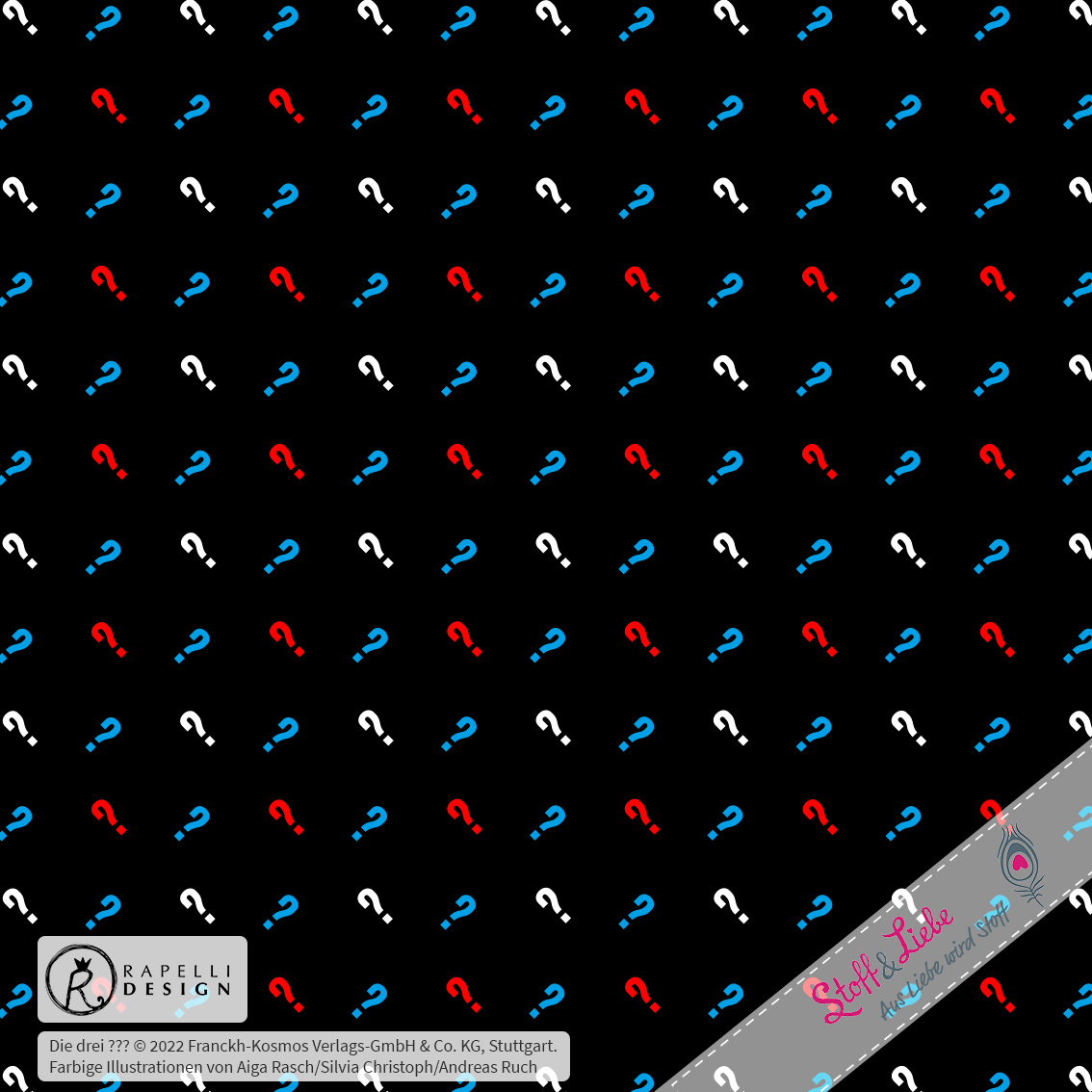 Auch bei dieser Kollektion wieder dabei: Fragezeichen.  Diese dürfen auch keinen Fall fehlen, oder? Das wäre ja wie Rocky Beach ohne Fred Fireman. Die Fragezeichen (Höhe ca. 1,3 cm) in den typischen Farben verstreut über den ganzen Stoff. Wie Ihr erkennen könnt, sind sie leicht modifiziert im Gegensatz zu den Fragezeichen der ersten Kollektion. Hier könnt Ihr so richtig kreativ werden und Euch austoben. Ach, was freuen wir uns schon auf Eure Nähwerke. Ihr habt doch bestimmt schon Ideen, oder?
