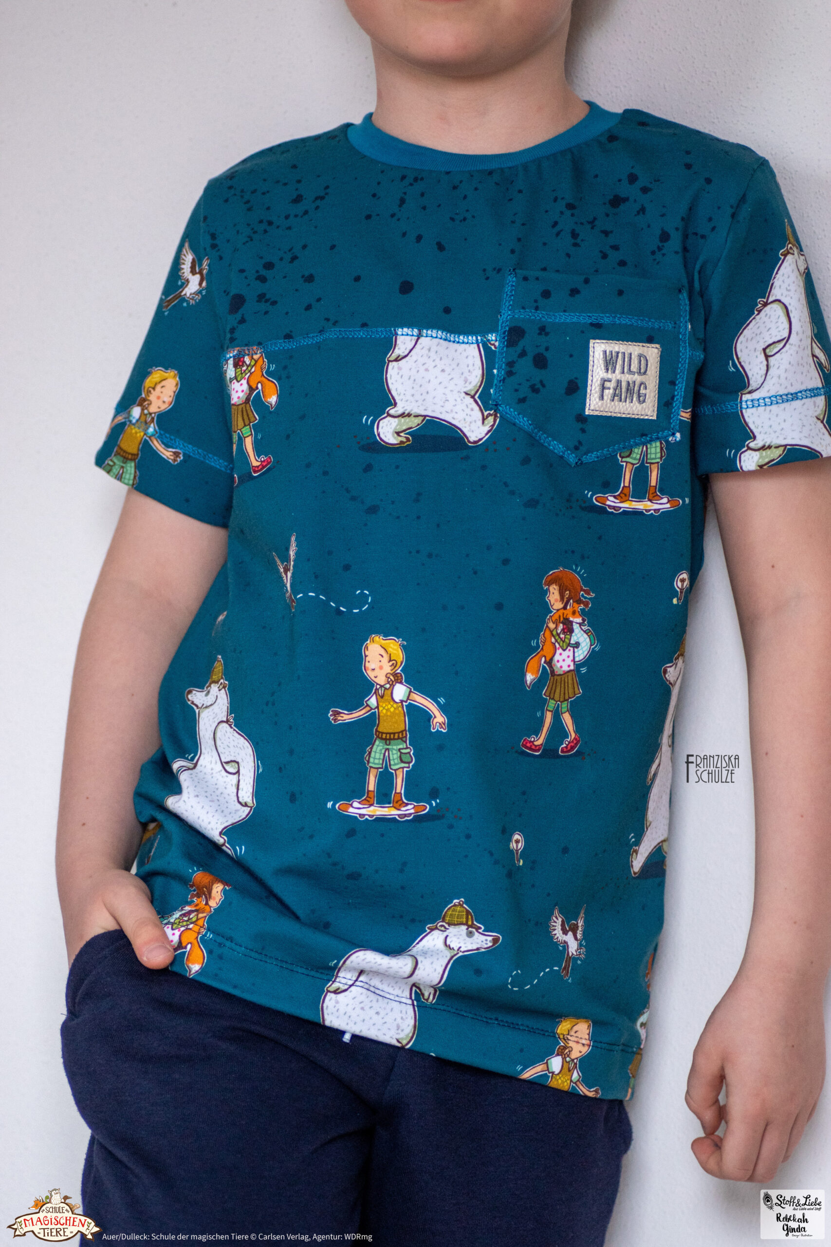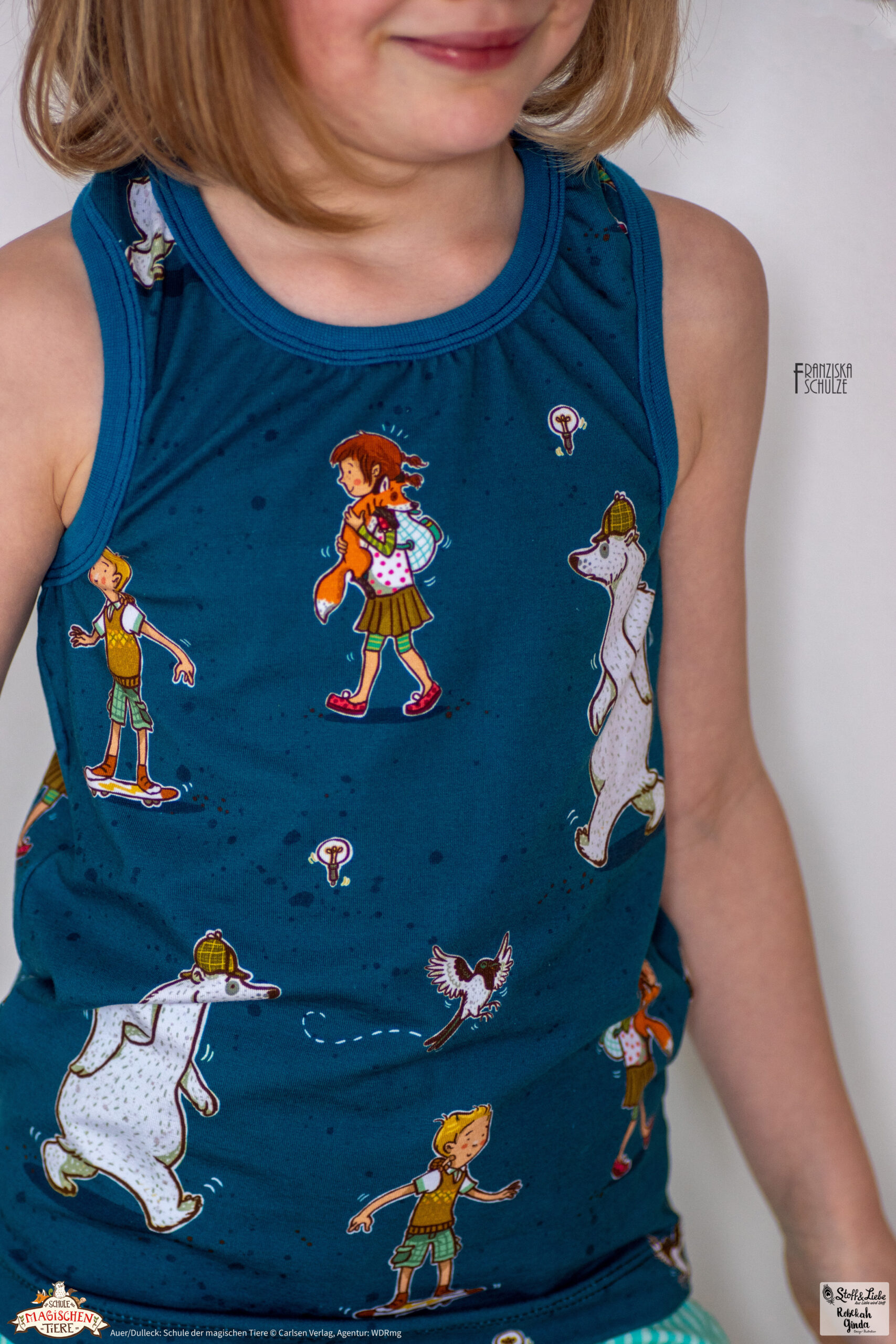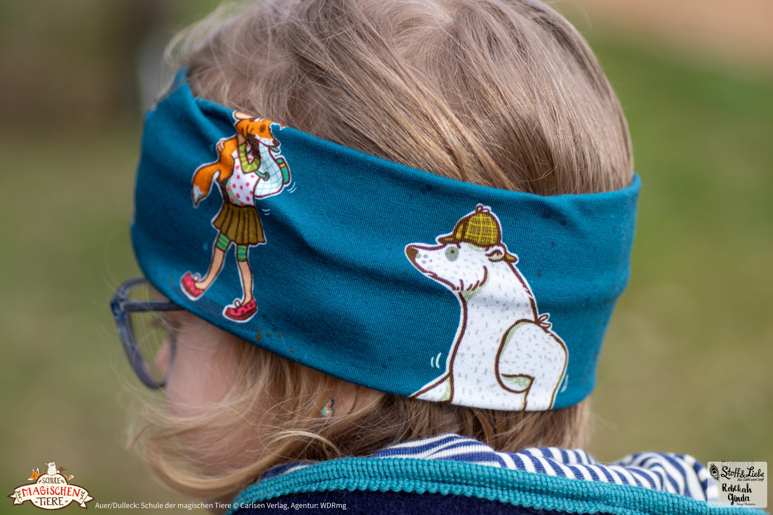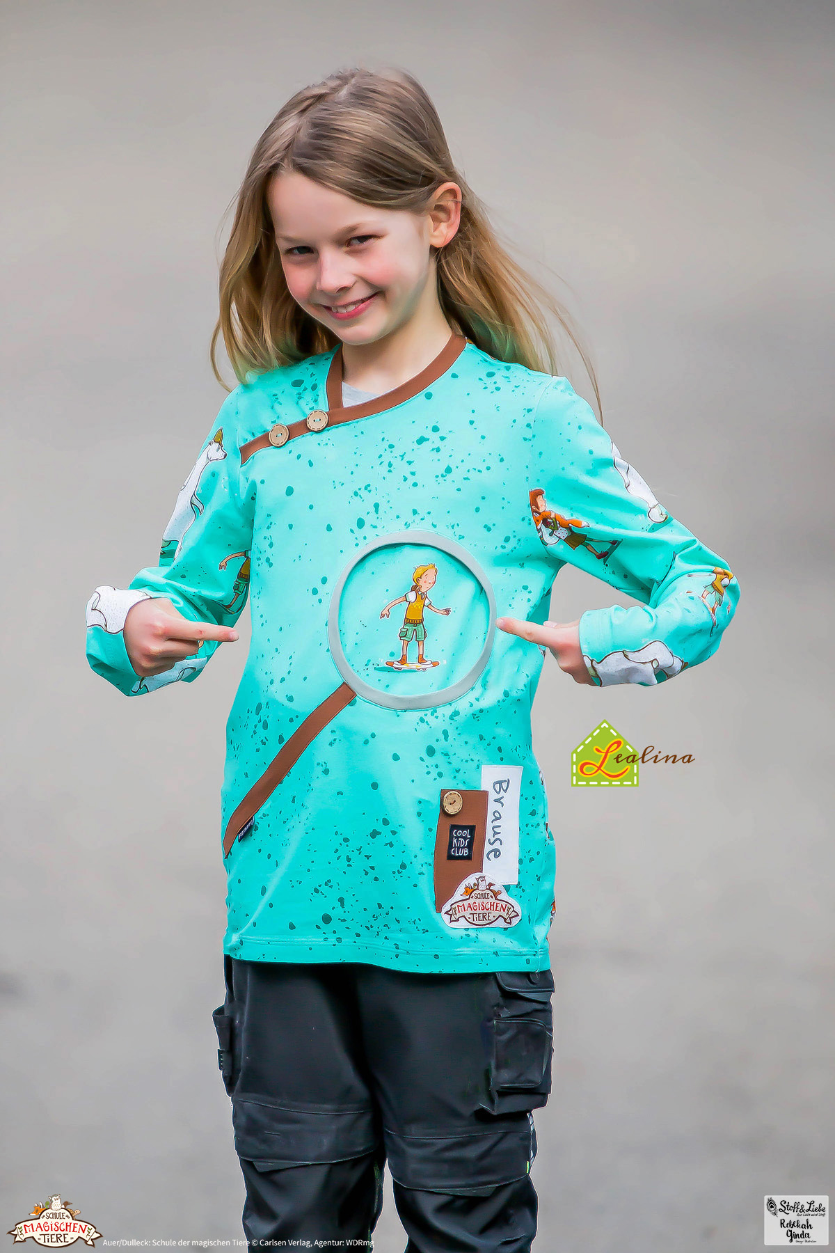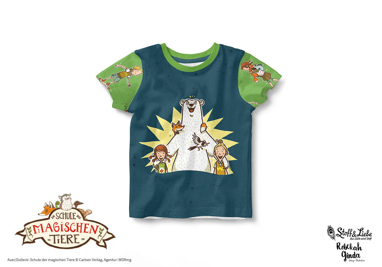Die Blockstreifen kennt Ihr schon aus unserer ersten „Die Schule der magischen Tiere“ Kollektion. Sie sind mit knapp ca. 5 cm Breite ein echter Hingucker! Sie eignen sich, wie alle unsere Kombistoffe, nicht nur super zum Kombinieren, sondern machen auch alleine vernäht eine tolle Figur. Wir haben sie für Euch diesmal in zwei absolut passenden Farbstellungen: Mint-Petrol und Grün.