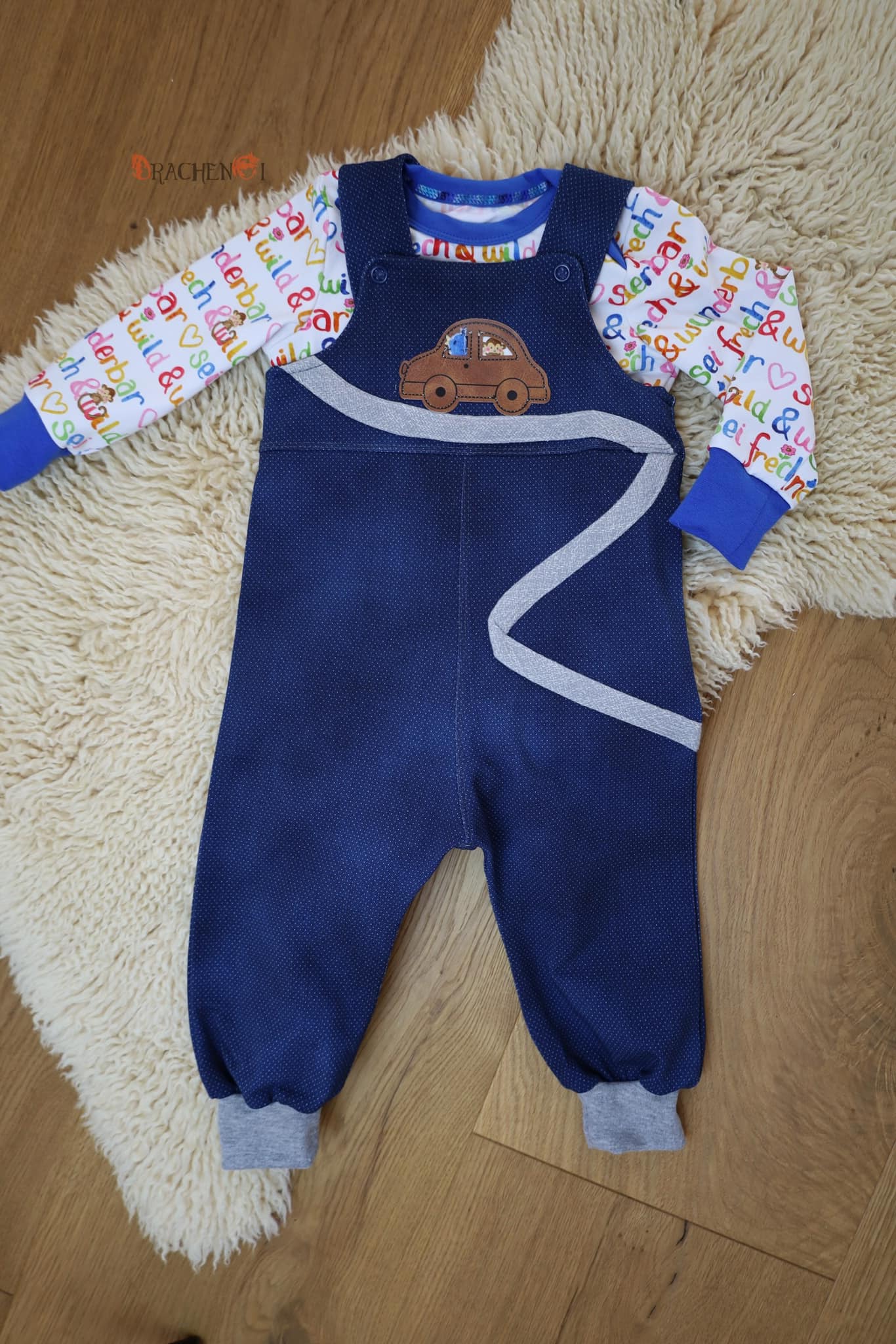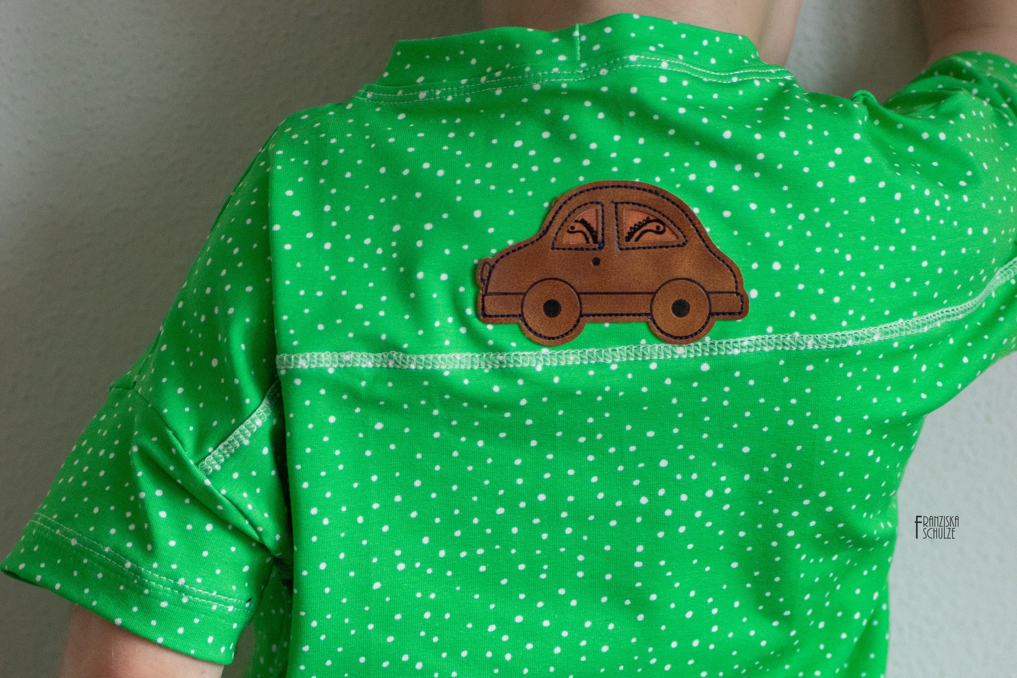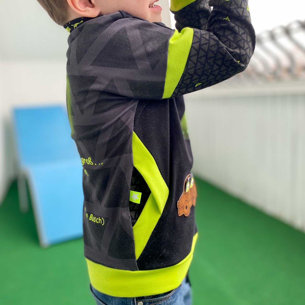 zusätzlich mit der Nähmaschine fest. Bei den tollen Fahrzeug-Labeln bietet sich dafür die schwarze Umrandungslinie super an, dann sieht man die Naht nämlich hinterher kaum.
