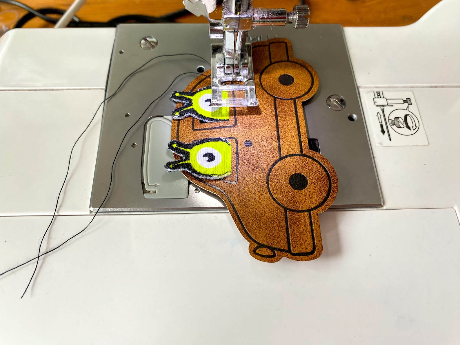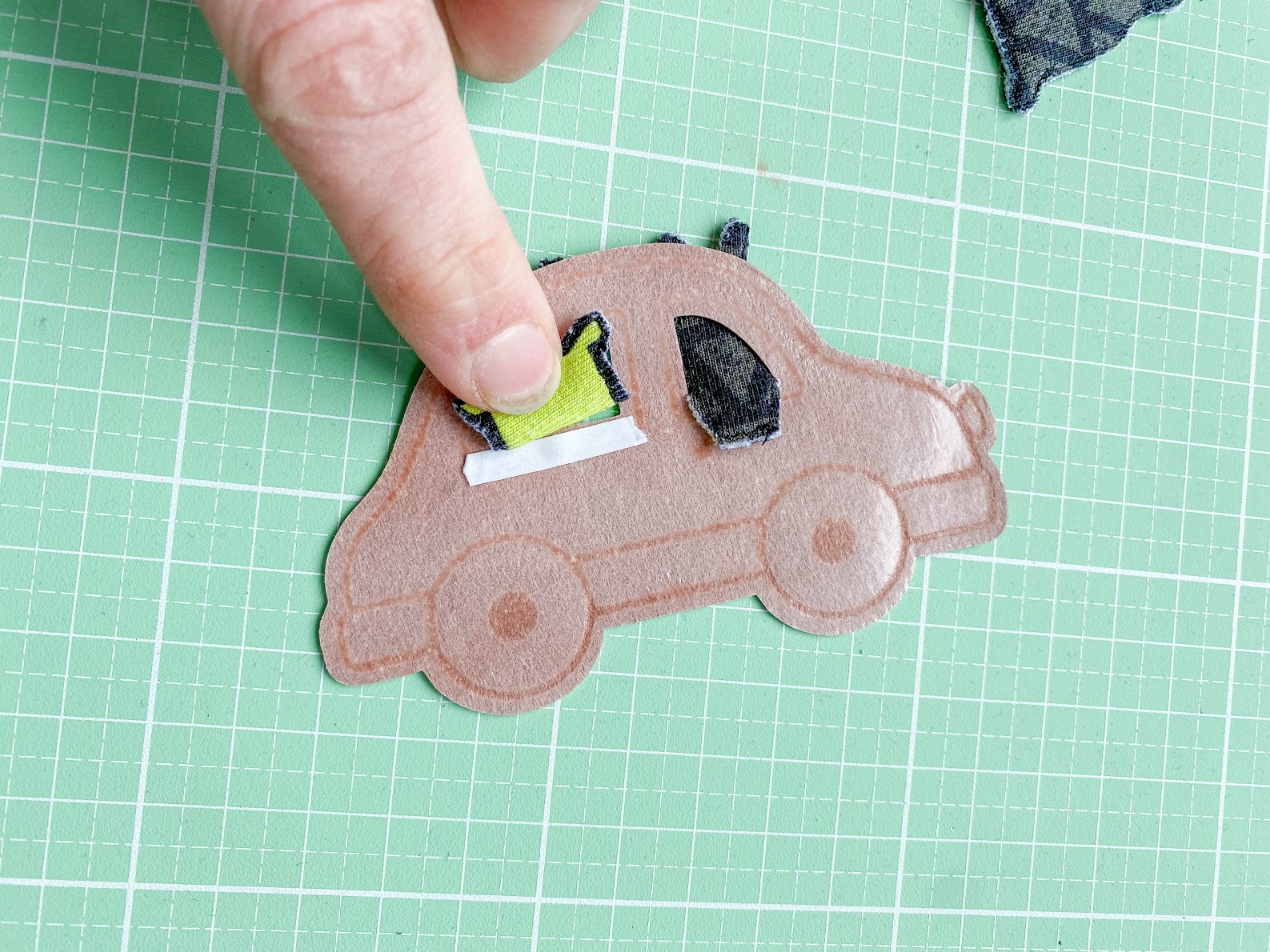 Im Anschluss näht Ihr mit einem kurzen Gradstich über die untere Linie des Autofensters und fixiert so die Figuren am Wagen, damit beim Annähen der Applikation wirklich gar nichts mehr verrutschen kann.