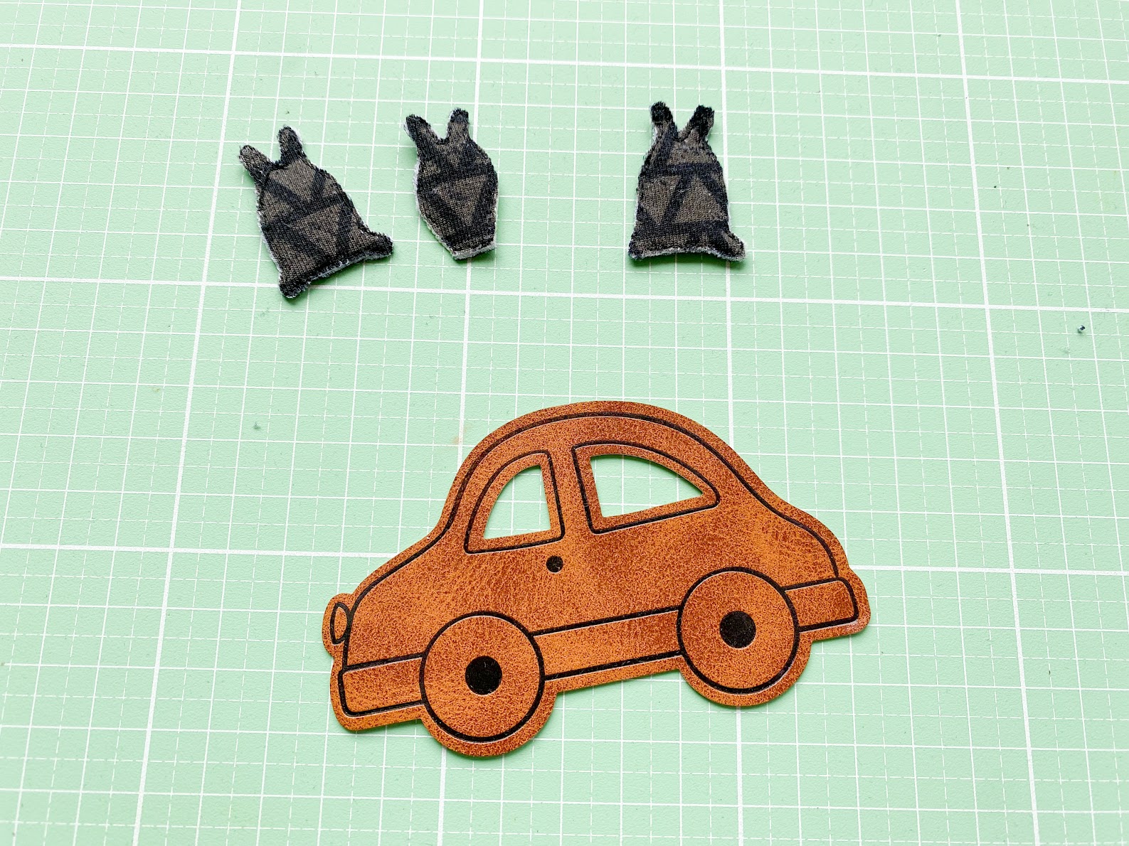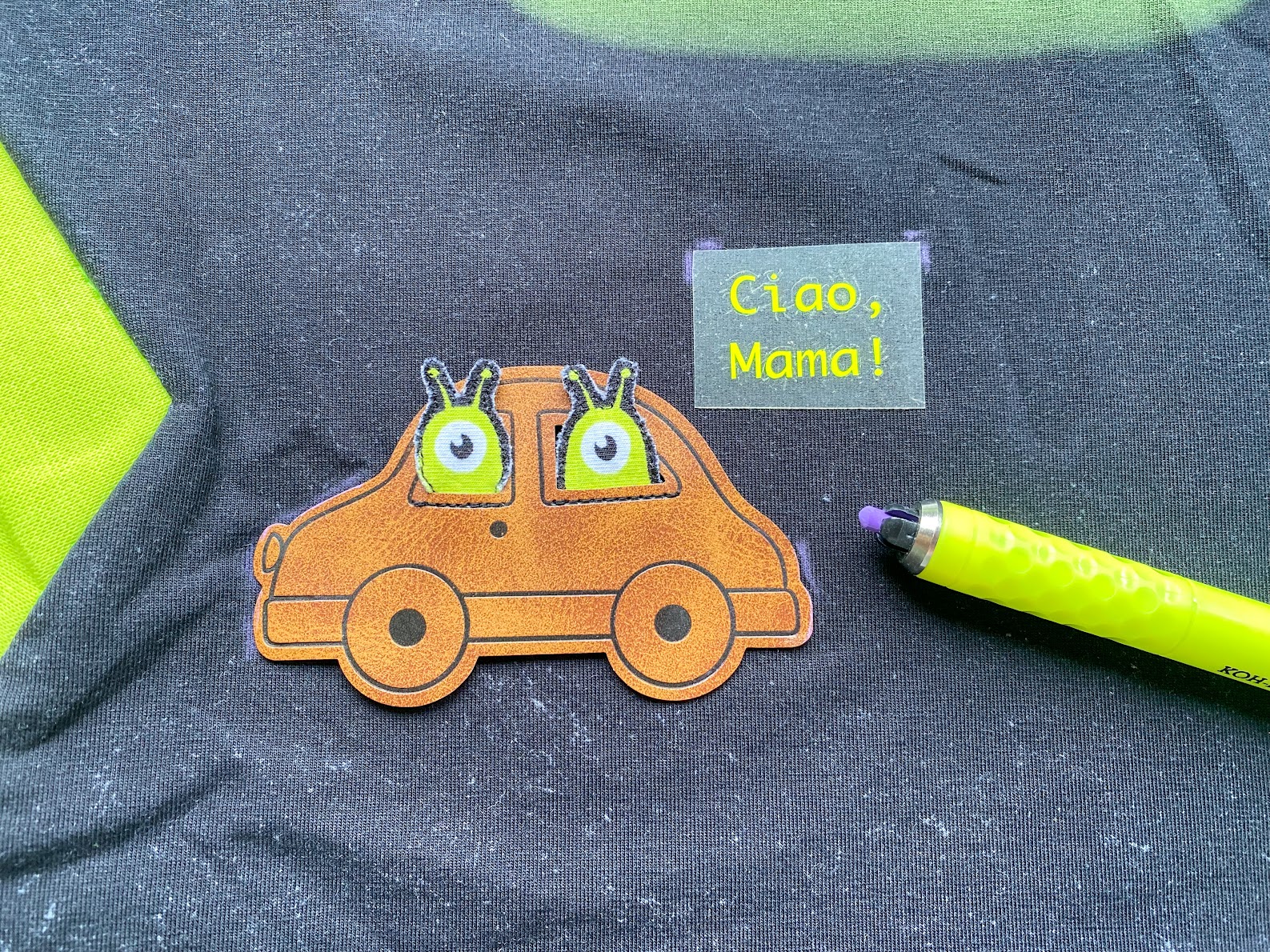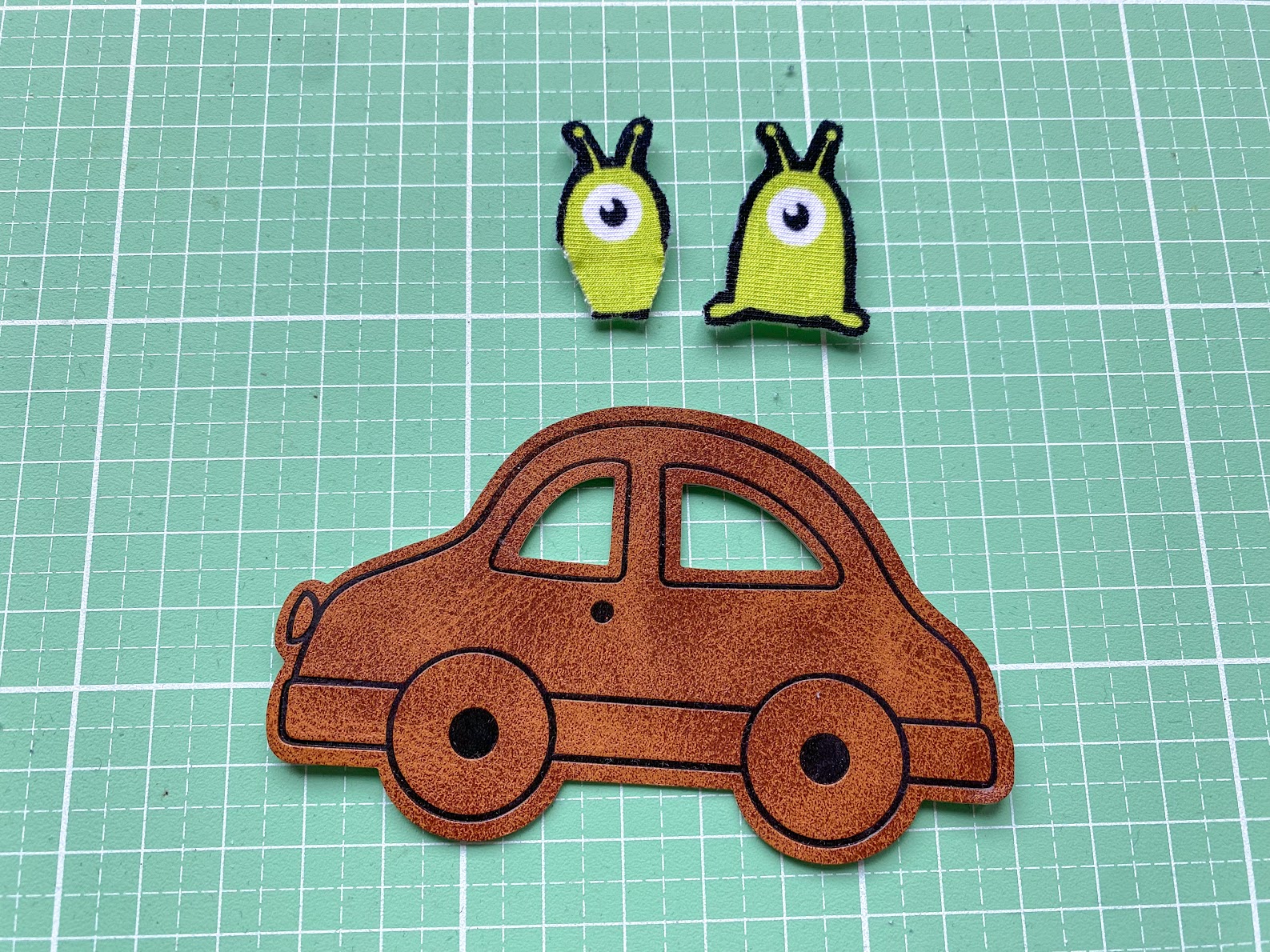 Ich schneide dafür das Vlies an den Rändern leicht schräg zurück und kürze somit den Flausch ein bisschen ein. Außerdem könnt Ihr an dieser Stelle Eure Motive einmal zur Probe durch das Autofenster schauen lassen, um zu sehen, ob Ihr eventuell die Form etwas anpassen müsst. Ich hab beispielsweise ein Alien ein bisschen geschmälert, damit es besser passte.