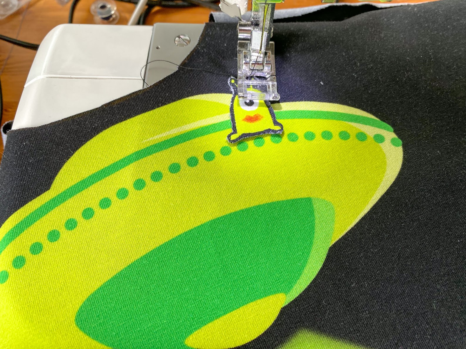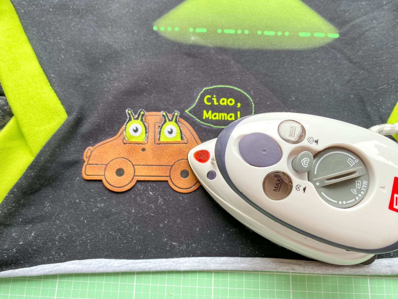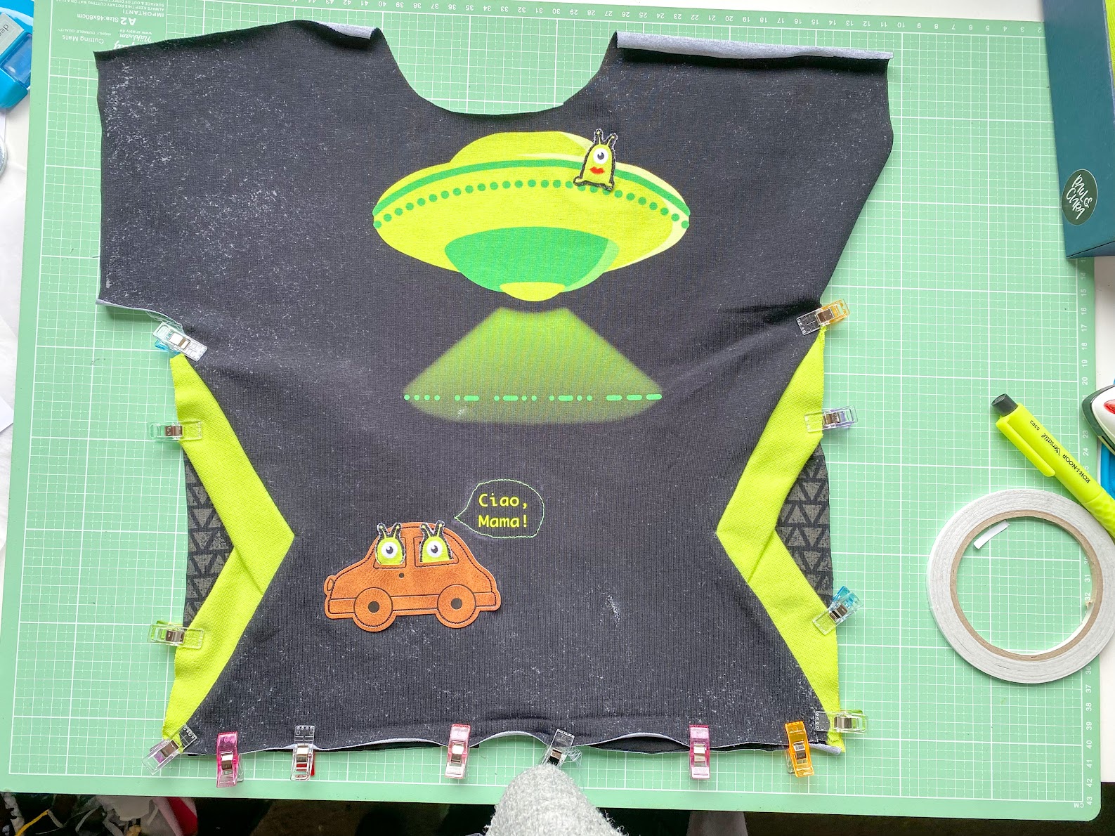 Um meine Panel-Geschichte zu vervollständigen, nähe ich jetzt noch den dritten Alien auf das Ufo. Dafür helfe ich mir auch hier mit ein bisschen Wondertape, damit beim Annähen nichts verrutscht.