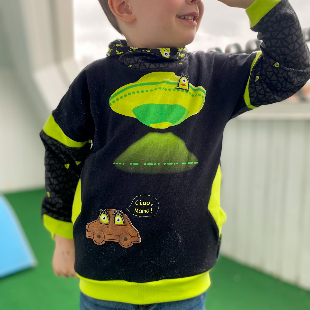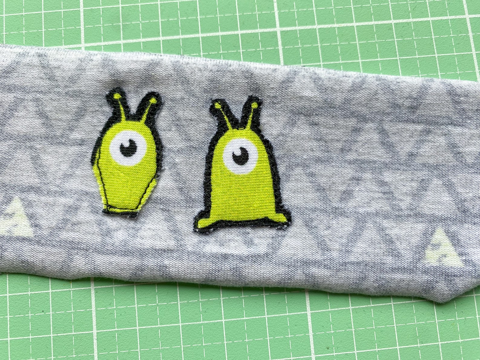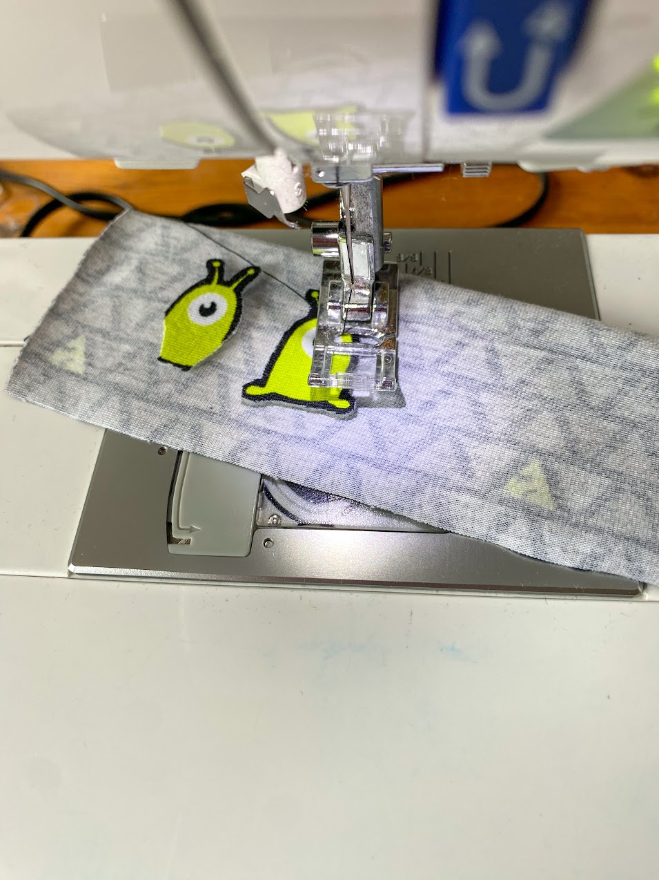 Um meine Panel-Geschichte zu vervollständigen, nähe ich jetzt noch den dritten Alien auf das Ufo. Dafür helfe ich mir auch hier mit ein bisschen Wondertape, damit beim Annähen nichts verrutscht.