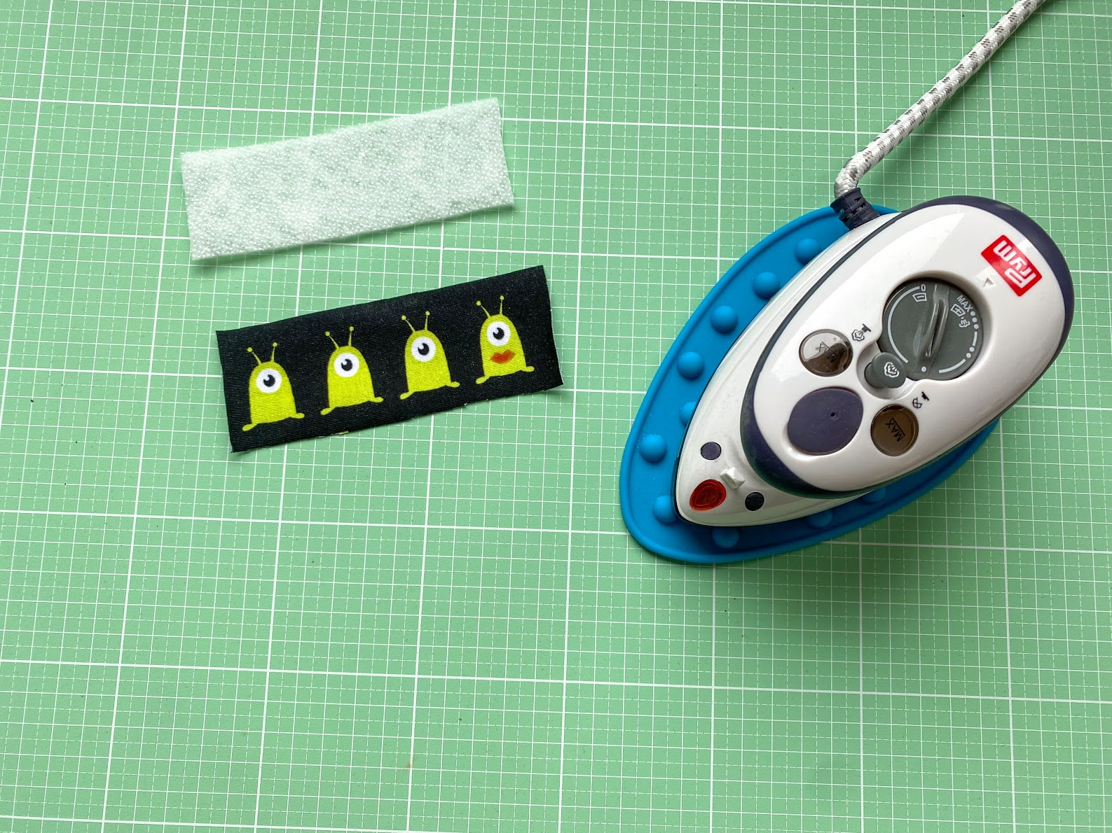 Dafür nehmt Ihr Eure grob ausgeschnittenen Motive und bügelt sie auf Volumenvlies. Achtet darauf, dass die Hitze Eures Bügeleisens nicht zu heiß ist und Ihr Euch nicht das Projekt kaputt macht, bevor es richtig losgegangen ist. Die gepunktete Klebeseite legt Ihr dabei auf die linke (unschöne) Stoffseite, legt ein dünnes Tuch (z.B. ein Küchenhandtuch) darauf und bügelt kurz darüber. Testet, ob der Kleber sich auch richtig verbunden hat, sonst habt Ihr später ein Problem, weil Vlies und Stoff sich wieder voneinander lösen.