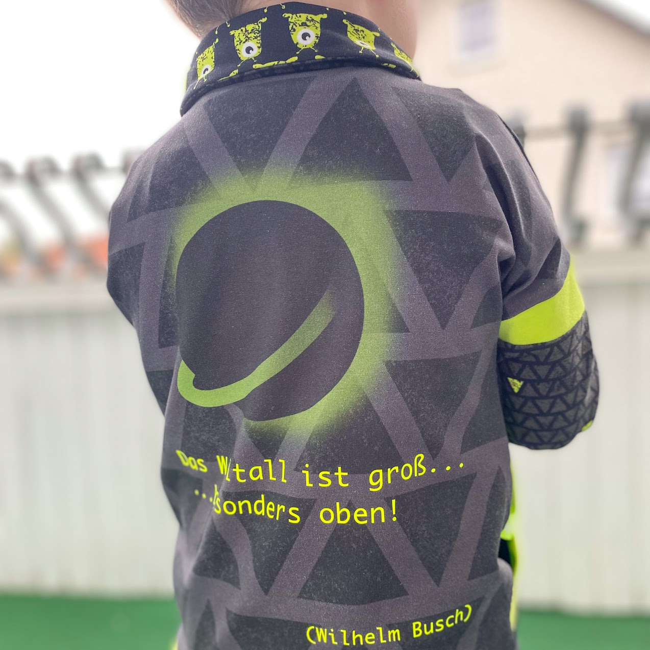 Jetzt geht’s ans Aufnähen des Labels. In meinem Fall habe ich mir eine ganze Geschichte zum Panelbild und zur Applikation mit den „Friends from Mars“ ausgedacht und deshalb noch einen kleinen Plott gestaltet, den ich auch verwenden möchte.