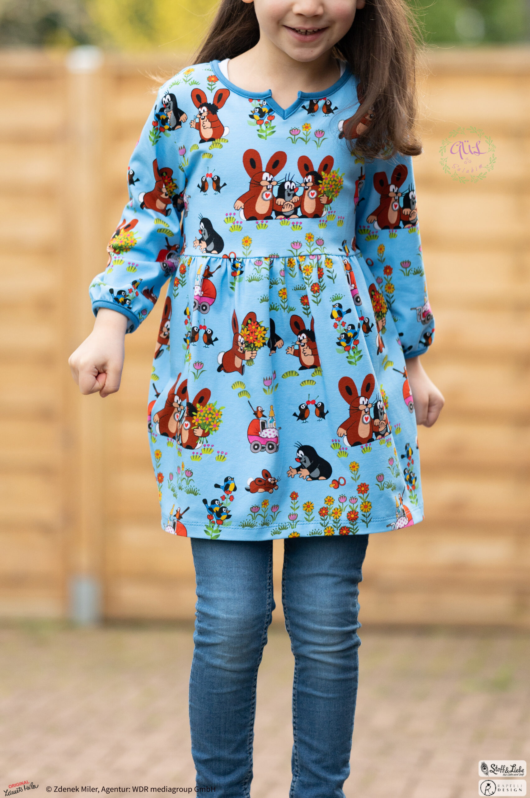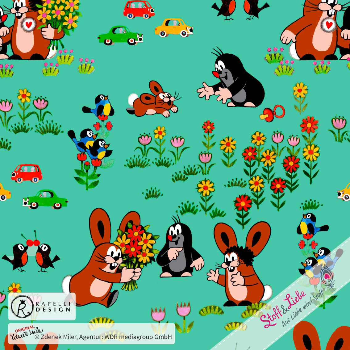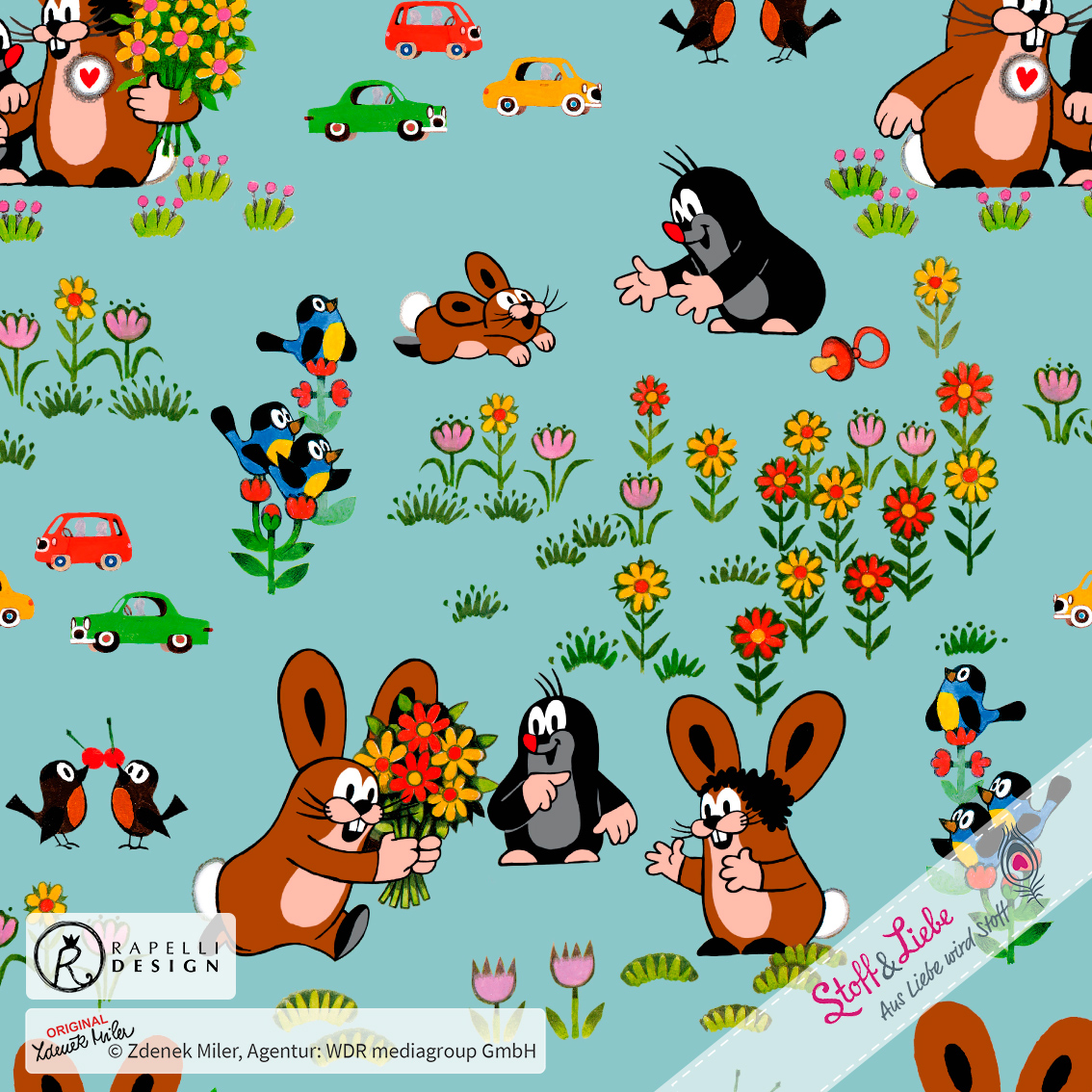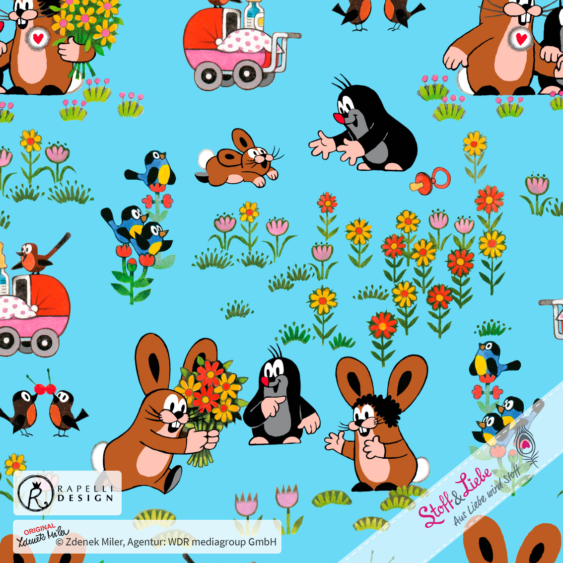 Das Panel hat eine Höhe von ca. 60 cm und ist abgestimmt auf alle weiteren Stoffe der Kollektion. Ihr findet den Maulwurf und seine Freunde auf Rosa, Blau und Grün. Durch die enthaltenen Farben, stehen Euch jede Menge Möglichkeiten offen, mit Unistoffen zu kombinieren.