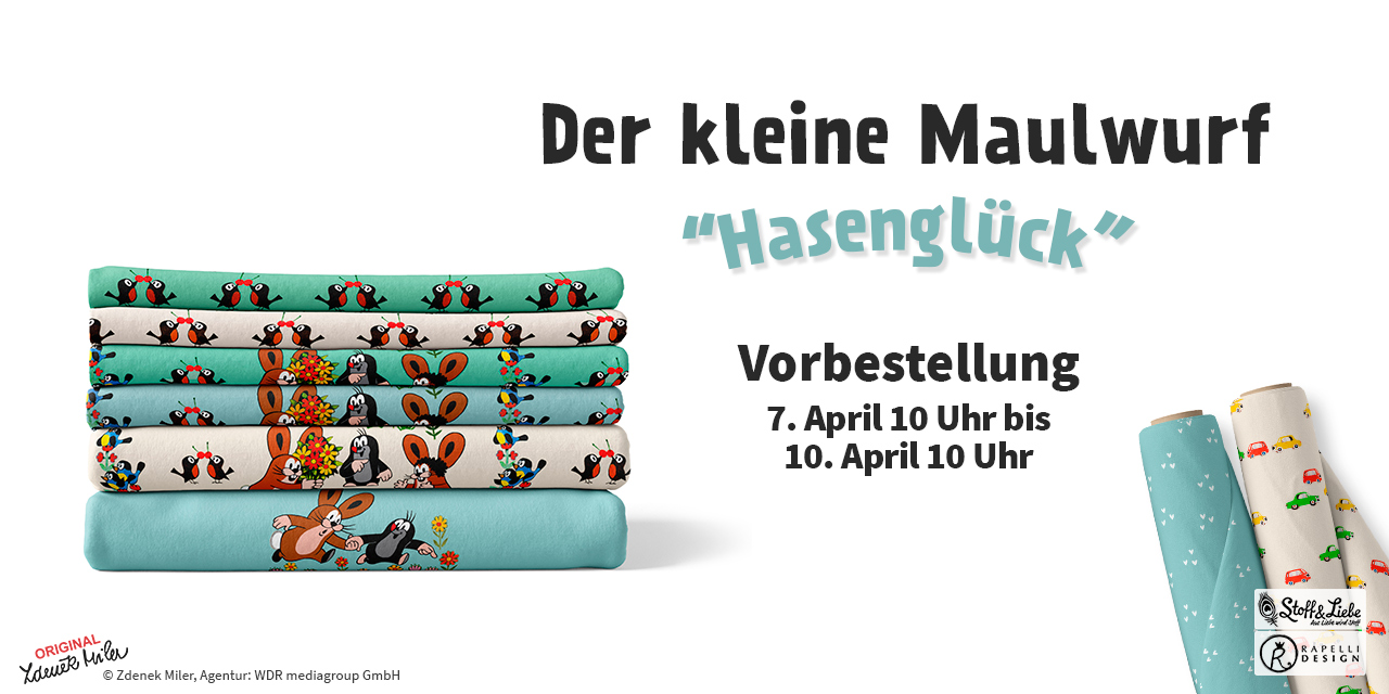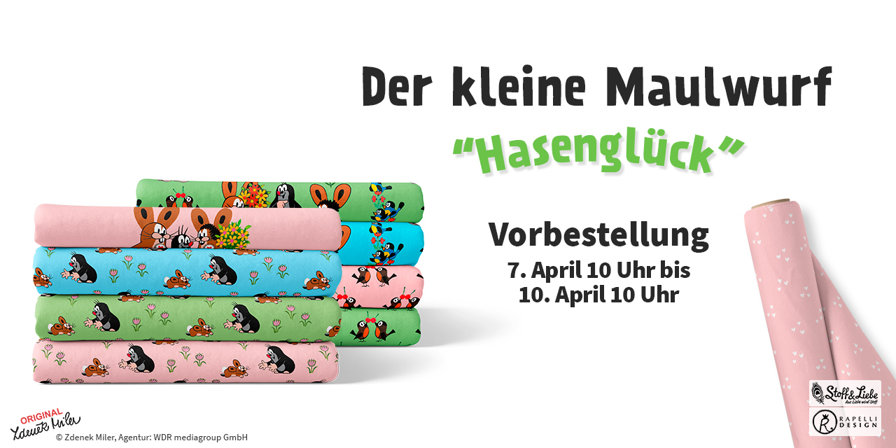Die Sonne scheint, die Vögel zwitschern und die Blumen blühen in den schönsten Farben. Der Frühling ist da und der Sommer zum Greifen nah! Grund genug, Euch heute unsere neue Kollektion „Der kleine Maulwurf – Hasenglück“ vorzustellen. Wir haben diesmal direkt zwei Farbgruppen für Euch zusammengestellt. Und wisst Ihr was? Diese Kollektion wird es als Vorbestellung geben. So könnt Ihr Euch ganz in Ruhe alle Stoffe ansehen und auswählen, welche Ihr für Eure Projekte haben möchtet.
