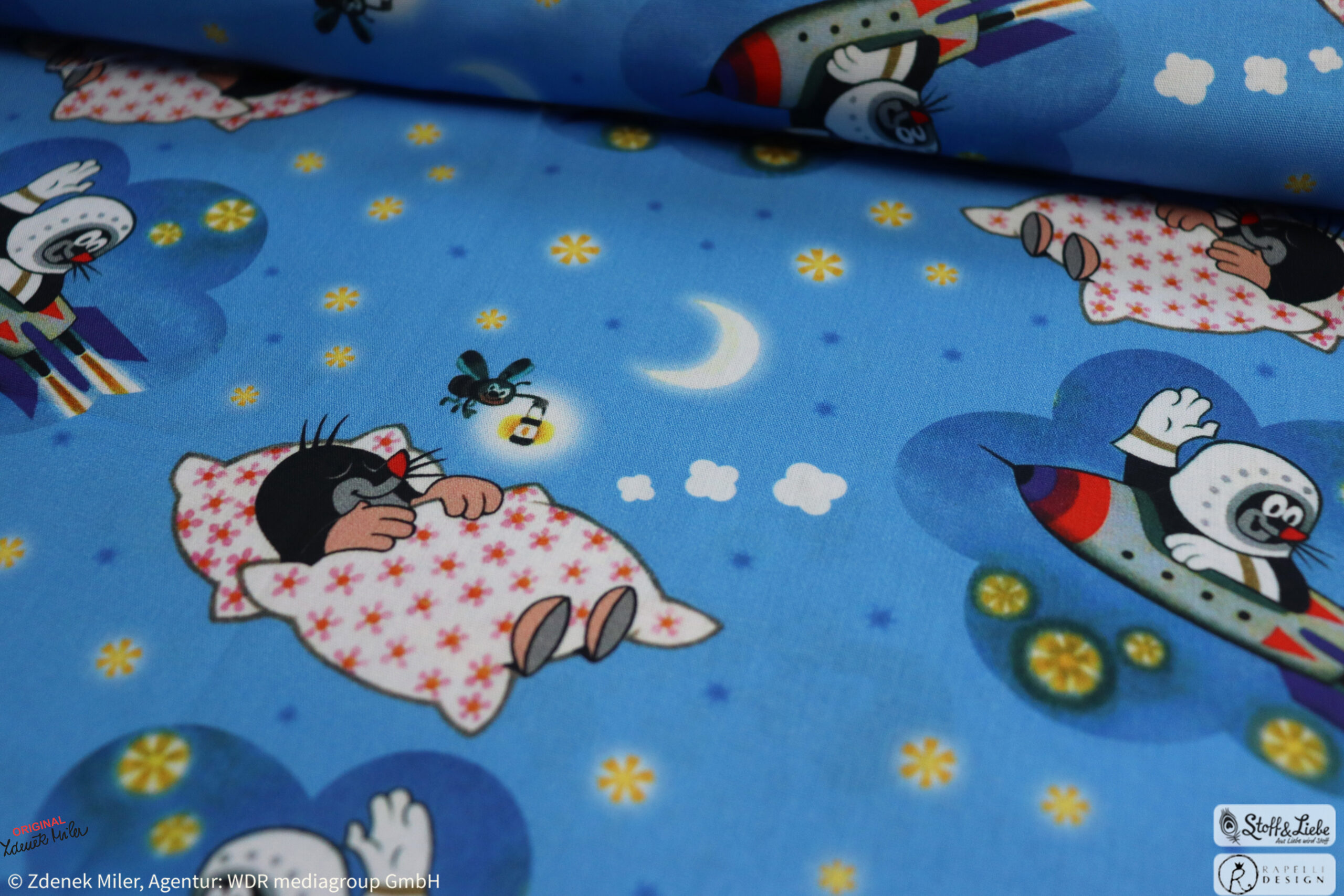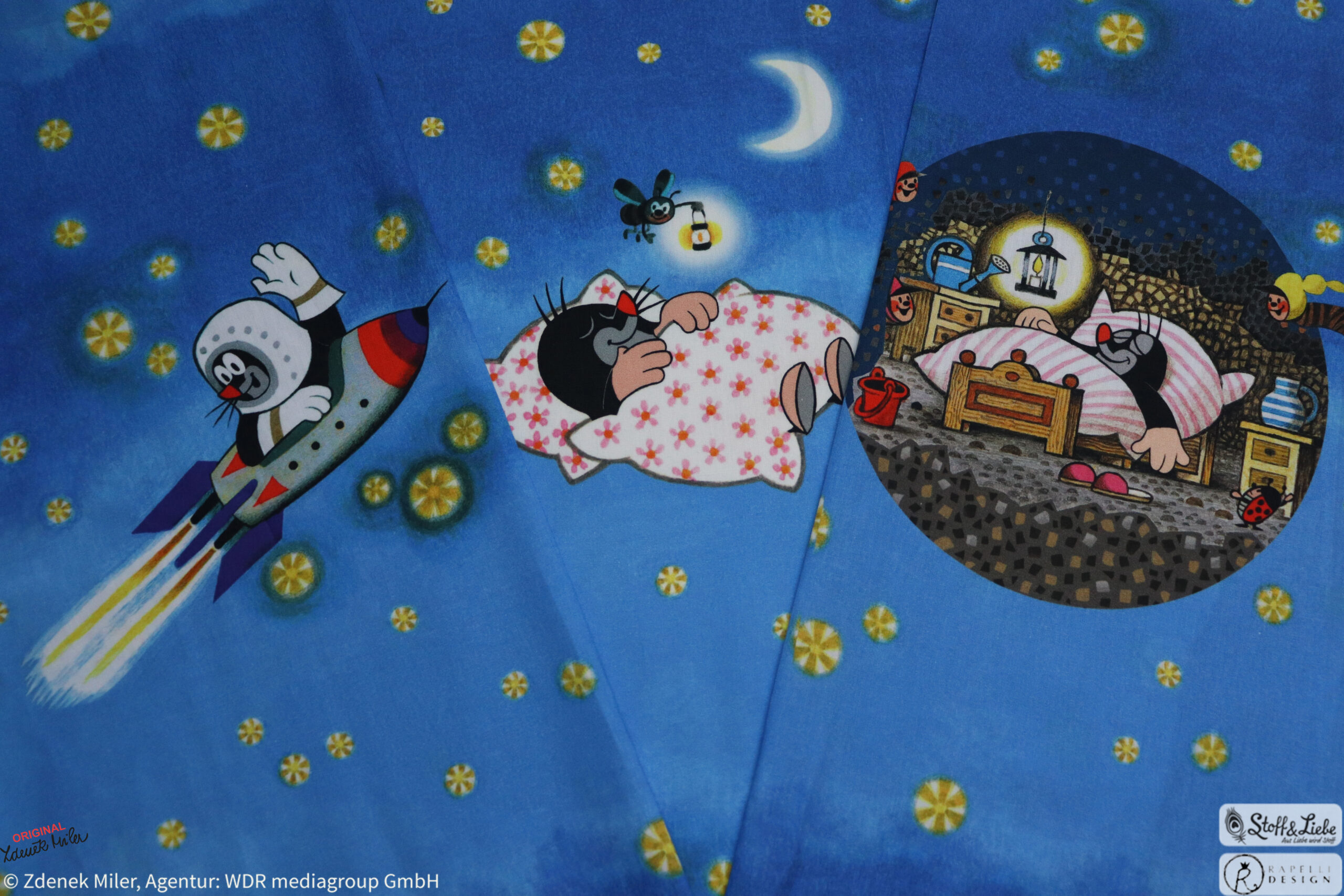 Gute Nacht, kleiner Maulwurf <3 Dieses zuckersüße Design gab es bereits im letzten Jahr bei uns auf Jersey und nun könnt Ihr Euch damit noch einmal so richtig kreativ austoben, denn heute gibt es die Neuauflage auf Popeline. Popeline ist ein dicht gewebtes und robustes, strapazierfähiges Baumwollgewebe, das gleichzeitig sehr atmungsaktiv und hautfreundlich ist. Mit Popeline werdet Ihr viel Freude haben, denn sie ist ähnlich wie z.B. Canvas sehr wandlungsfähig, dabei aber viel leichter und fließender. Daher lässt sich hiermit nicht nur Kleidung, wie Hemden und Blusen nähen, sondern auch Accessoires, Deko und Taschen. Euch stehen also wieder alle Möglichkeiten offen.