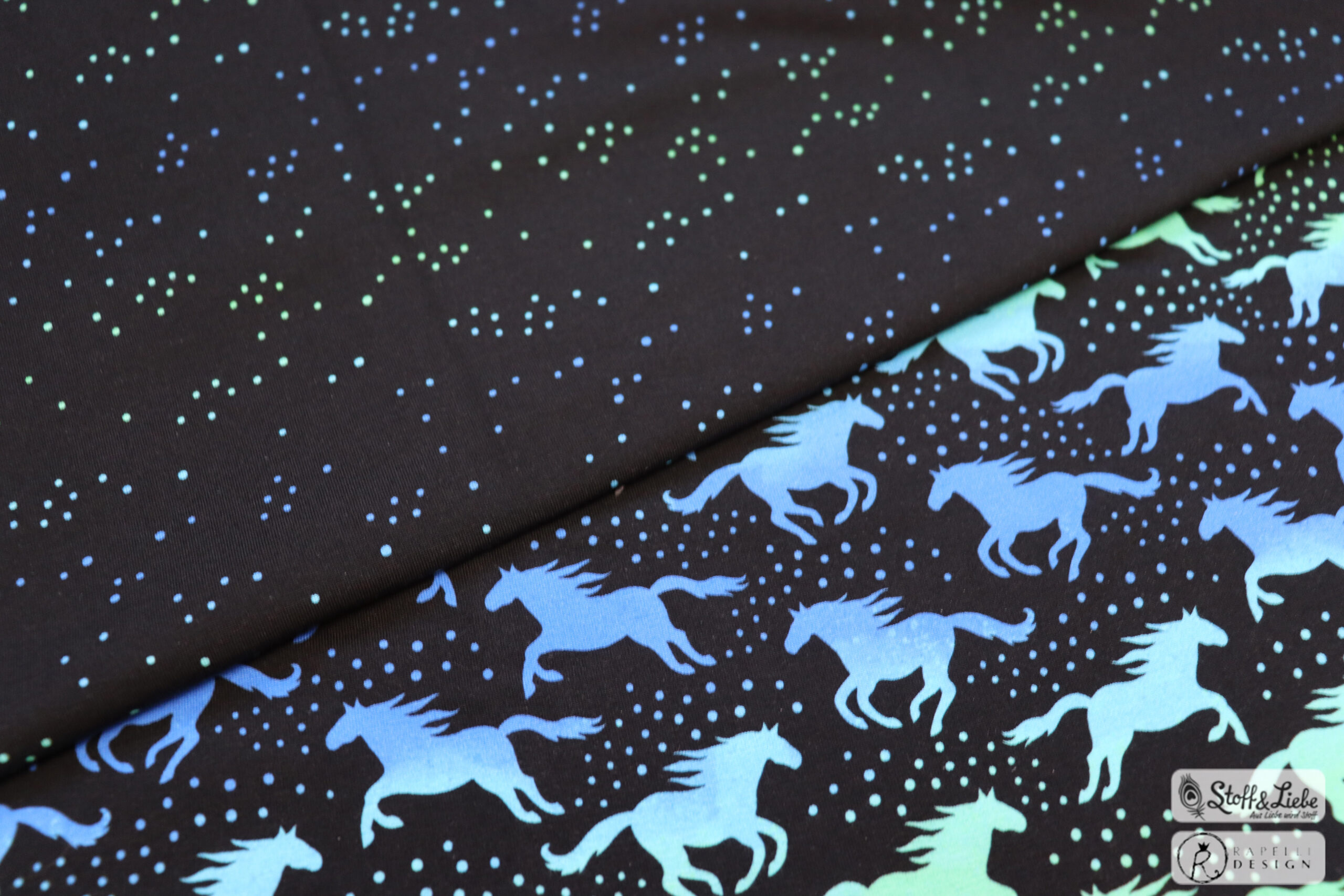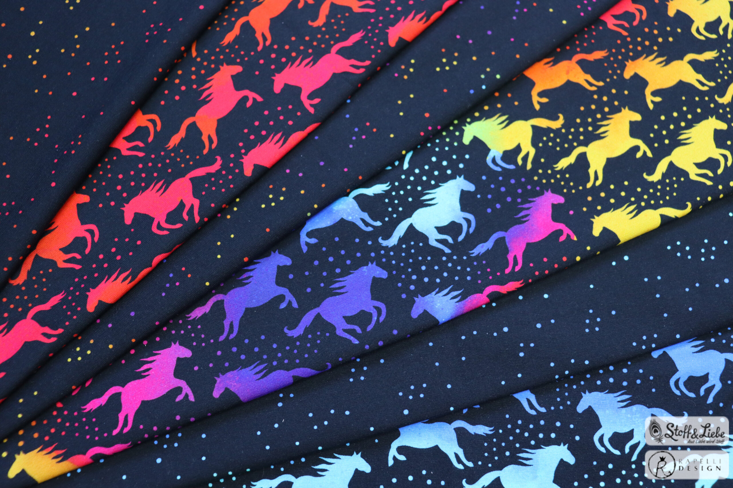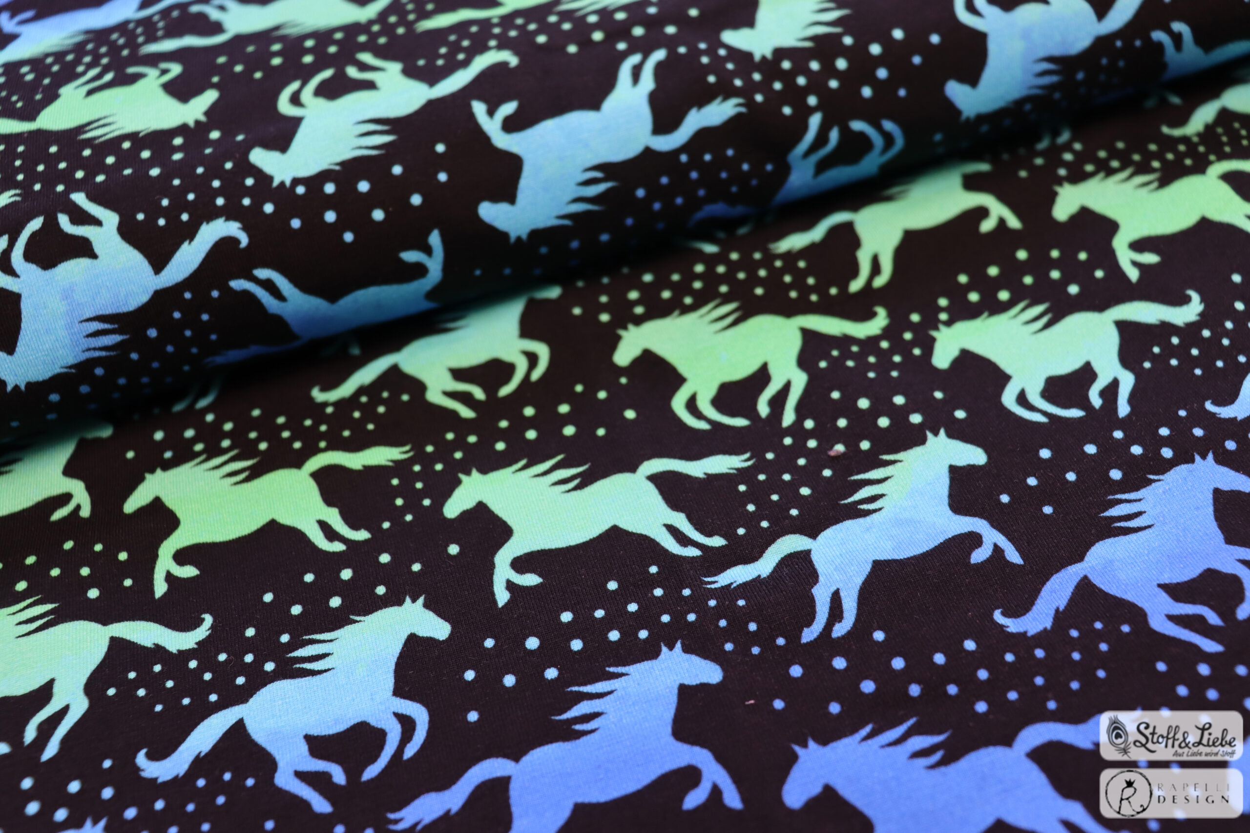 Die Farben und der vor allem dessen Verlauf im Aquarellstile machen sie zum richtigen Hingucker. Die Stoffe erhaltet Ihr auf Jersey und stammt wie alle vorherigen Dreamland Horses Kollektionen aus der Feder von Rapelli Design.