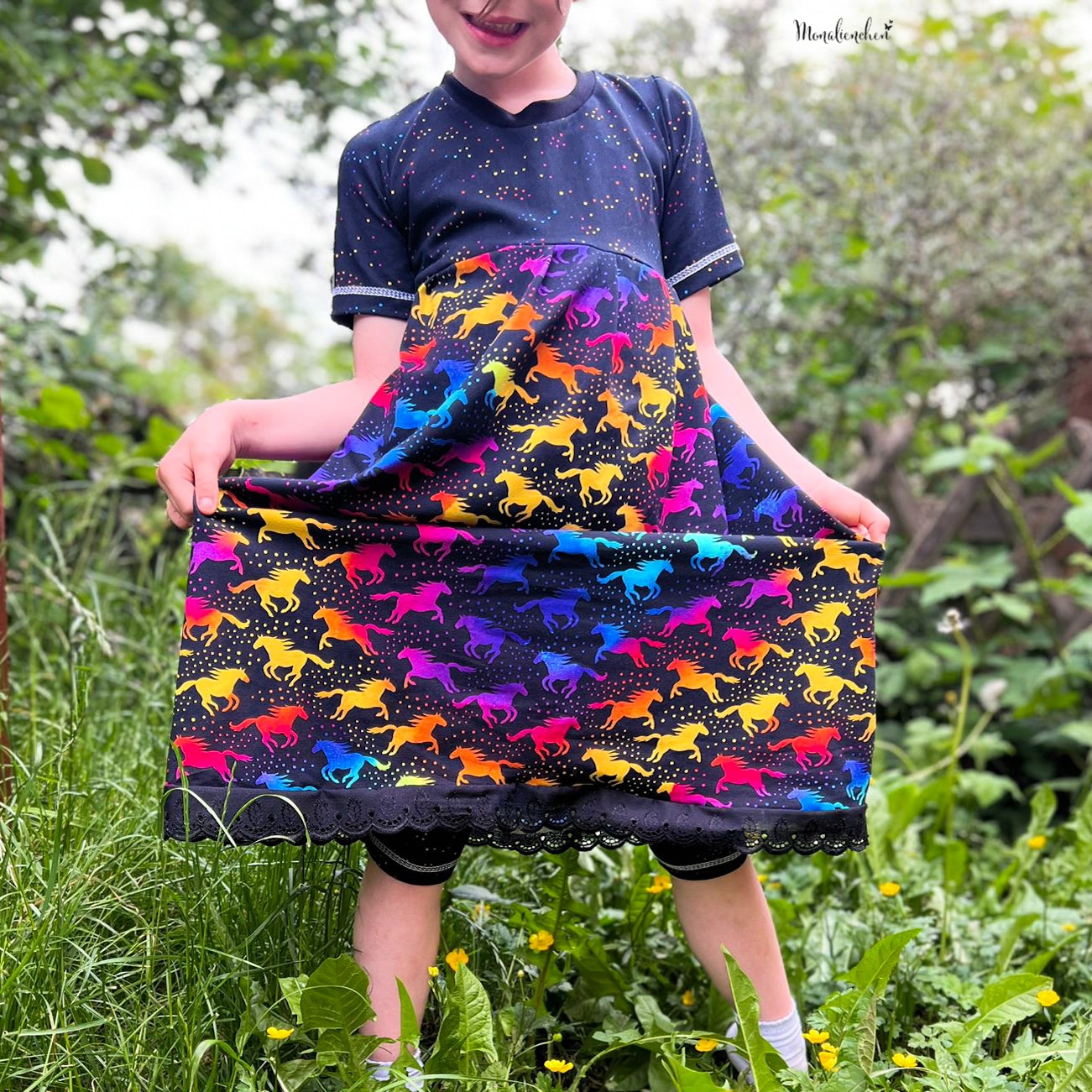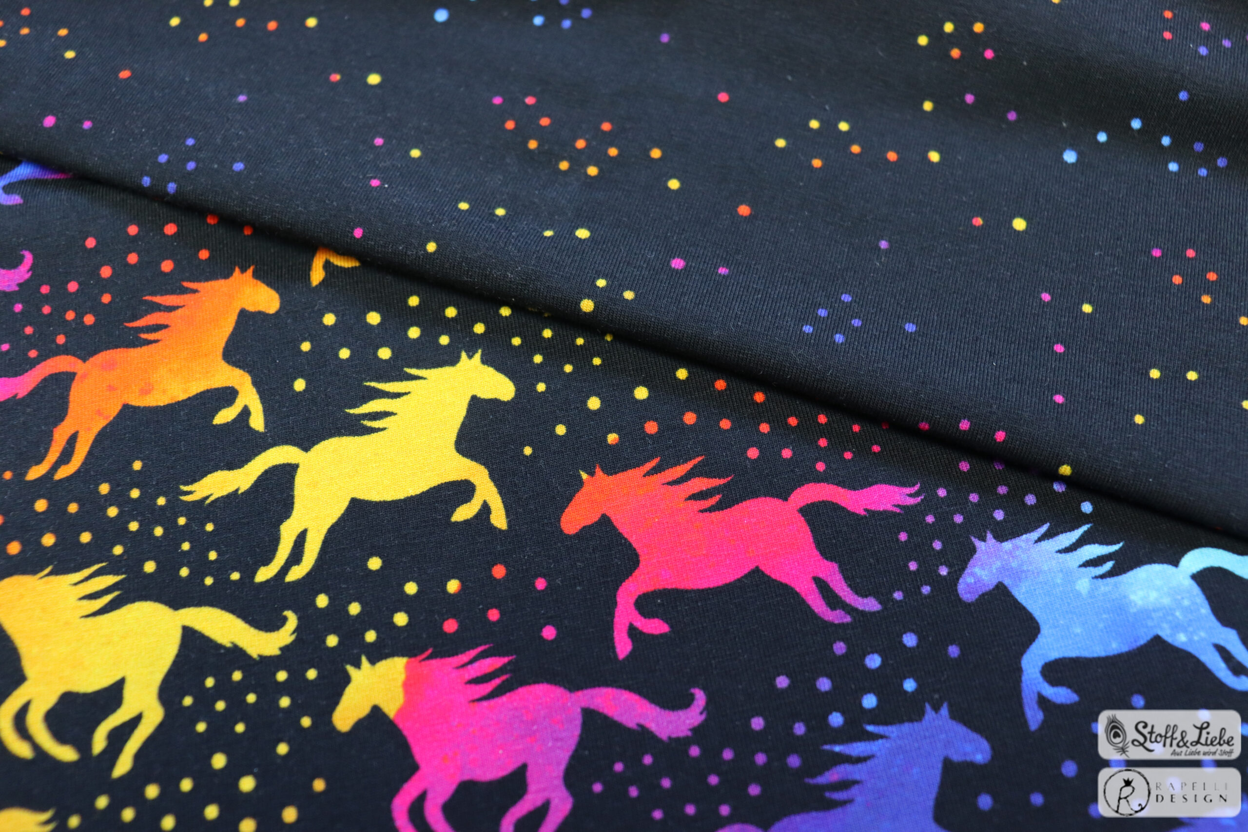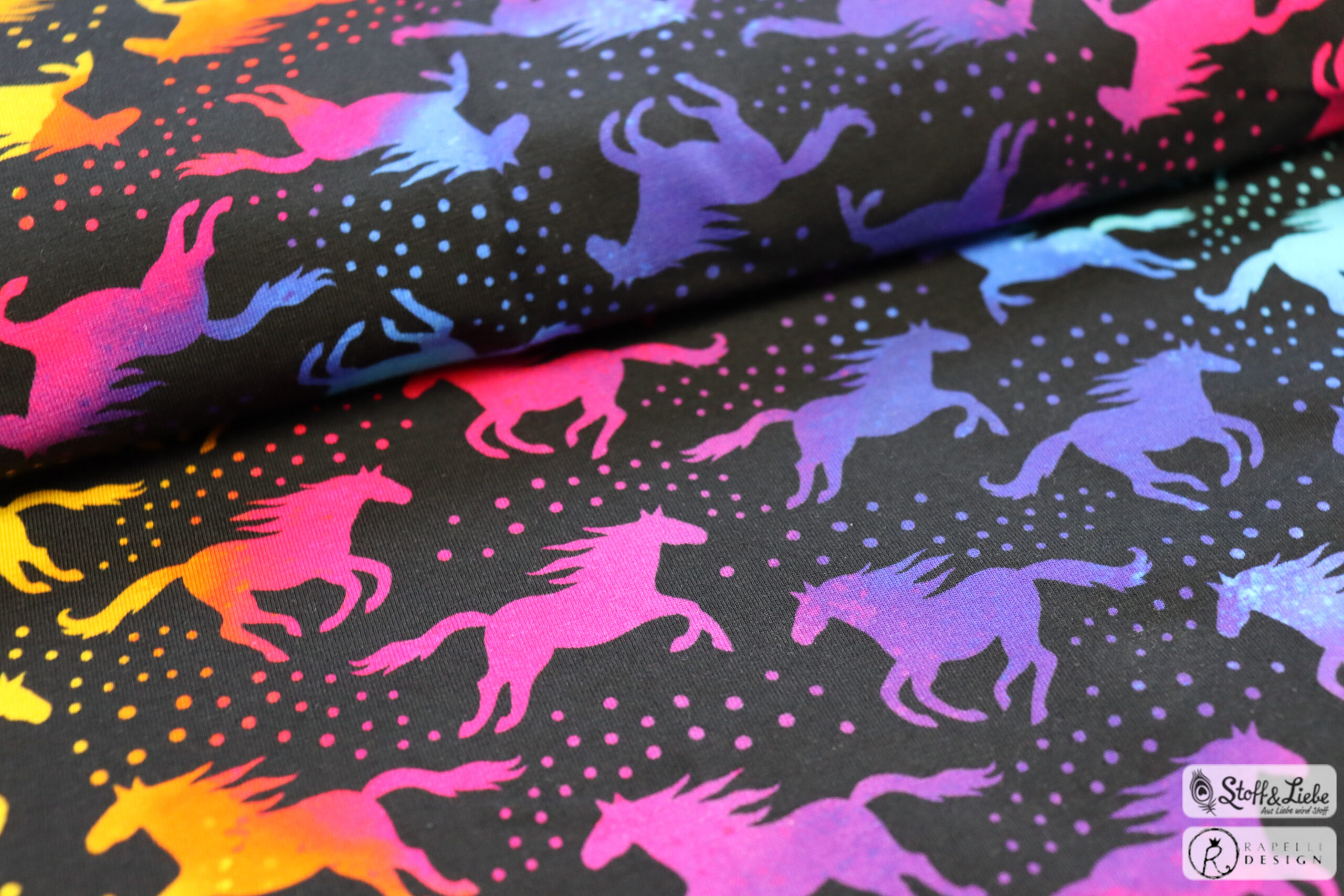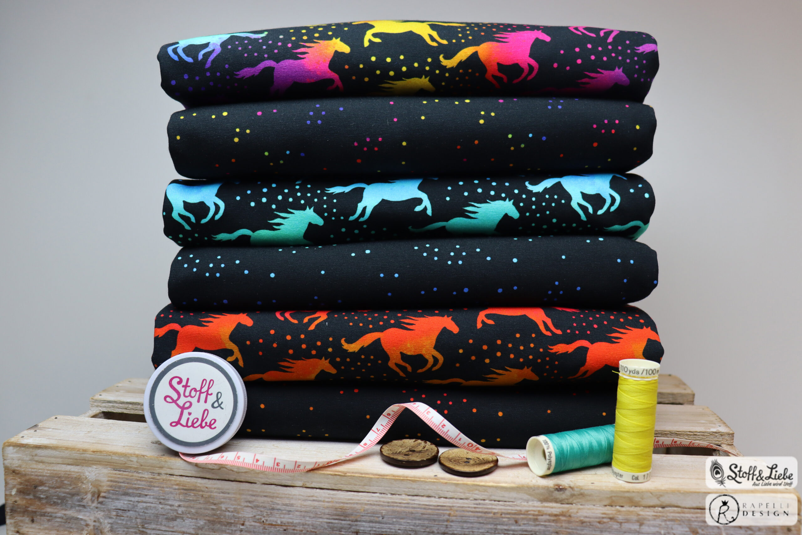 Die Farben und der vor allem dessen Verlauf im Aquarellstile machen sie zum richtigen Hingucker. Die Stoffe erhaltet Ihr auf Jersey und stammt wie alle vorherigen Dreamland Horses Kollektionen aus der Feder von Rapelli Design.